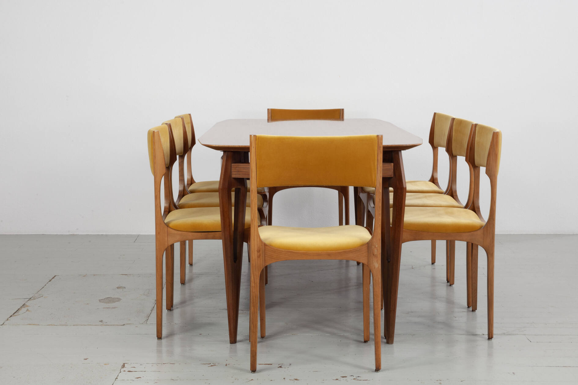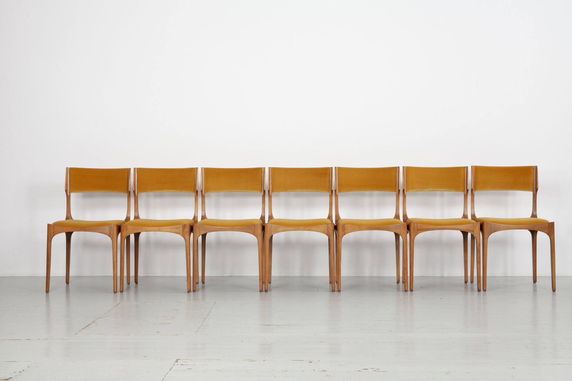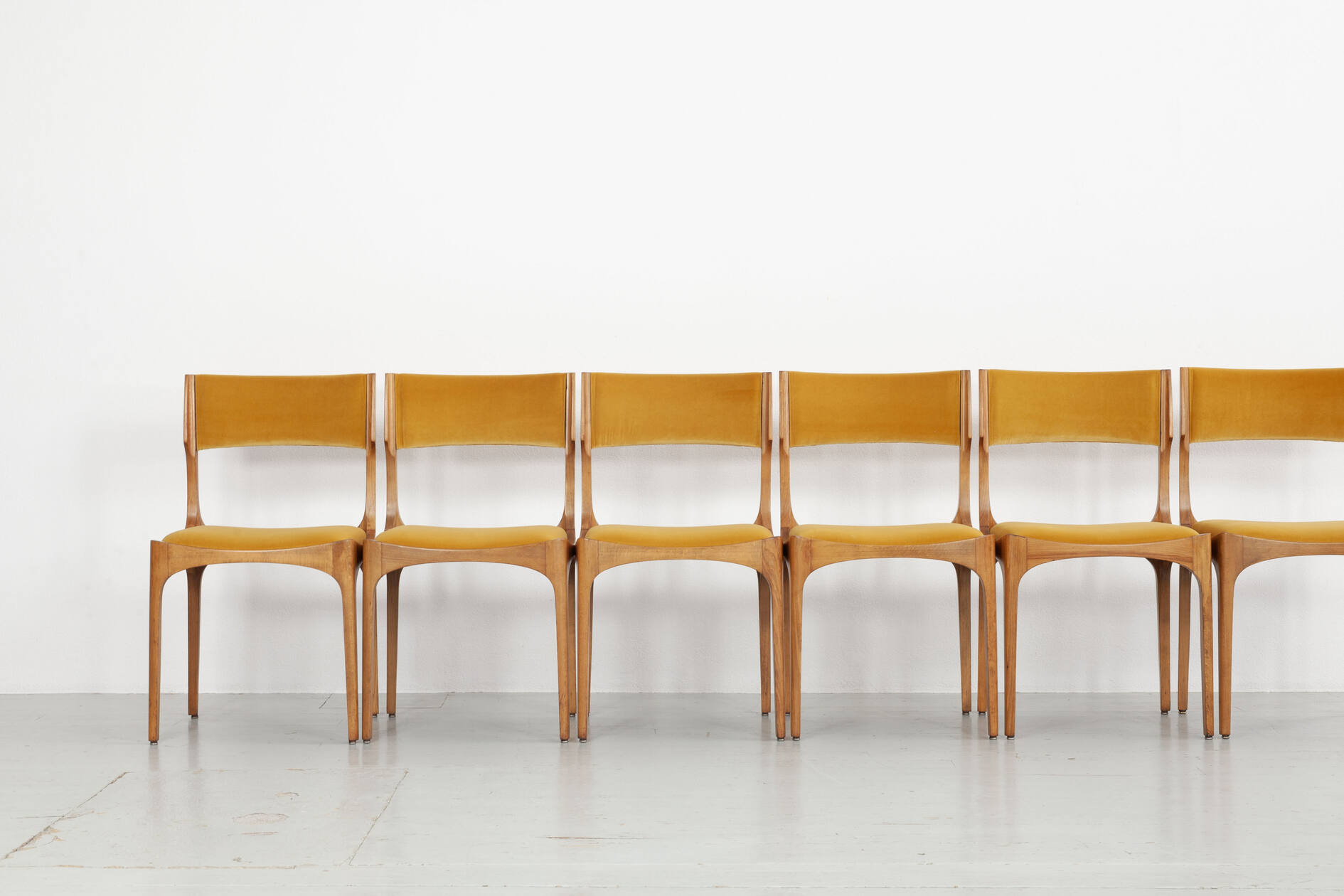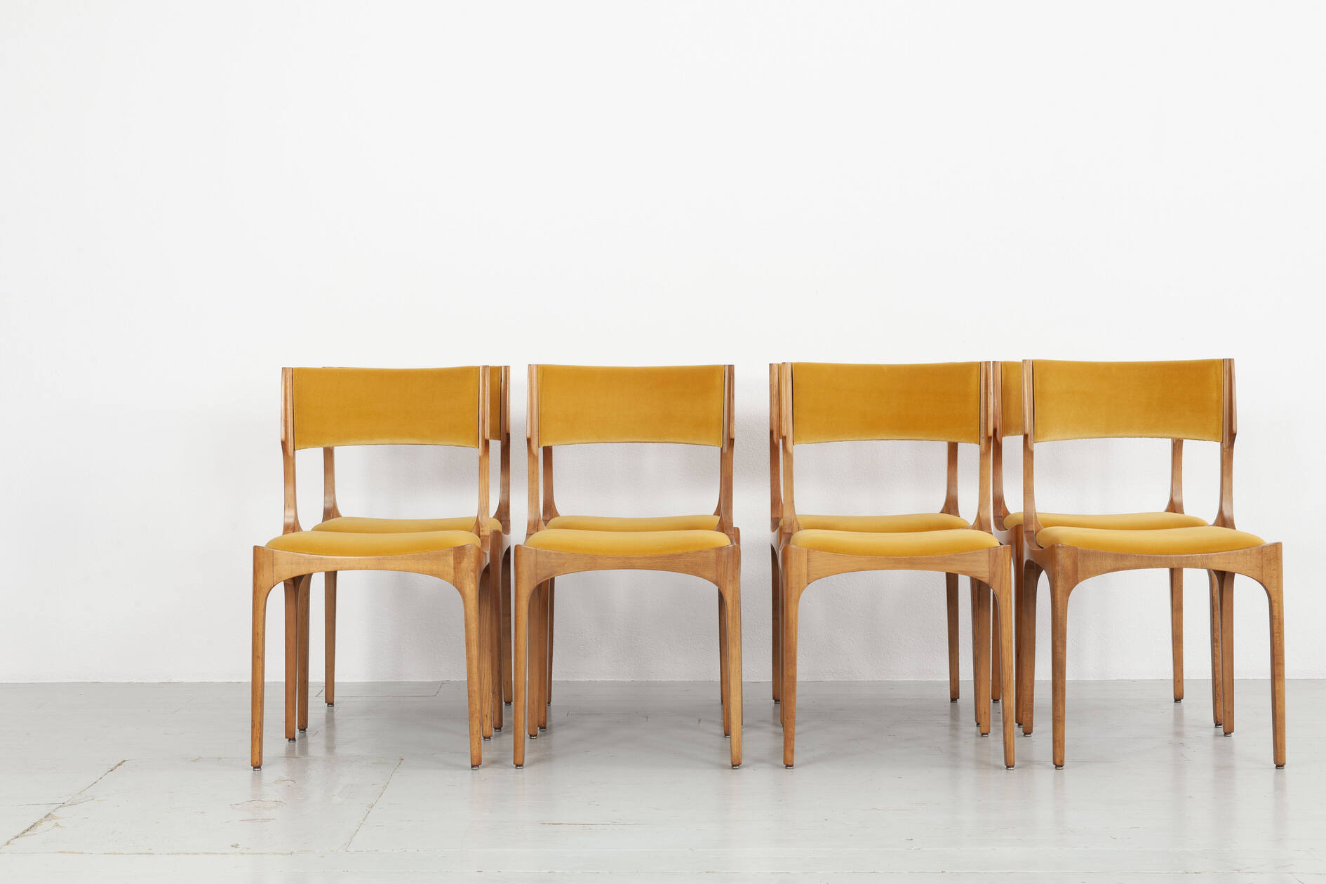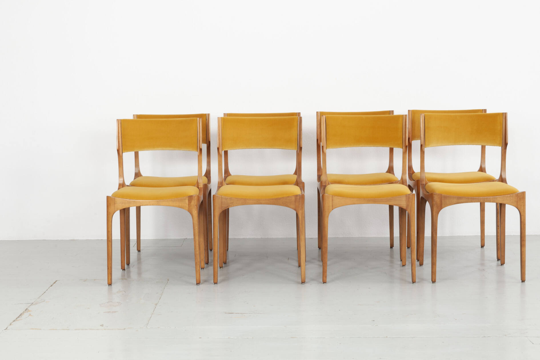 Elegant set of 8 dining chairs, designed by Giuseppe Gibelli for Sormani, 1963. Frame made of walnut-stained beechwood, newly upholstered with mustard-colored velvet.