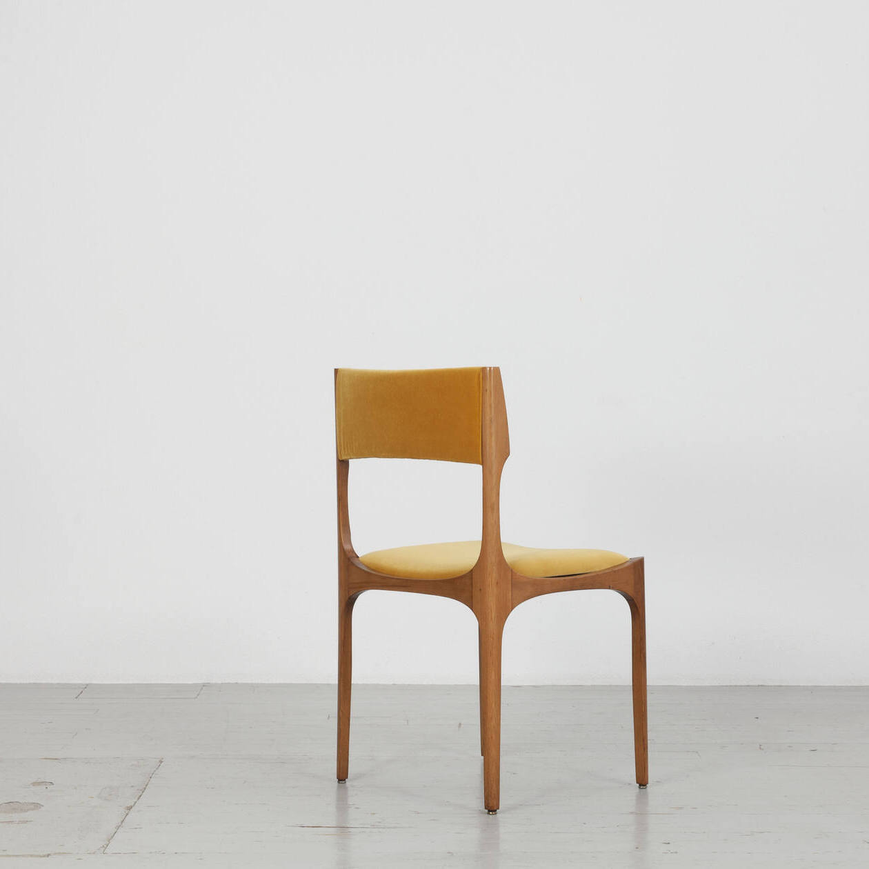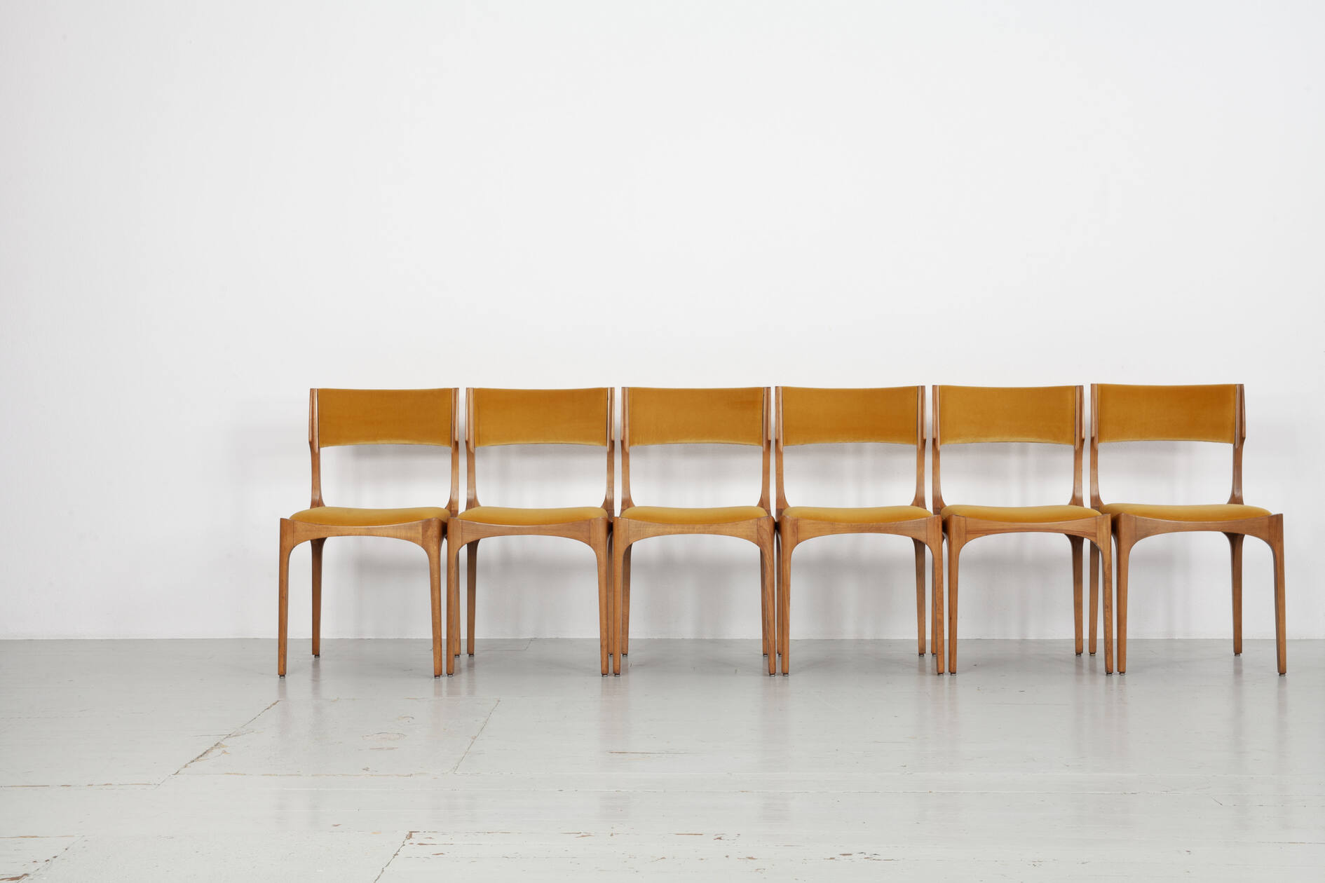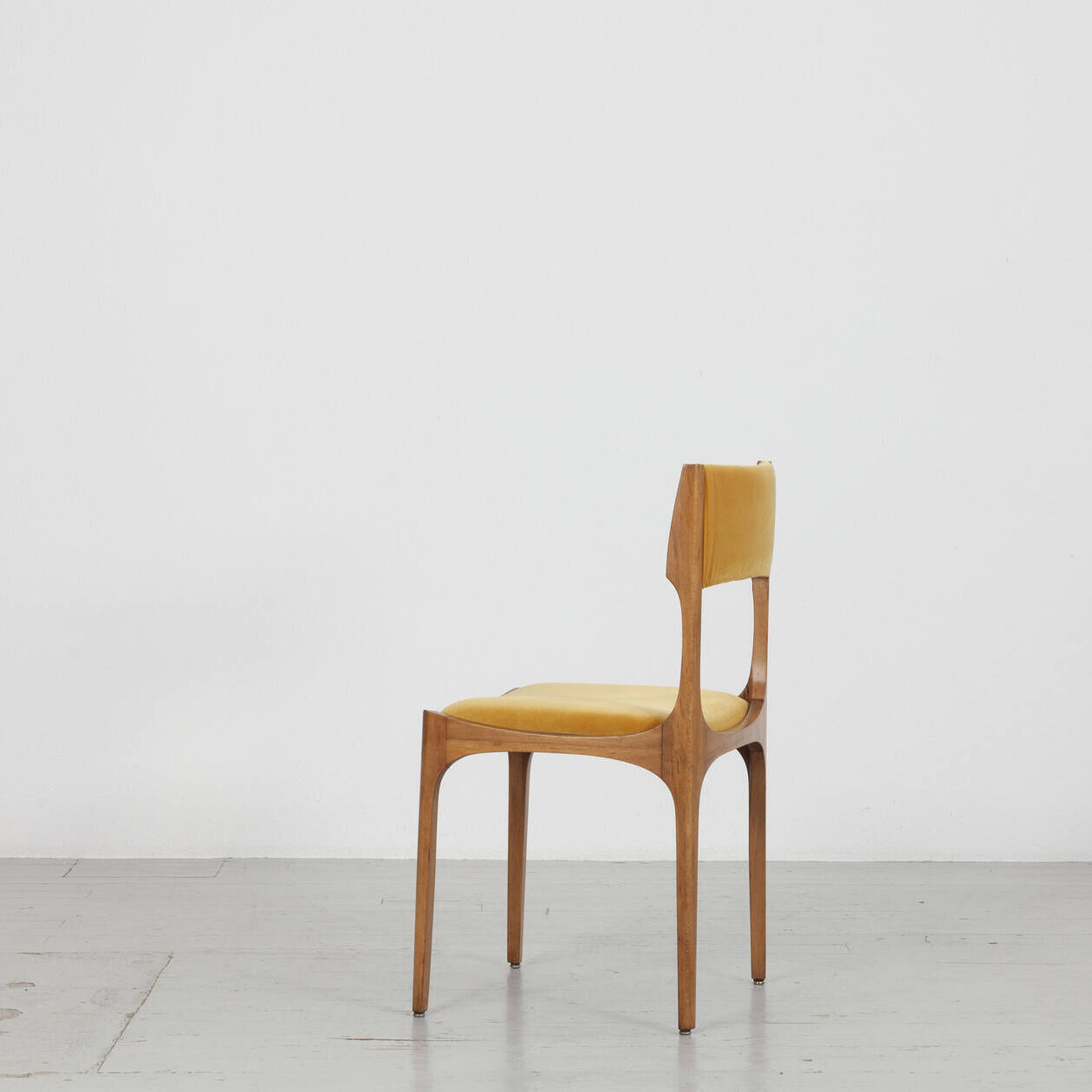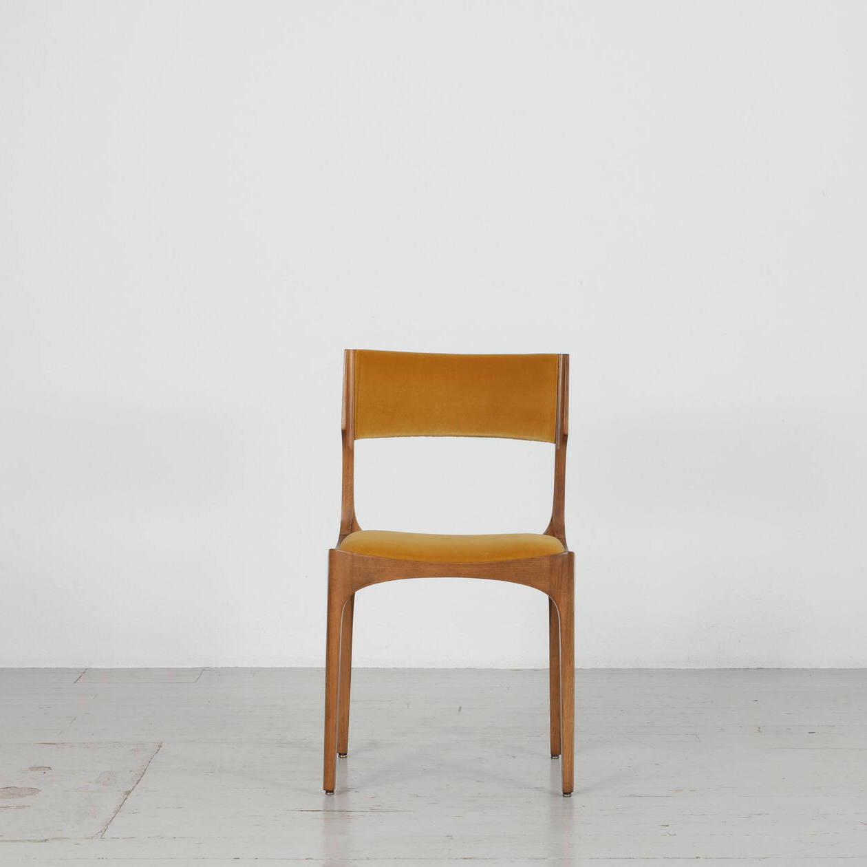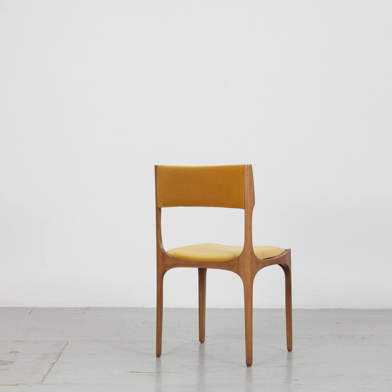 Elegant set of 8 dining chairs, designed by Giuseppe Gibelli for Sormani, 1963. Frame made of walnut-stained beechwood, newly upholstered with mustard-colored velvet.