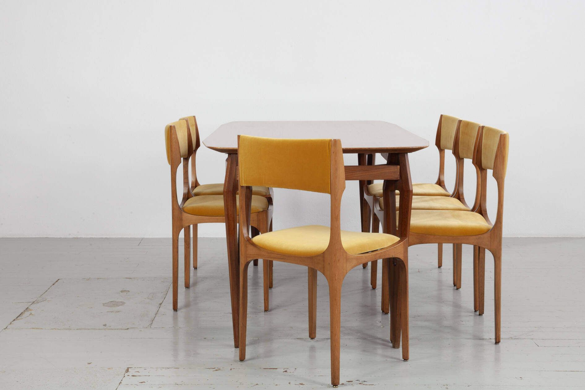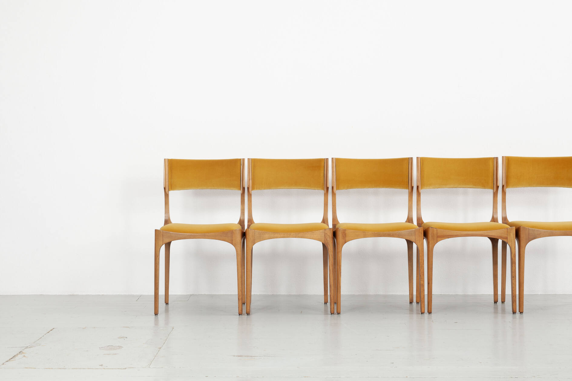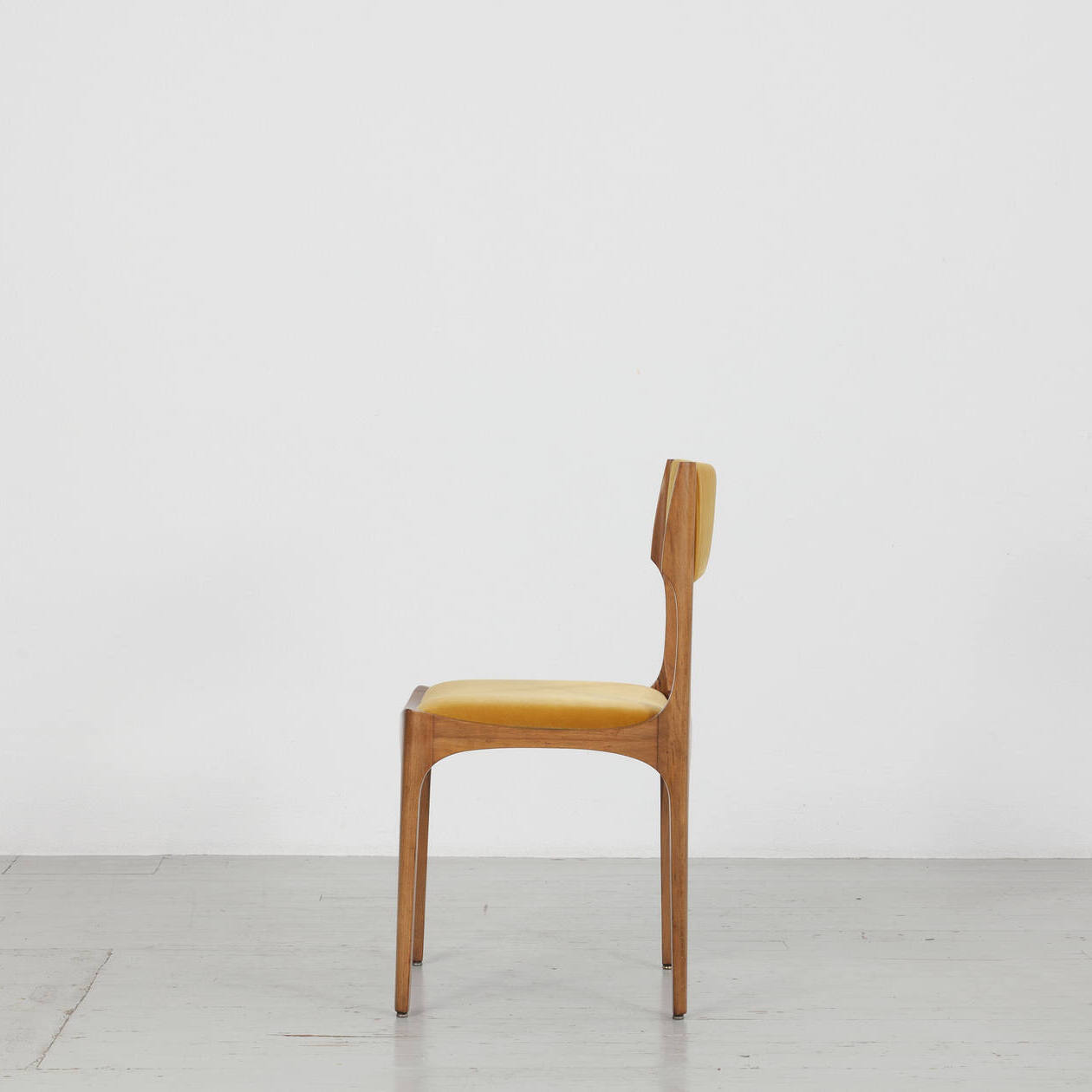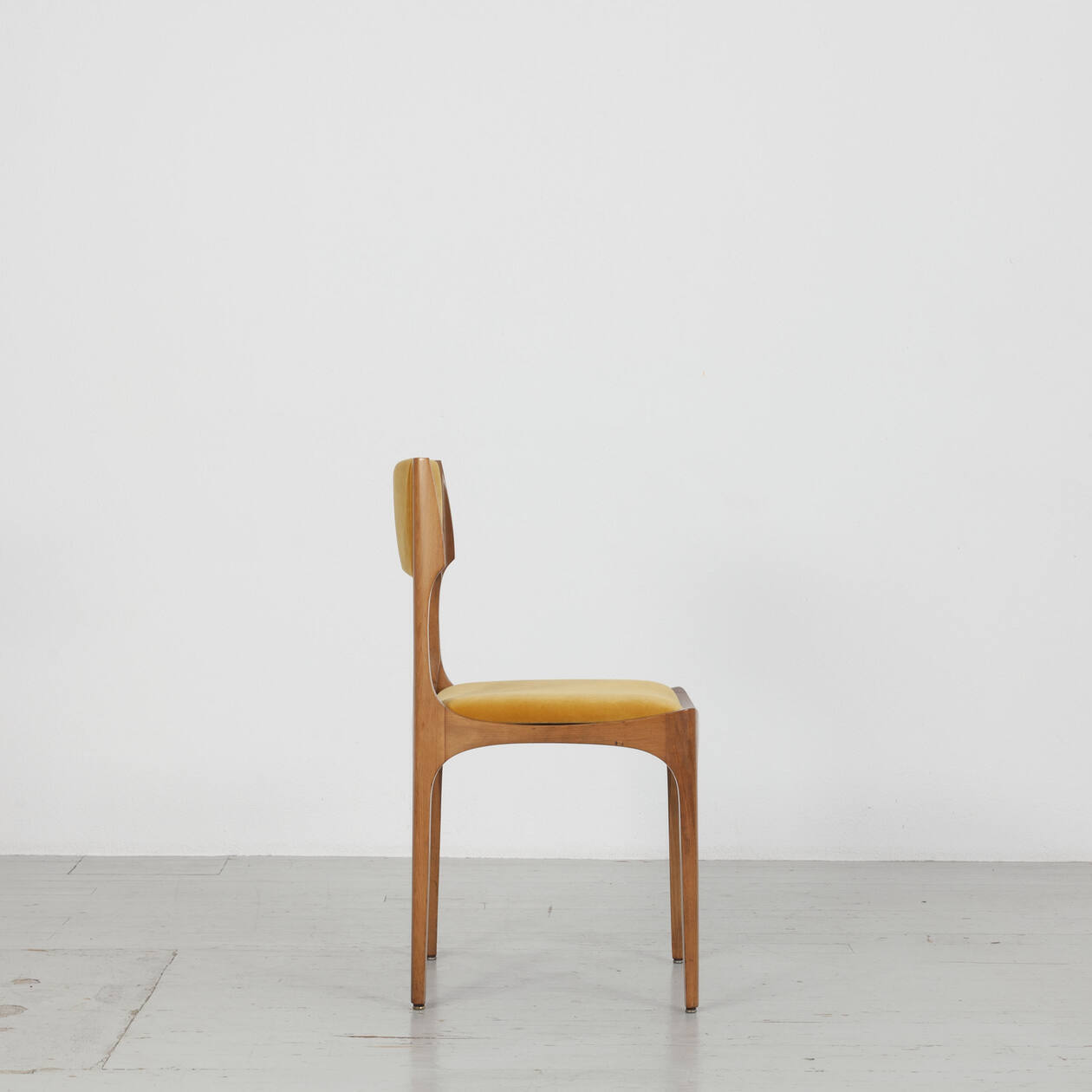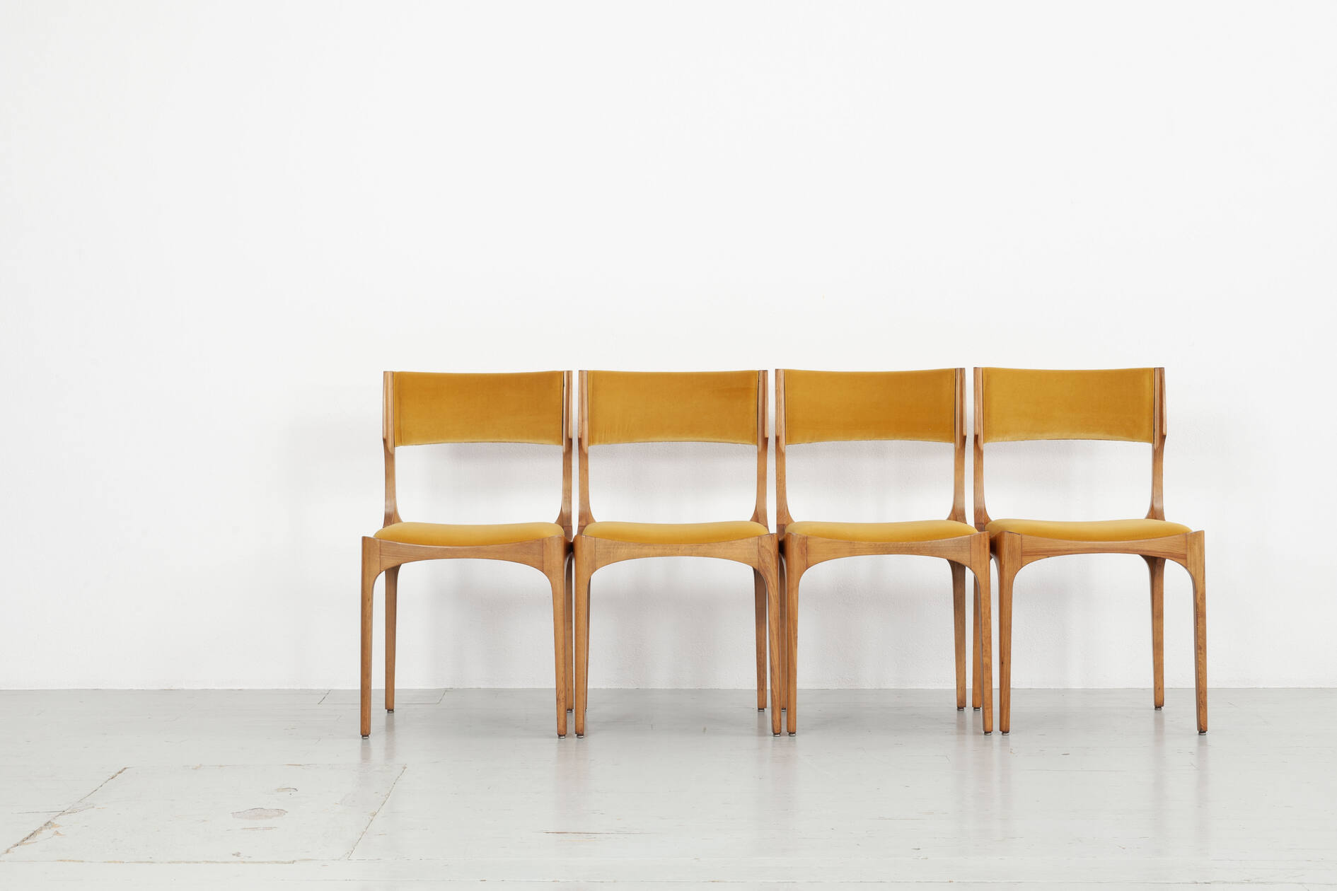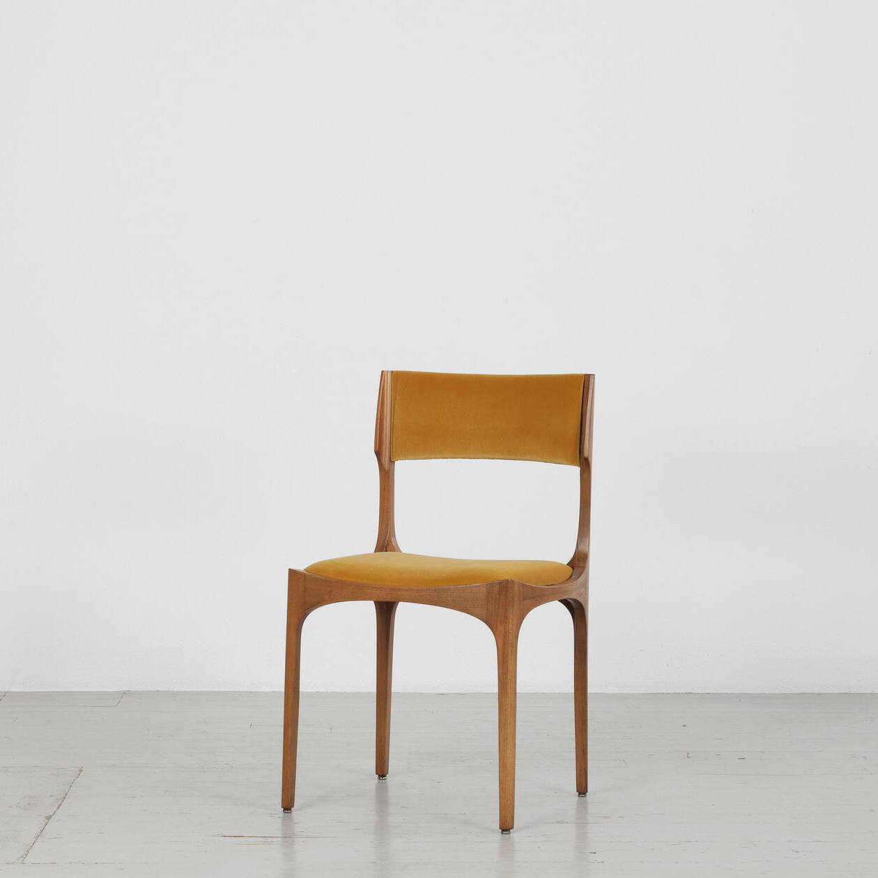 Elegant set of 8 dining chairs, designed by Giuseppe Gibelli for Sormani, 1963. Frame made of walnut-stained beechwood, newly upholstered with mustard-colored velvet.
