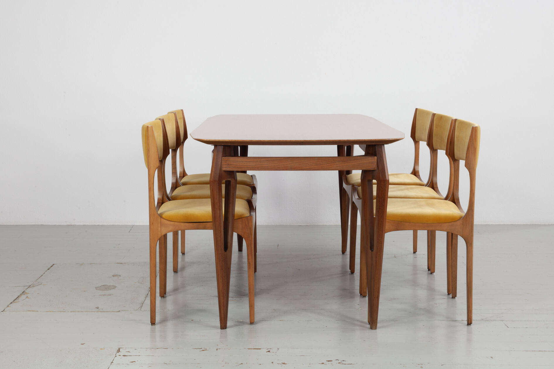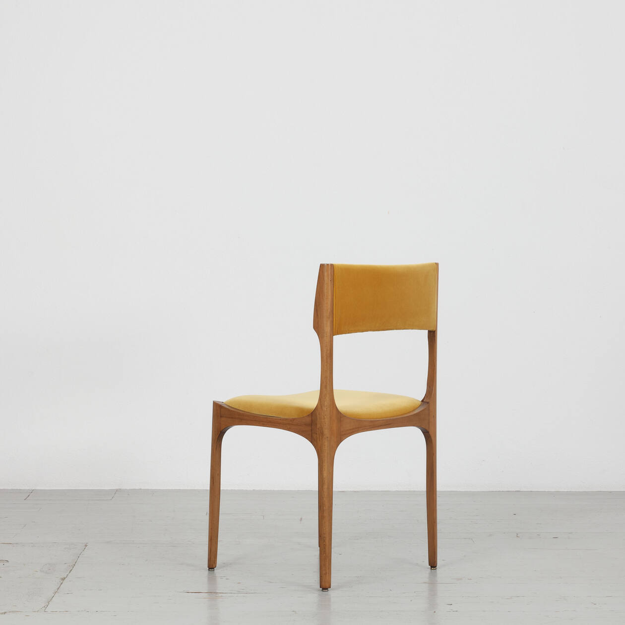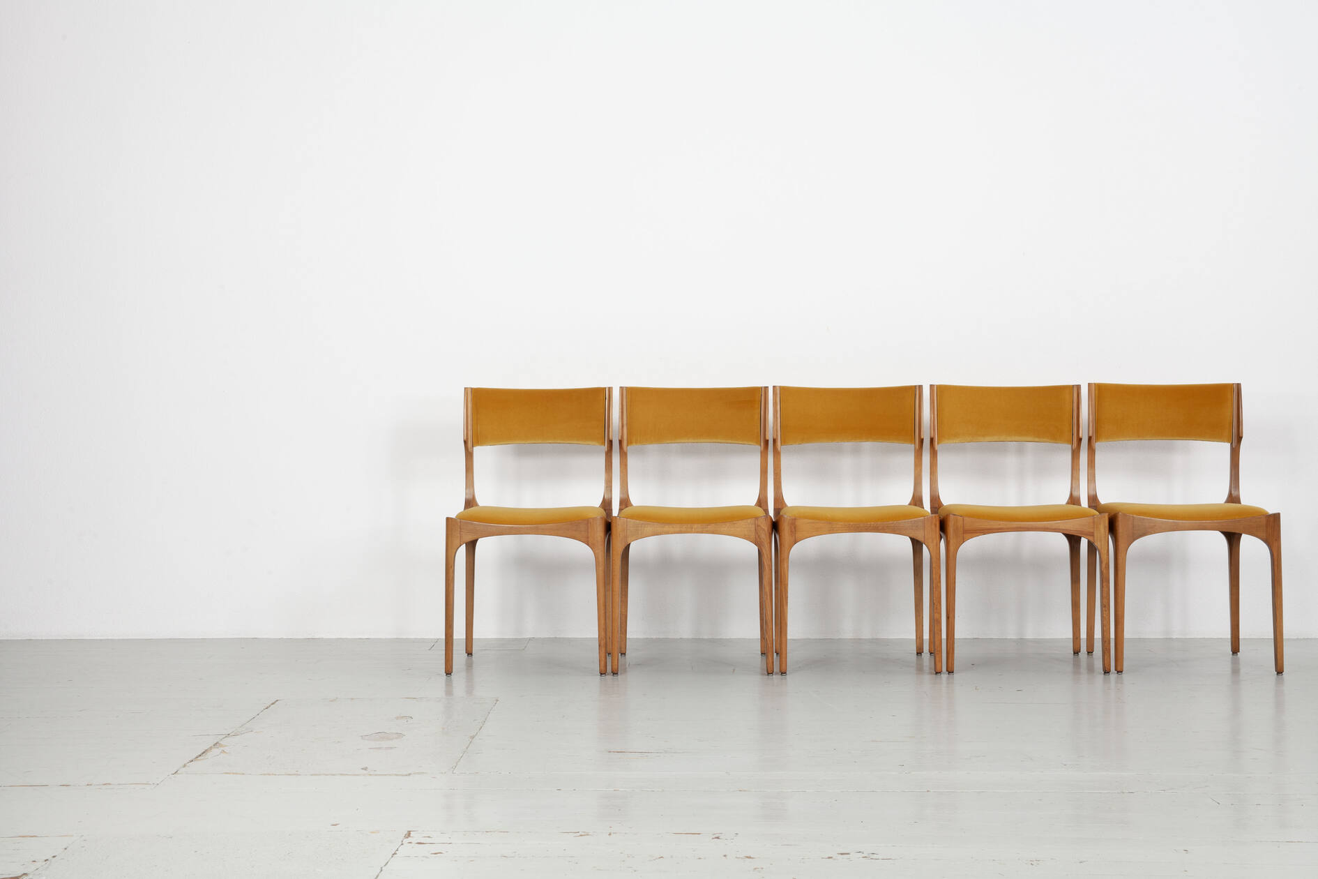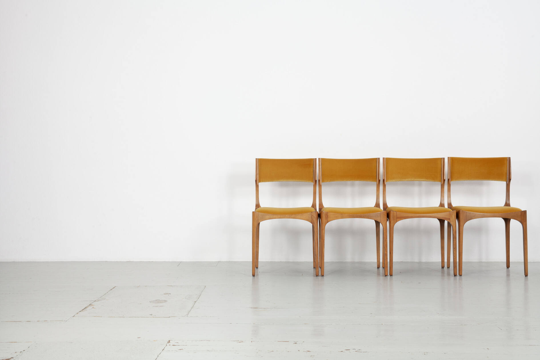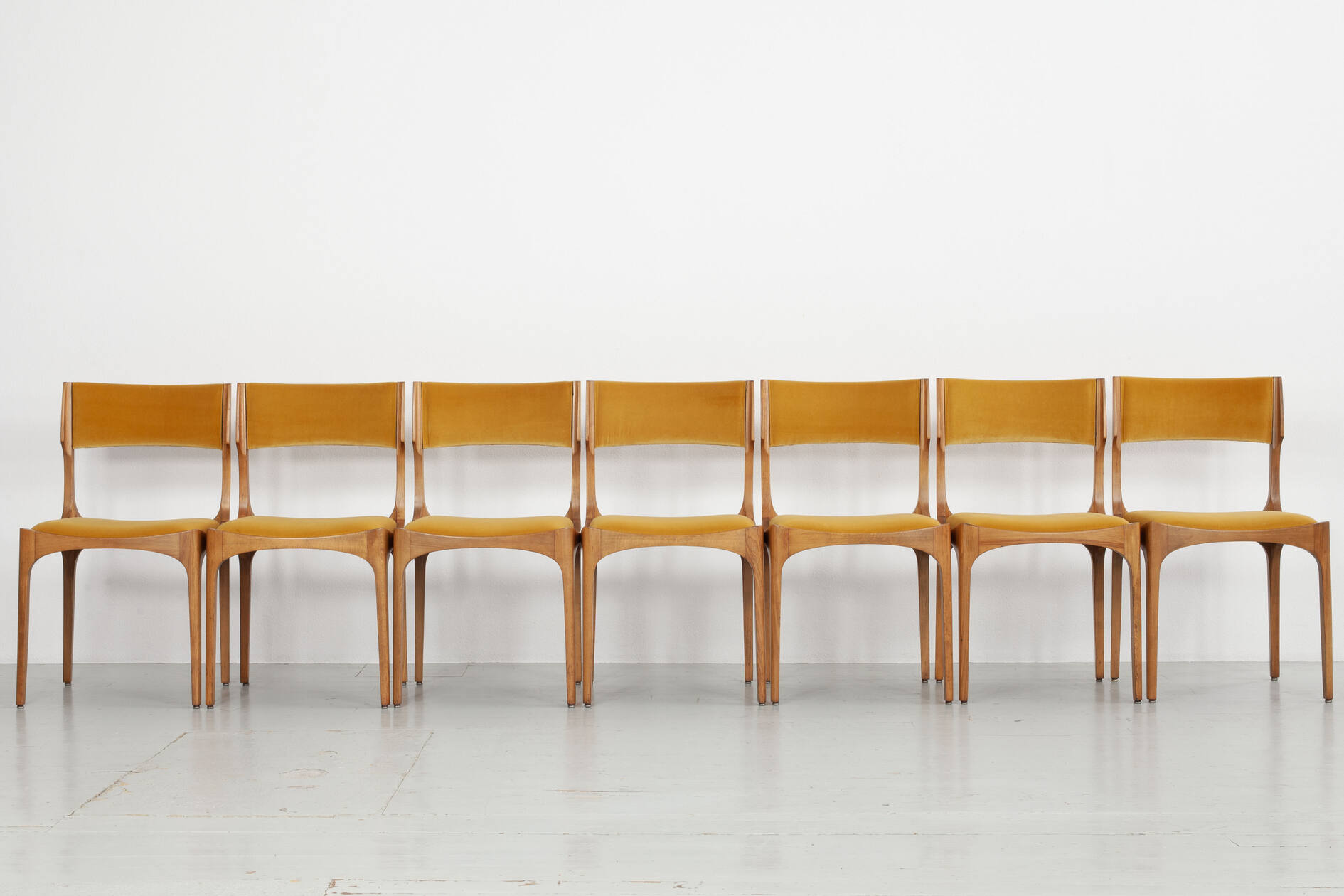 Elegant set of 8 dining chairs, designed by Giuseppe Gibelli for Sormani, 1963. Frame made of walnut-stained beechwood, newly upholstered with mustard-colored velvet.