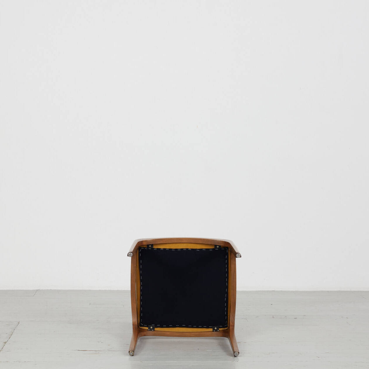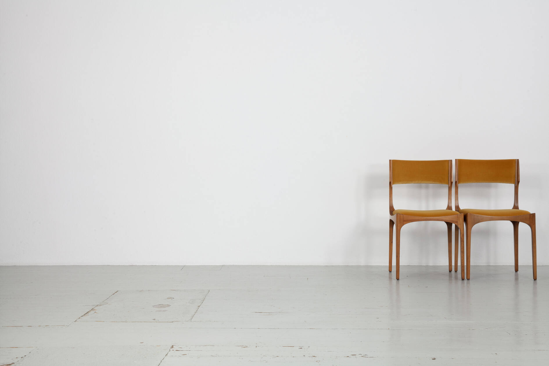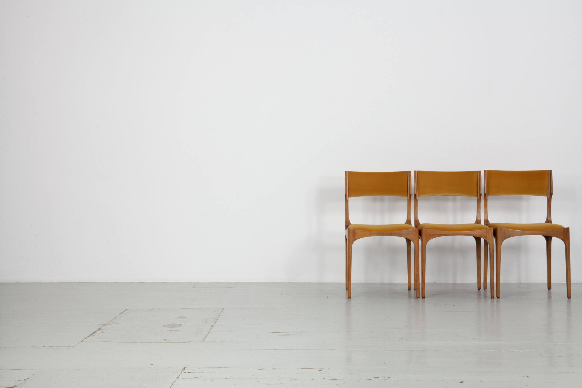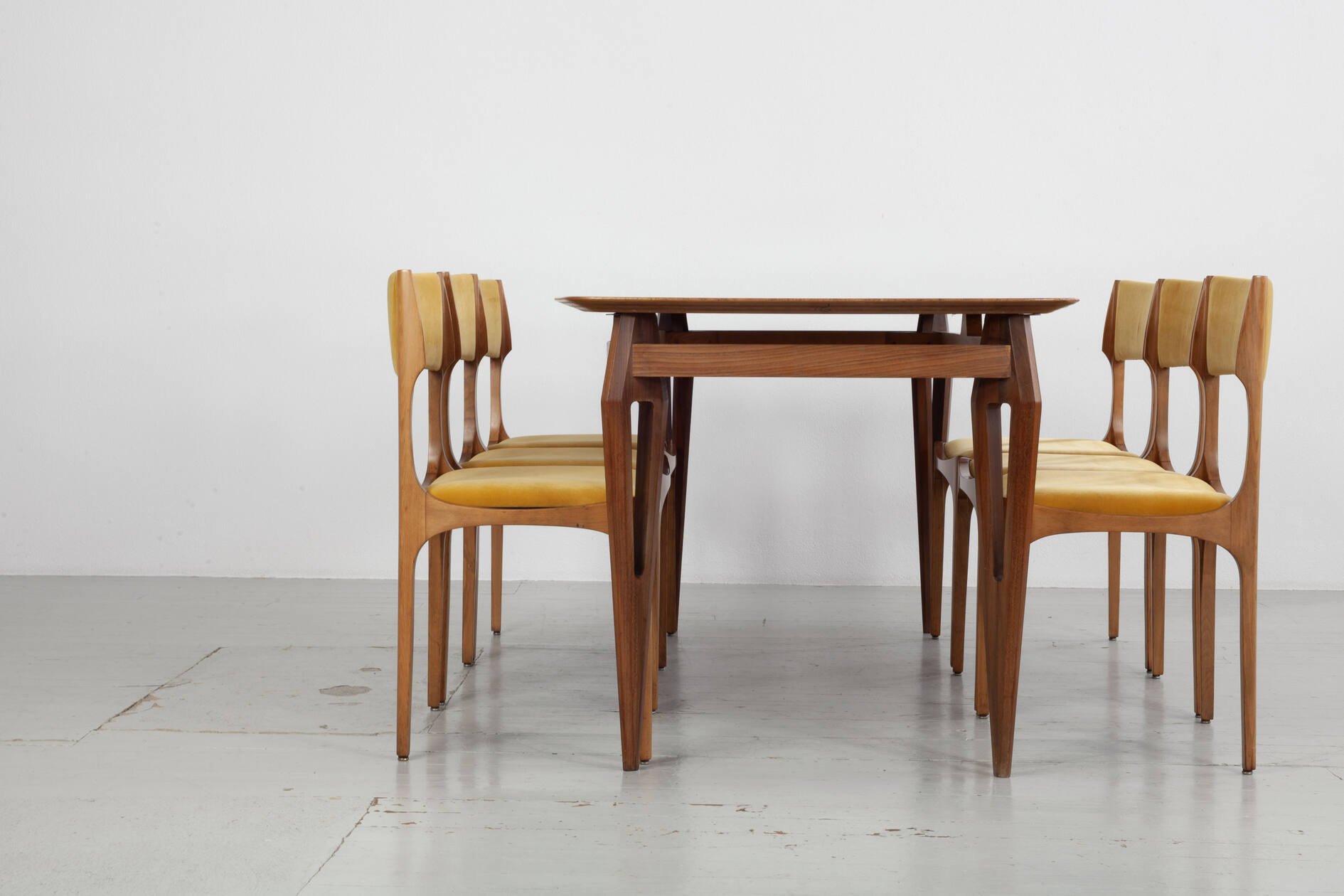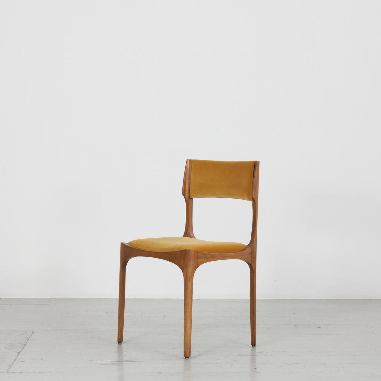 Elegant set of 8 dining chairs, designed by Giuseppe Gibelli for Sormani, 1963. Frame made of walnut-stained beechwood, newly upholstered with mustard-colored velvet.