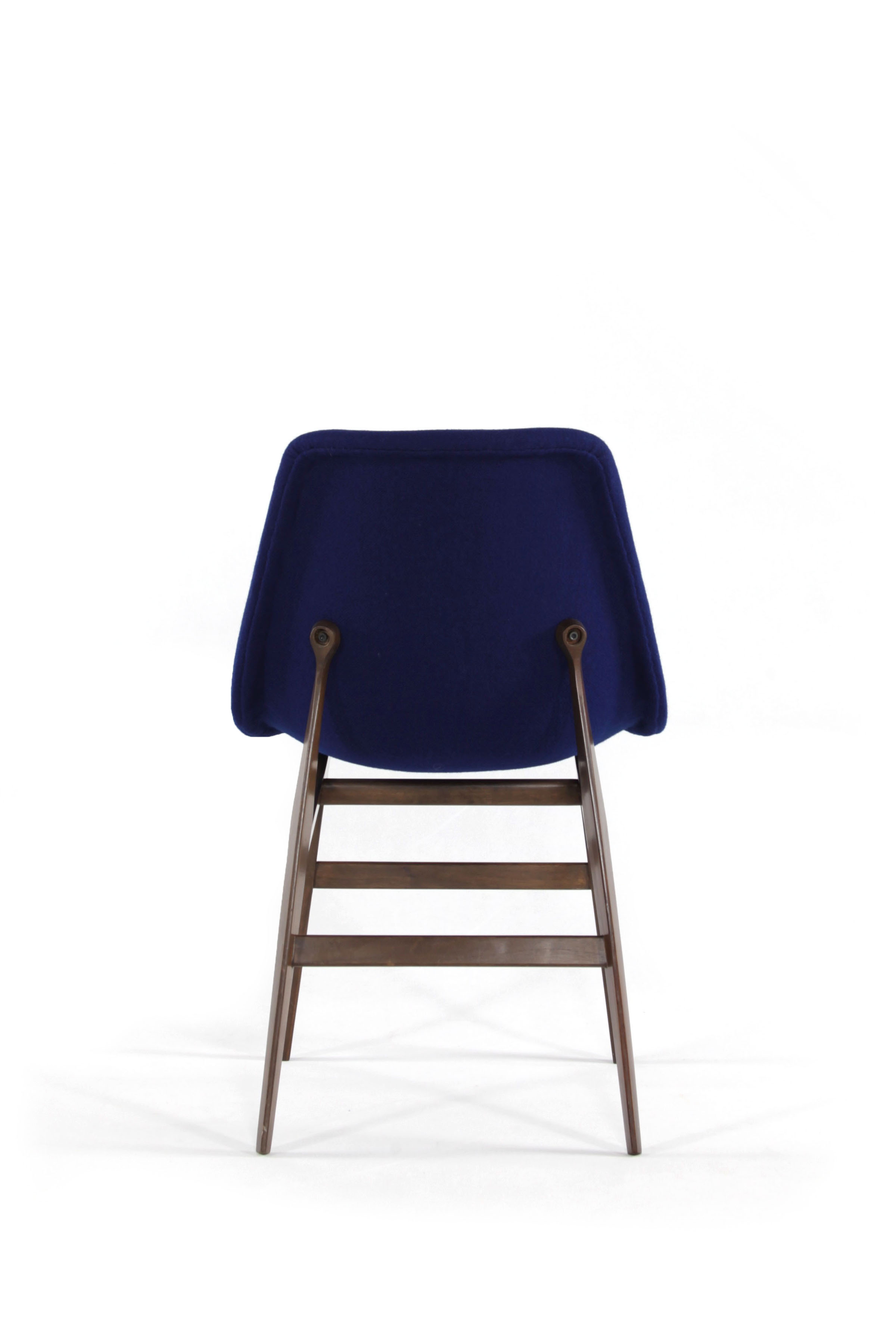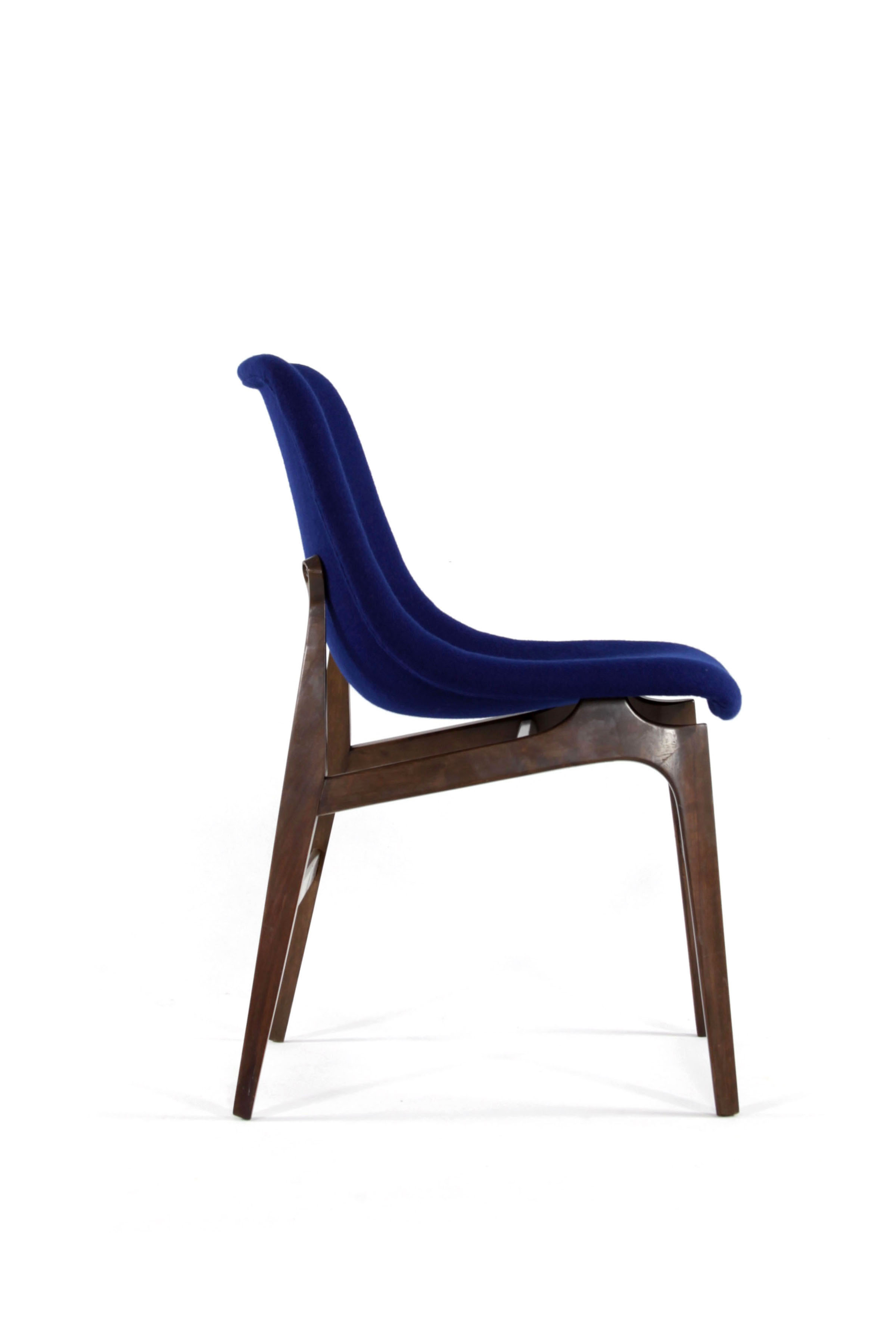 This set of six chairs was made in Italy in the 1960s and marketed by the Busnelli di Meda company. The sturdy teak chair frames show slight signs of wear. The seat consists of a fibreglass shell upholstered in foam with a dark blue cover. The upholstery of the chairs has been reupholstered with fabric from Kvadrat (Tonus 4 0210).