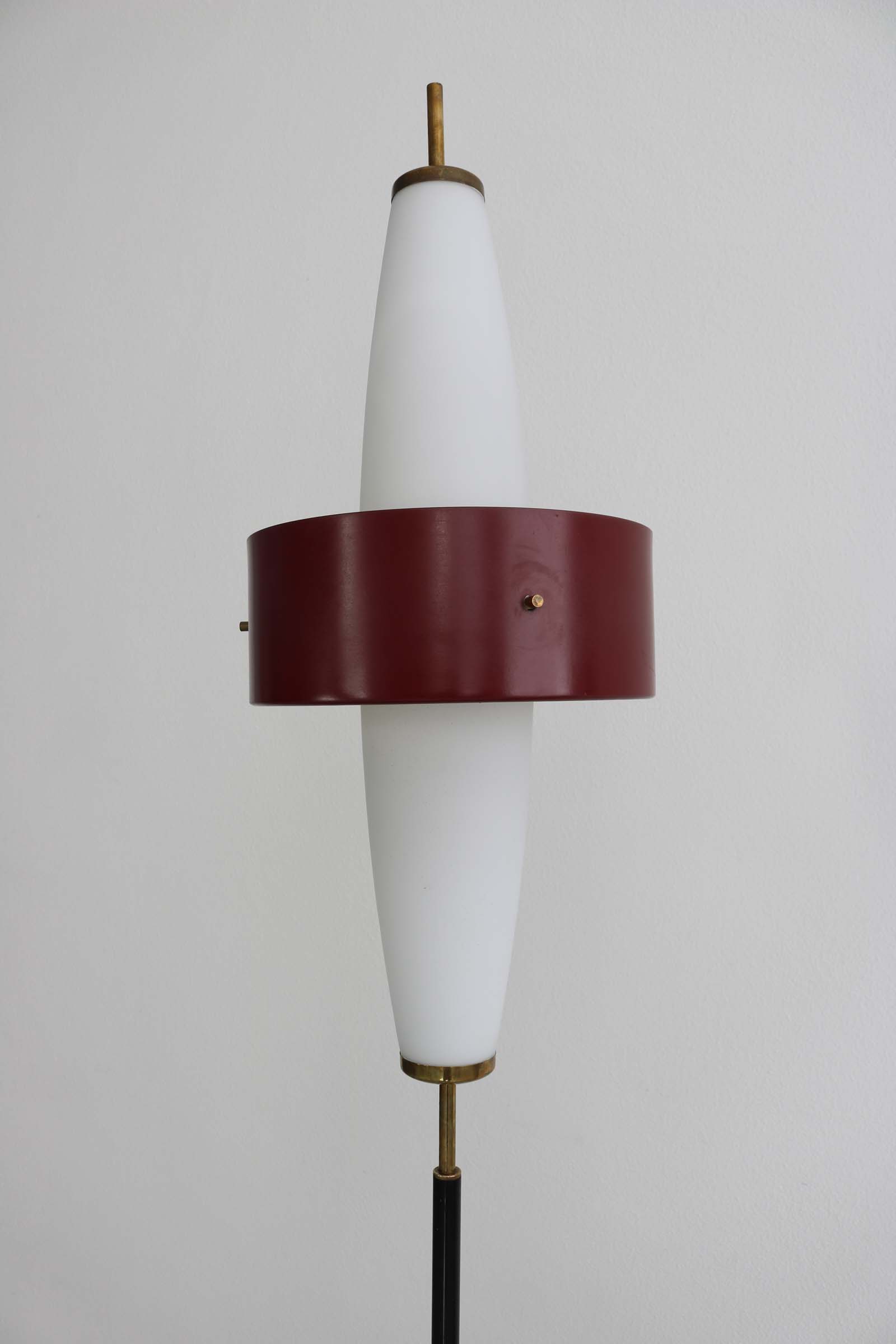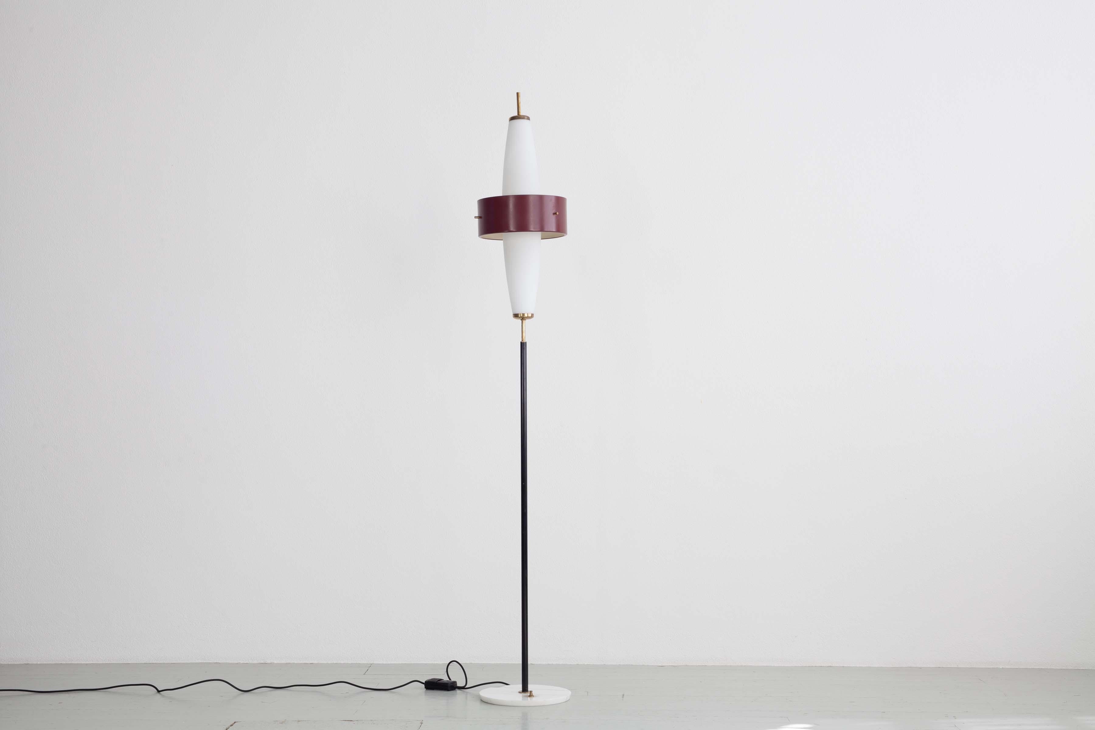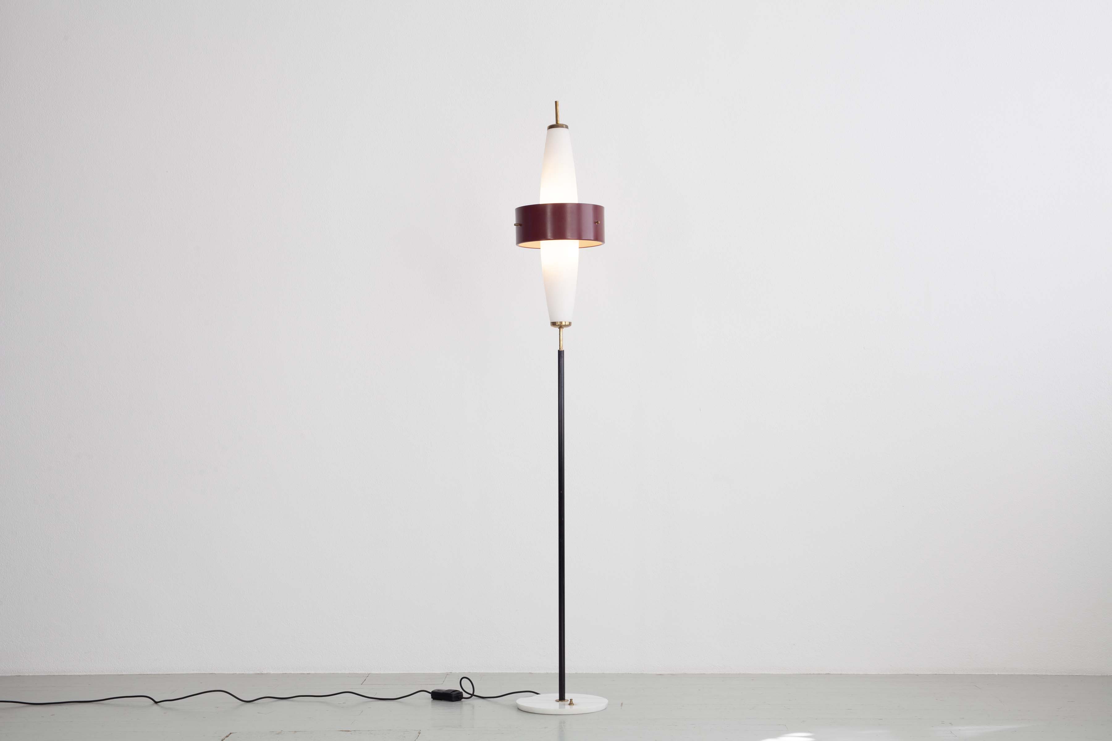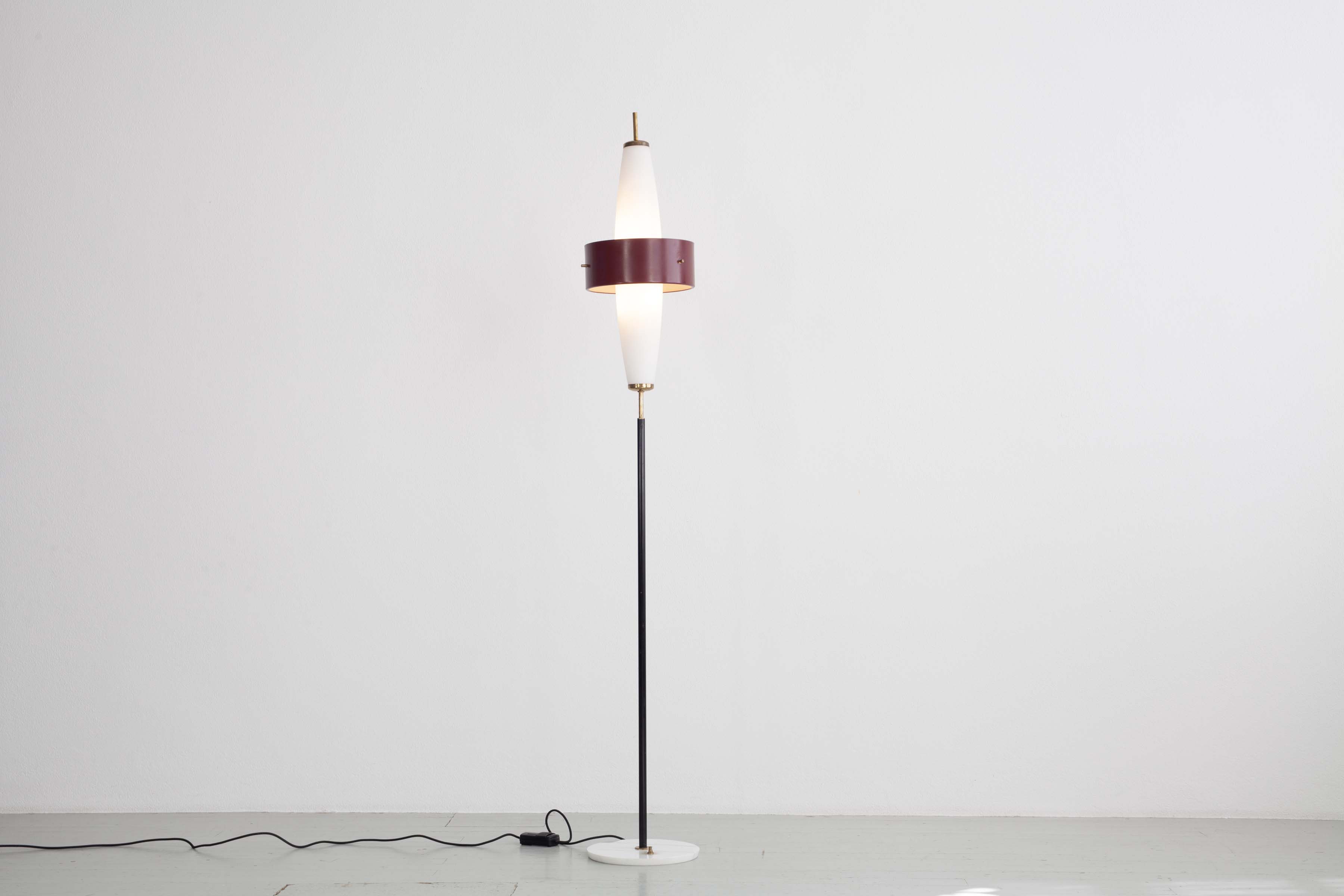 Elegant Italian floor lamp “Mod. 6005” by Angelo Brotto for Stilnovo, c.1960. Marble base with black-lacquered iron stem and brass accents; the opaline glass shade encircled by a ring of red-lacquered aluminium.