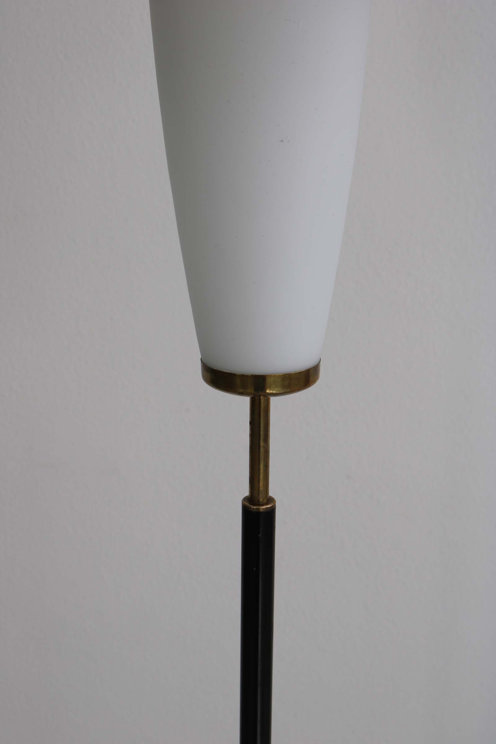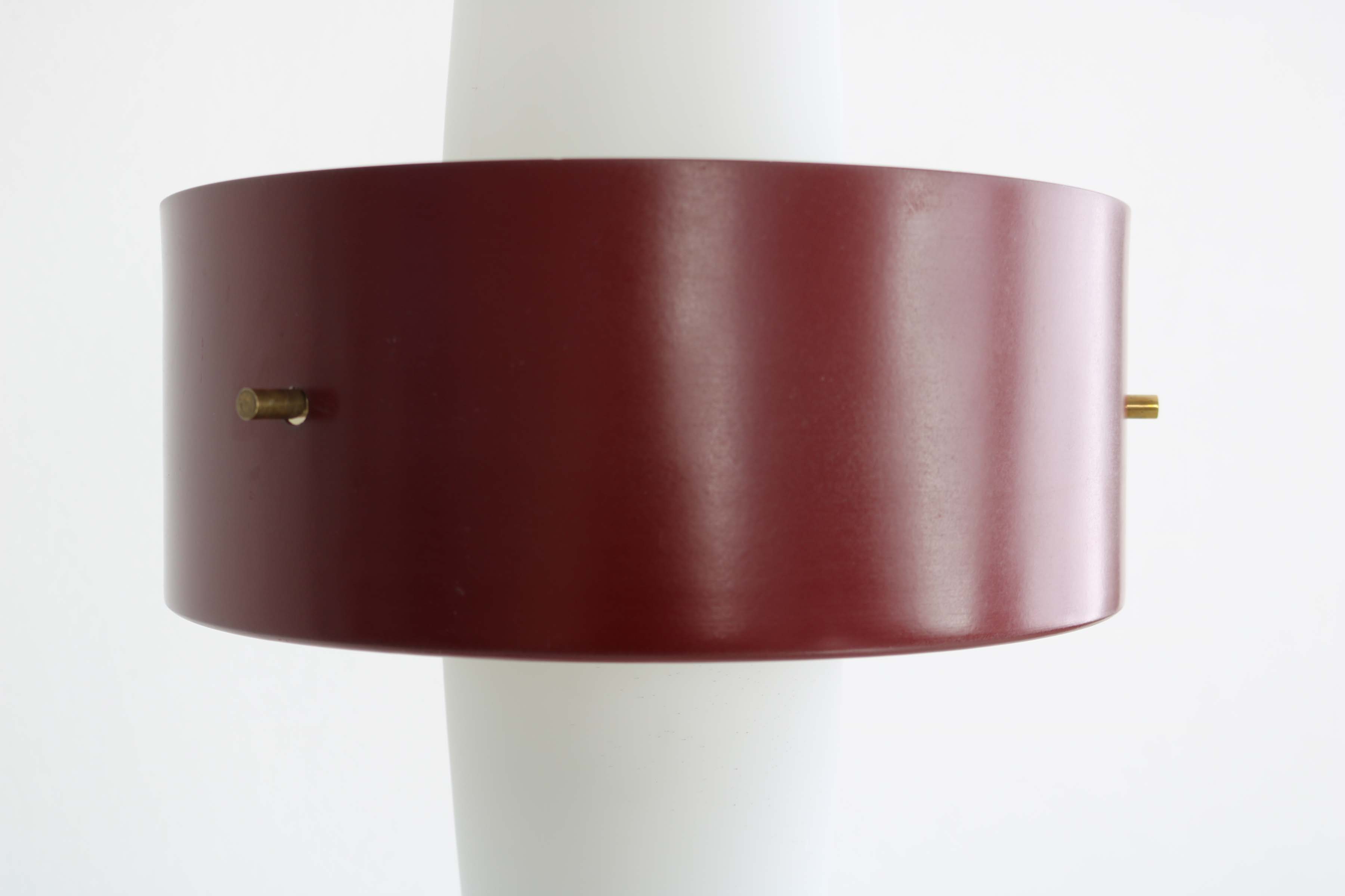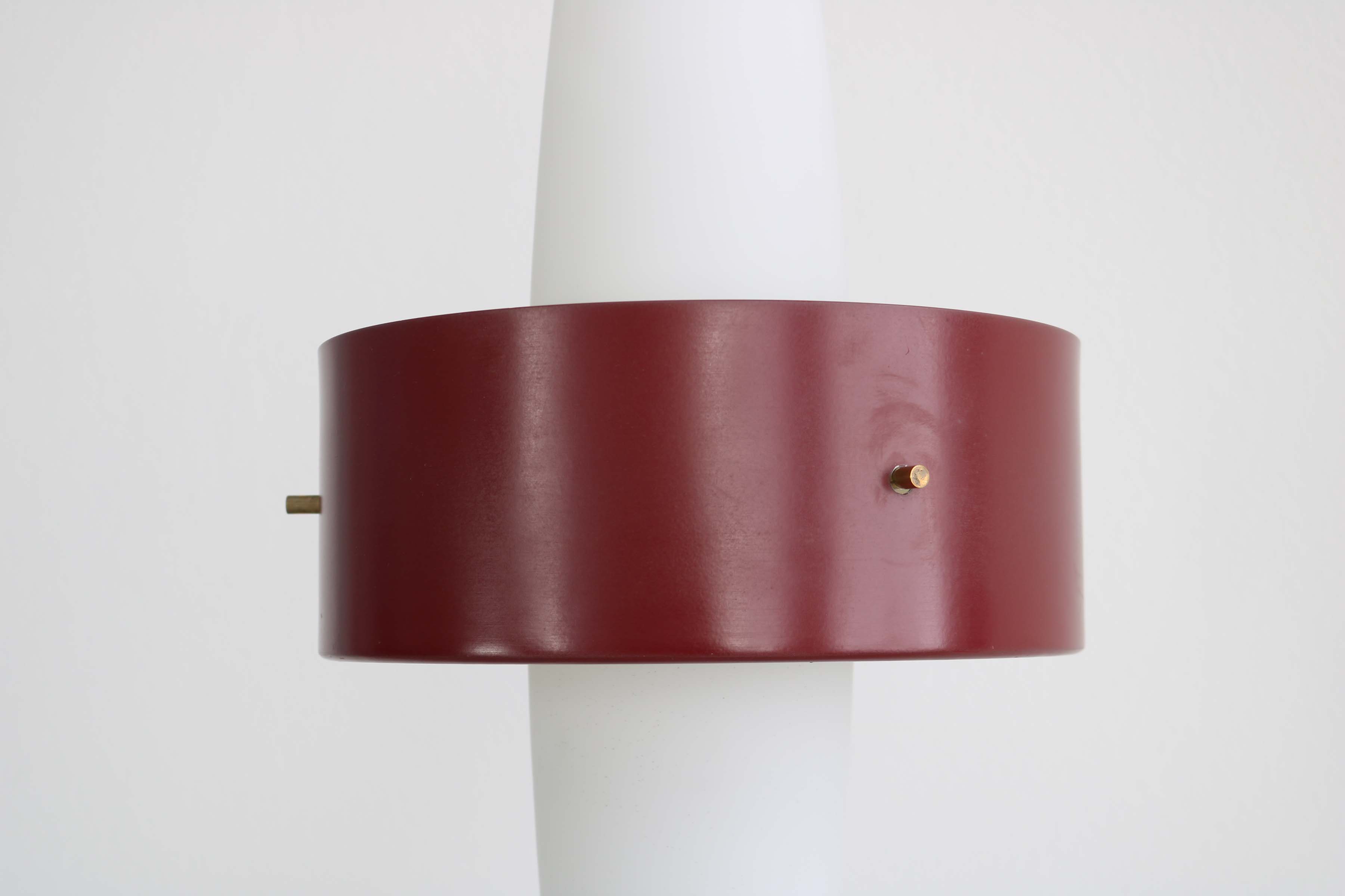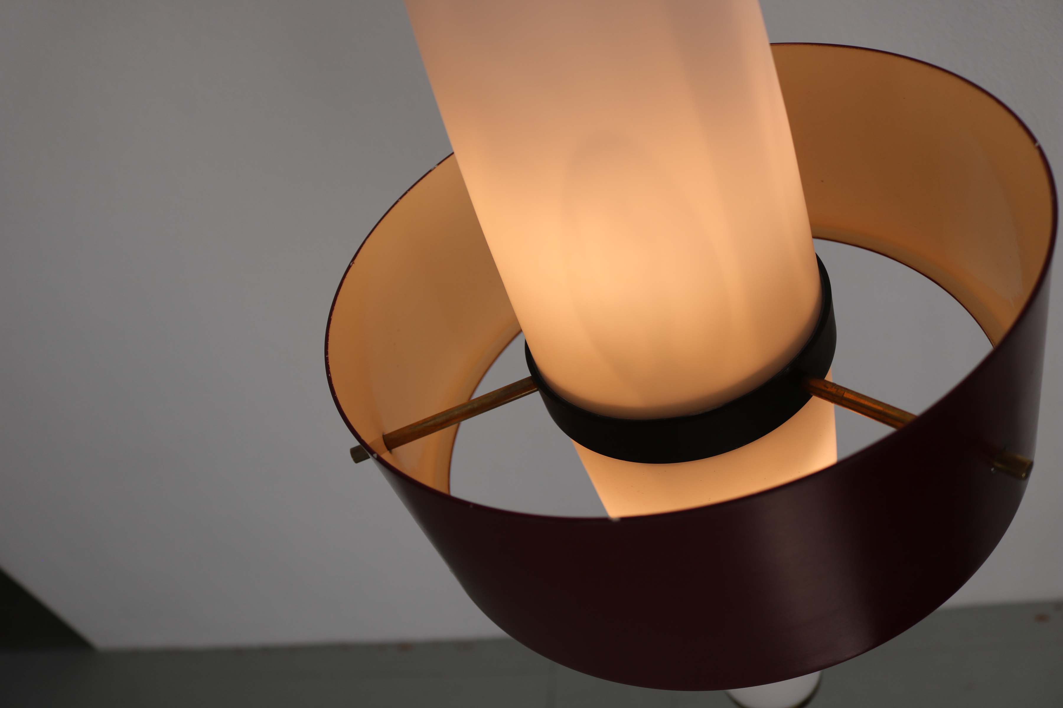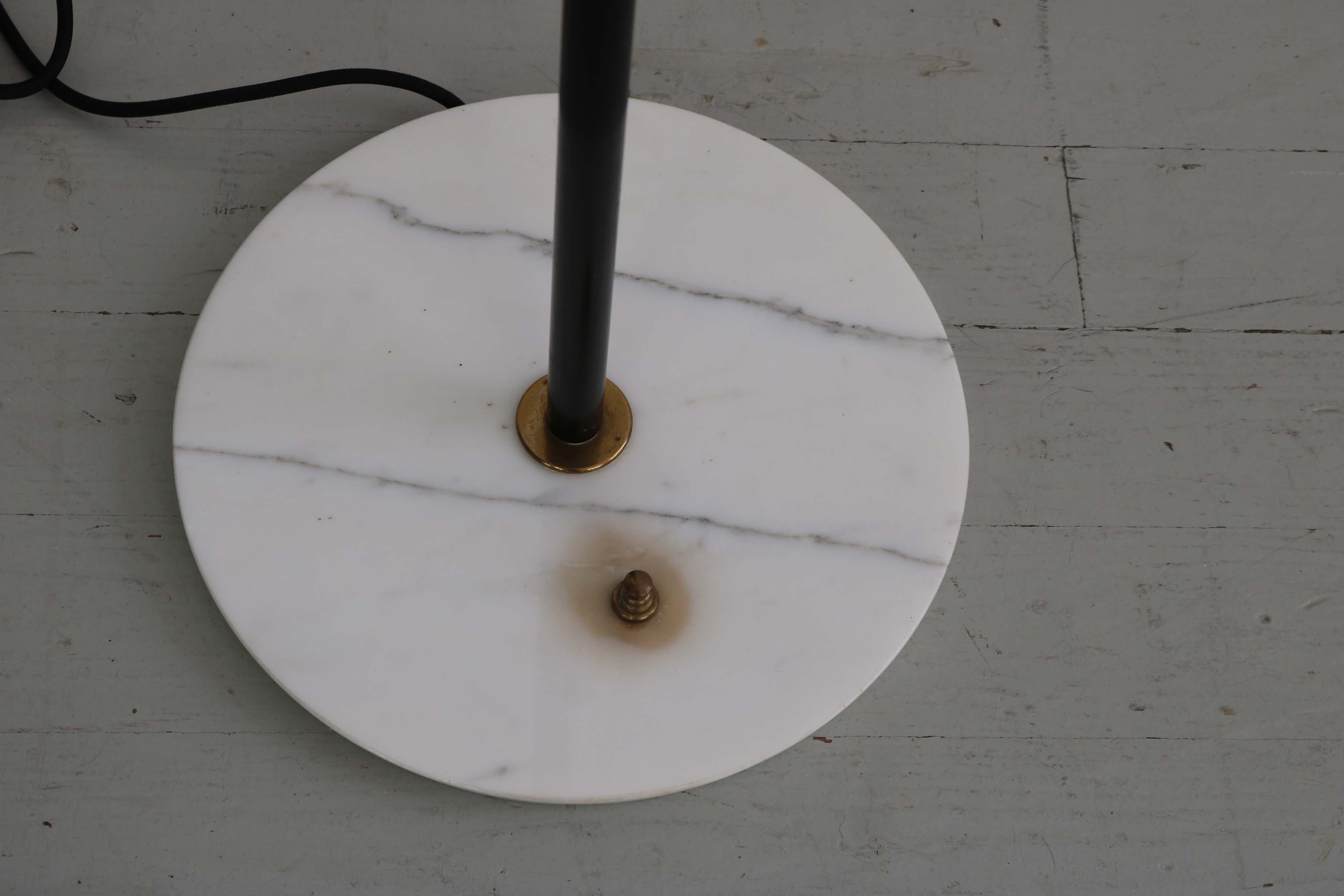 Elegant Italian floor lamp “Mod. 6005” by Angelo Brotto for Stilnovo, c.1960. Marble base with black-lacquered iron stem and brass accents; the opaline glass shade encircled by a ring of red-lacquered aluminium.
