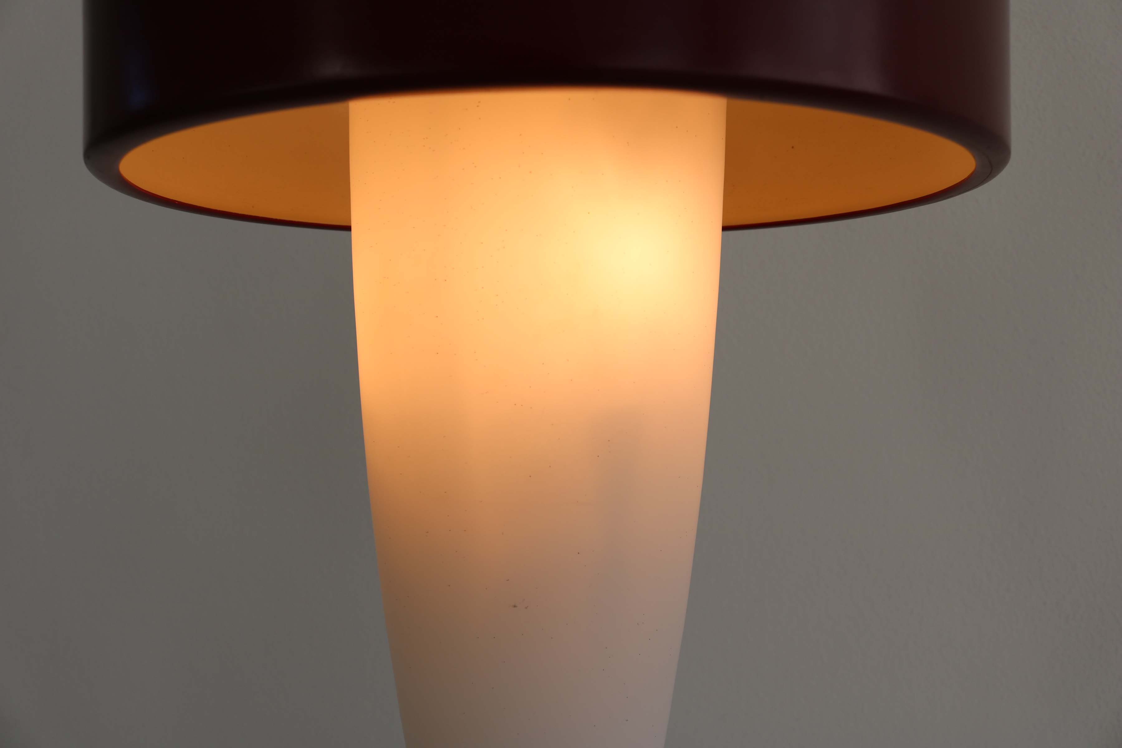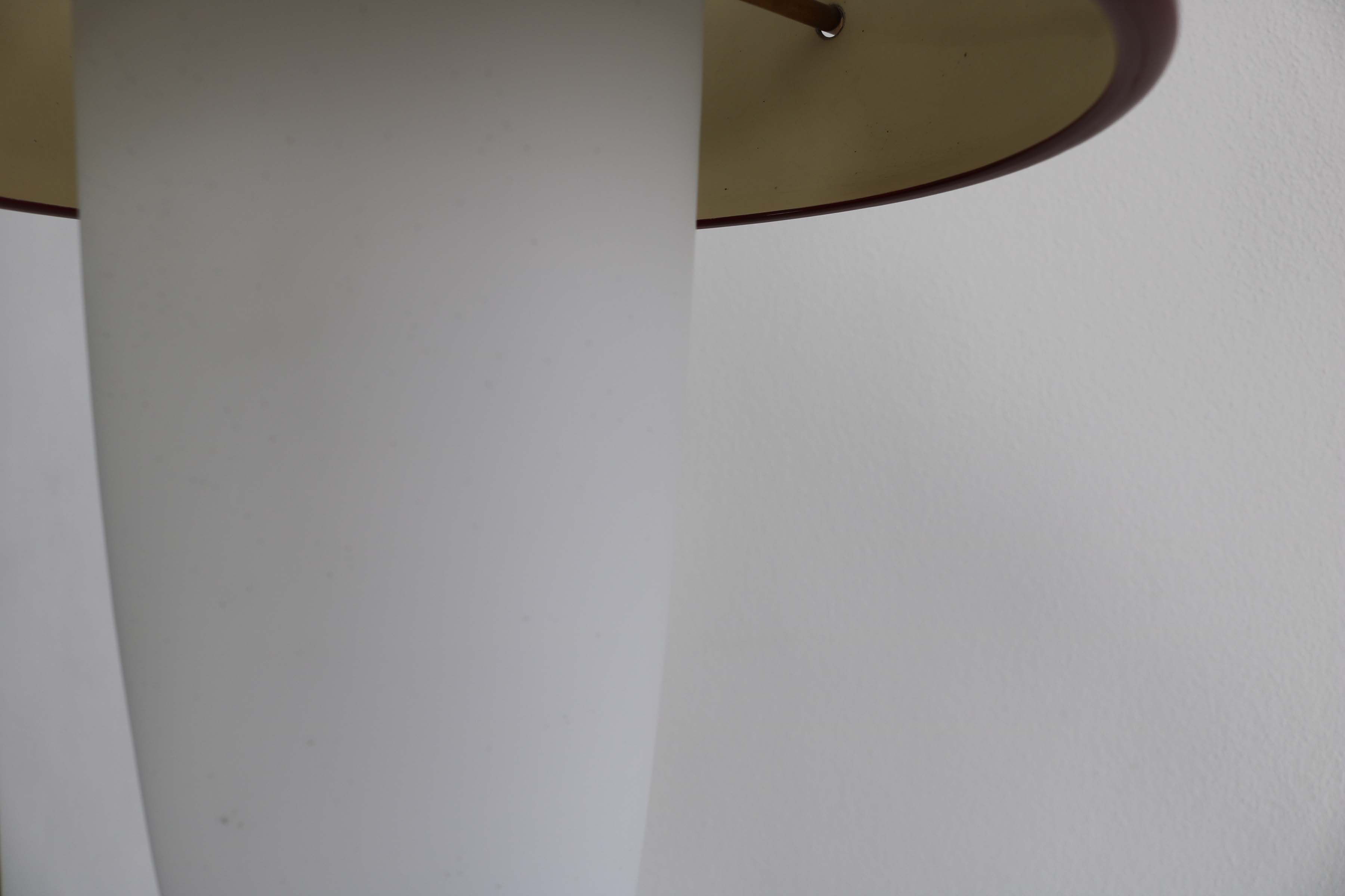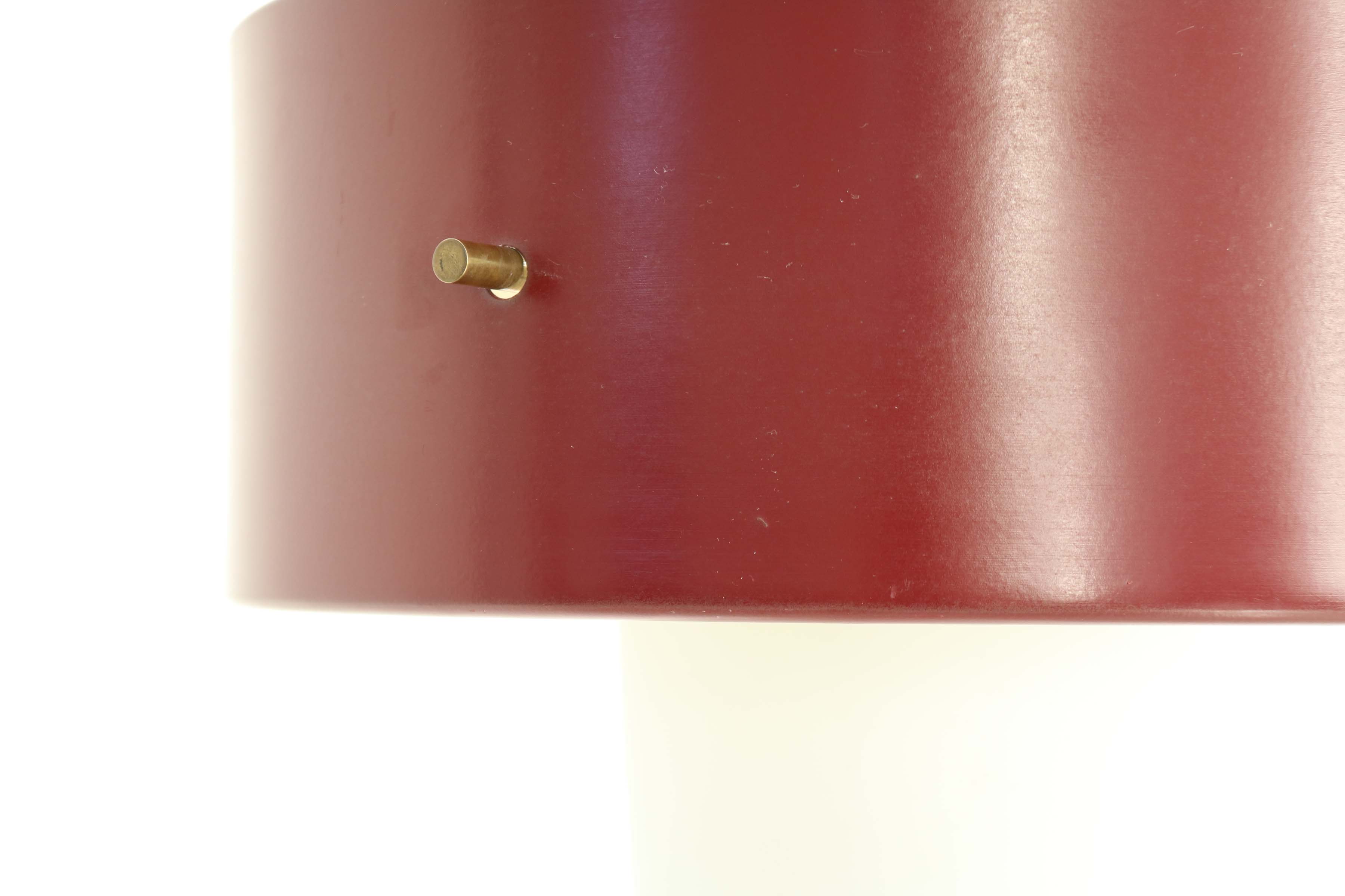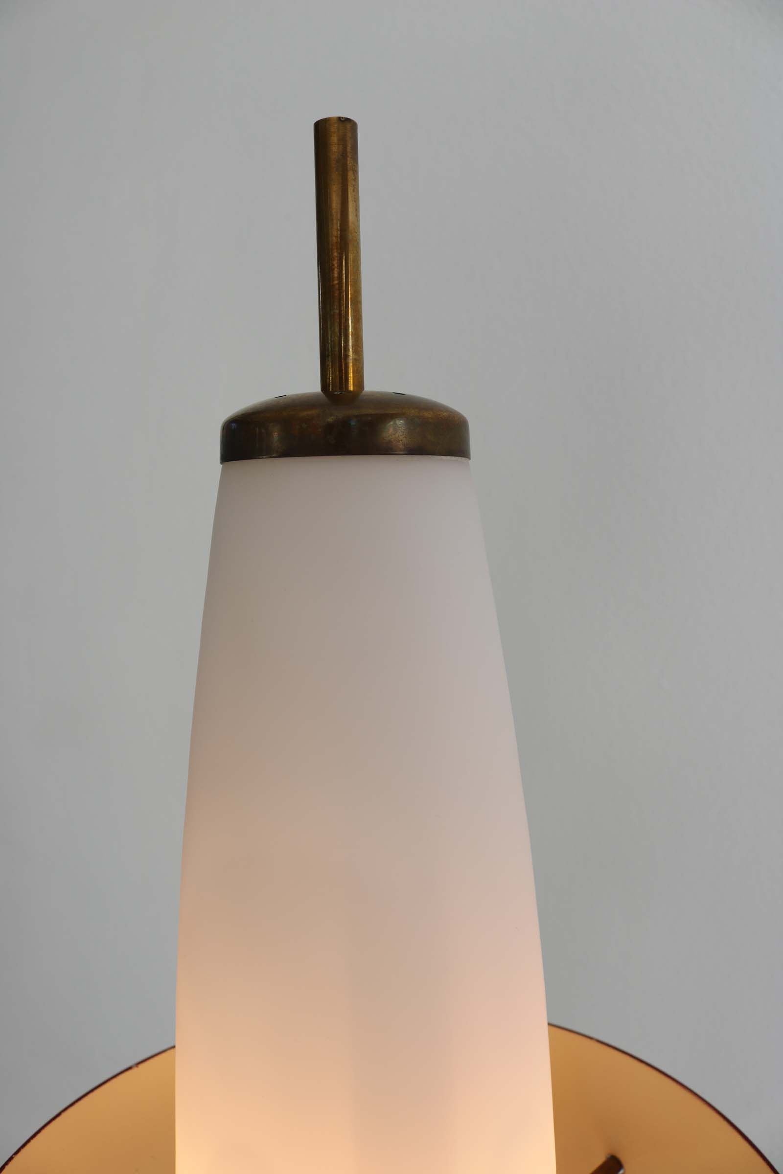 Elegant Italian floor lamp “Mod. 6005” by Angelo Brotto for Stilnovo, c.1960. Marble base with black-lacquered iron stem and brass accents; the opaline glass shade encircled by a ring of red-lacquered aluminium.