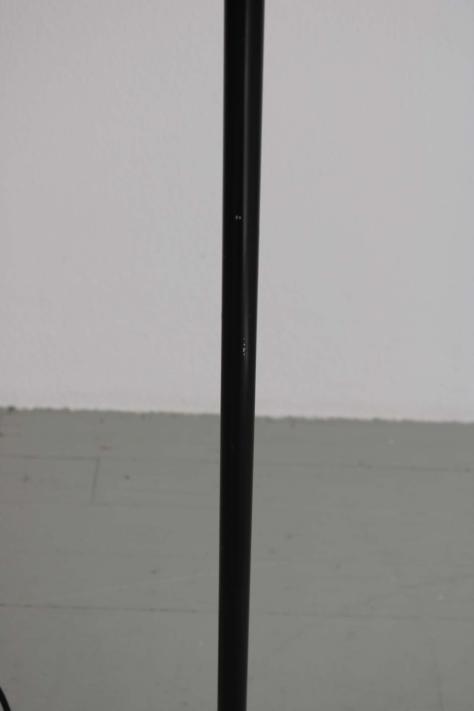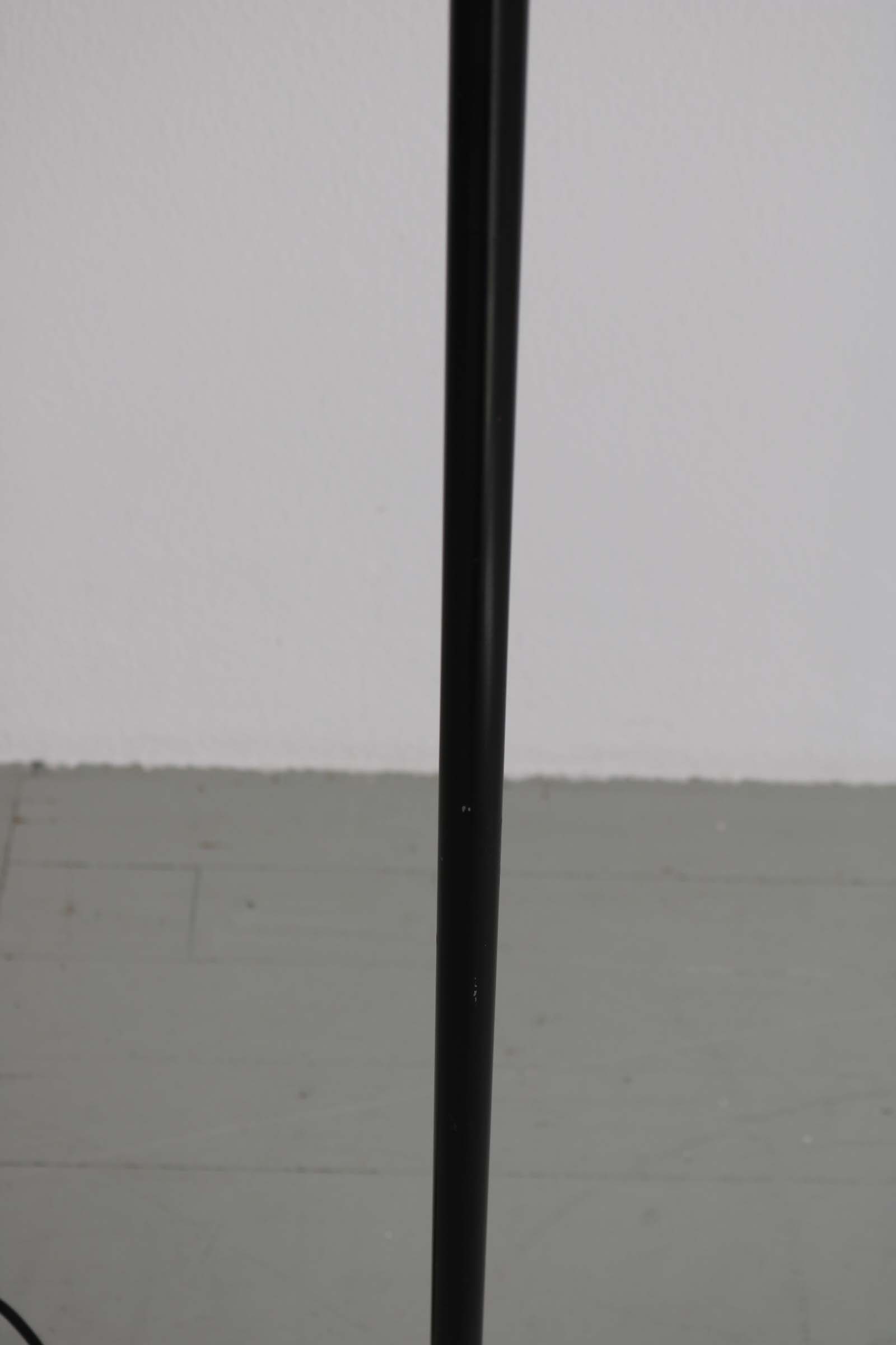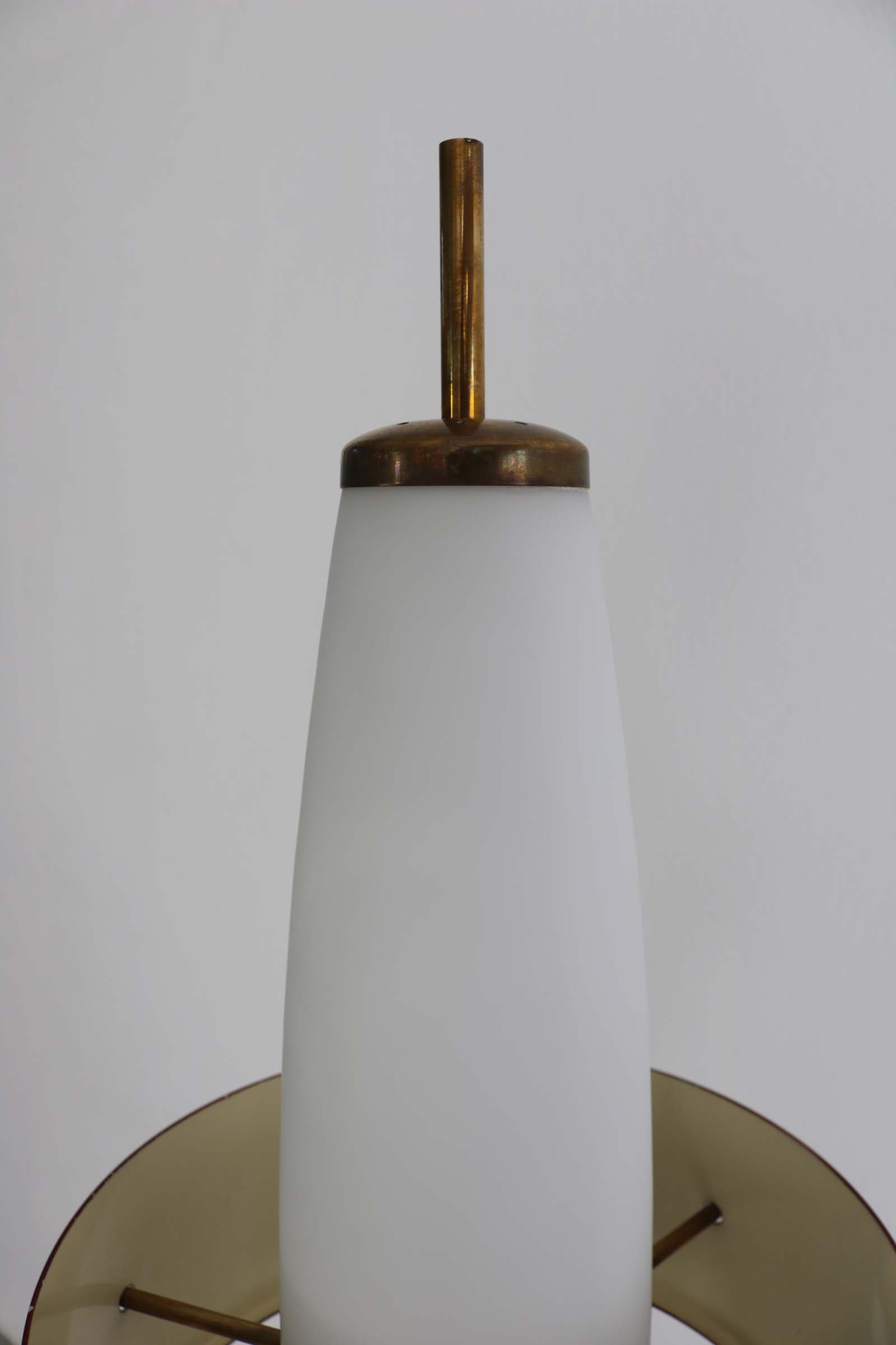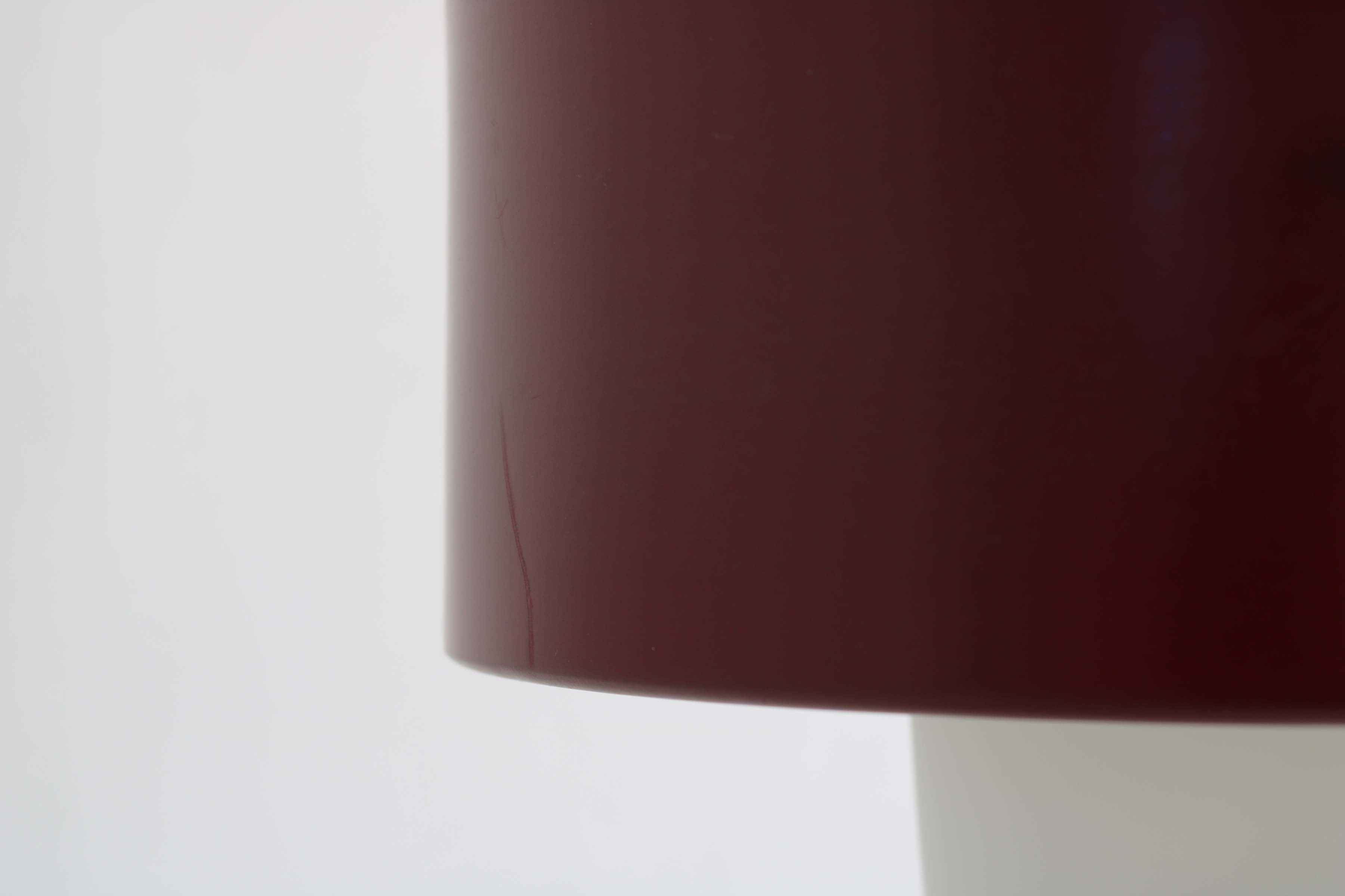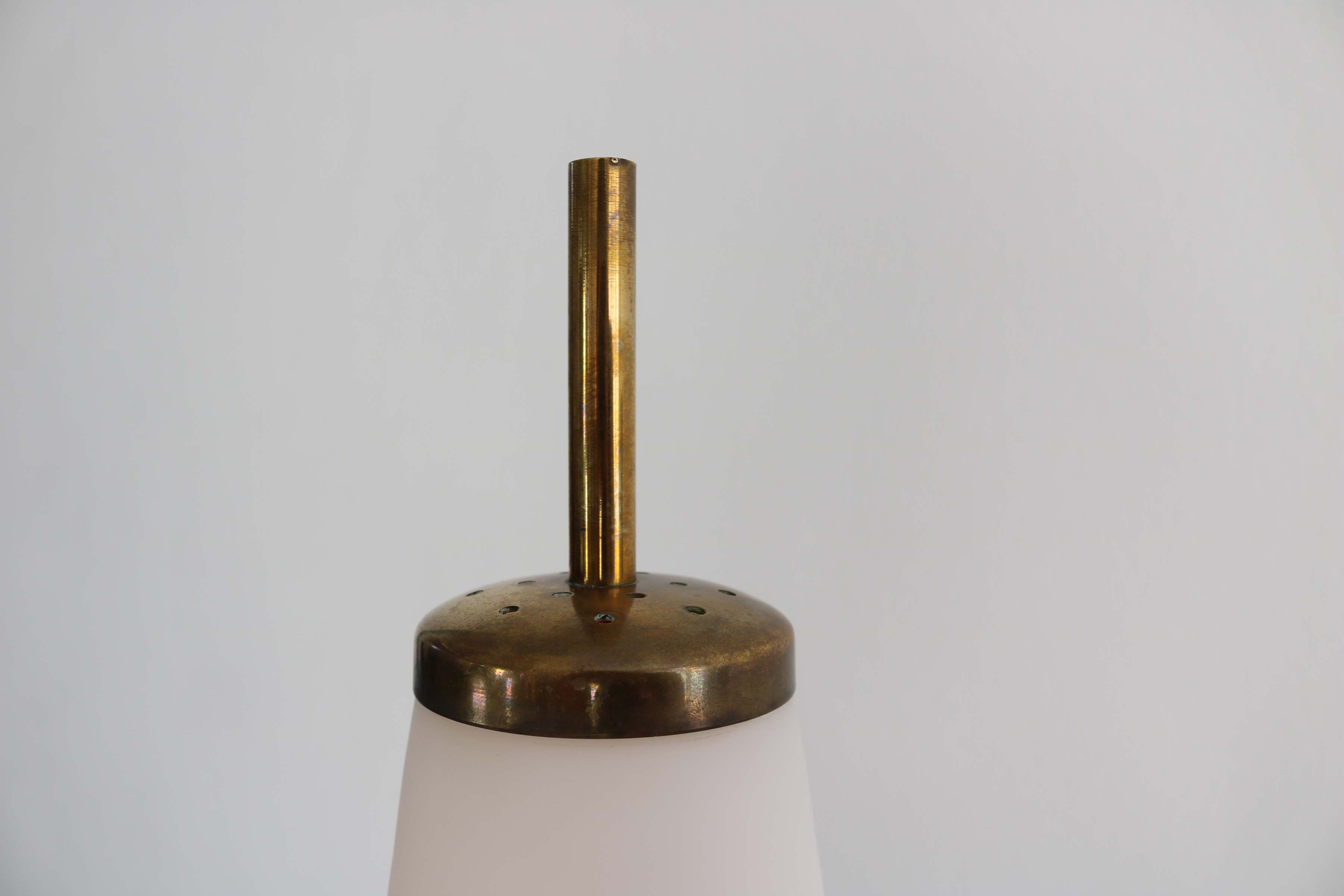 Elegant Italian floor lamp “Mod. 6005” by Angelo Brotto for Stilnovo, c.1960. Marble base with black-lacquered iron stem and brass accents; the opaline glass shade encircled by a ring of red-lacquered aluminium.