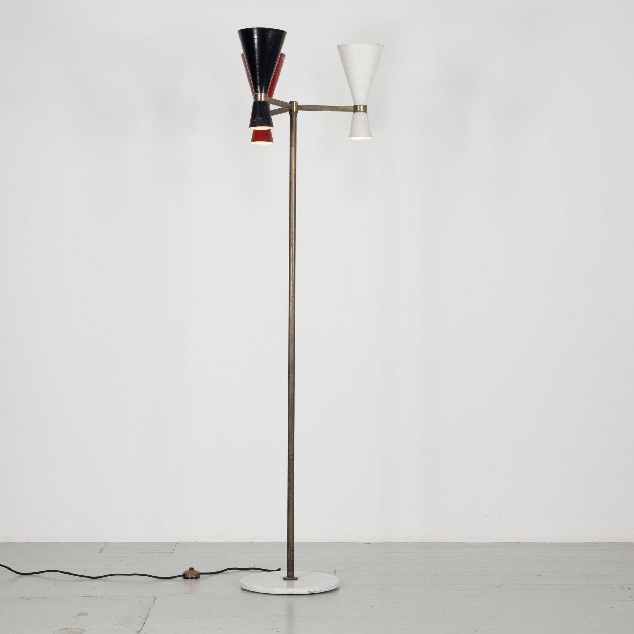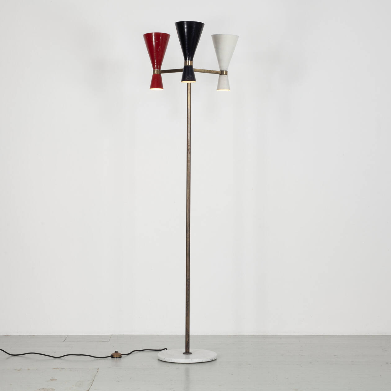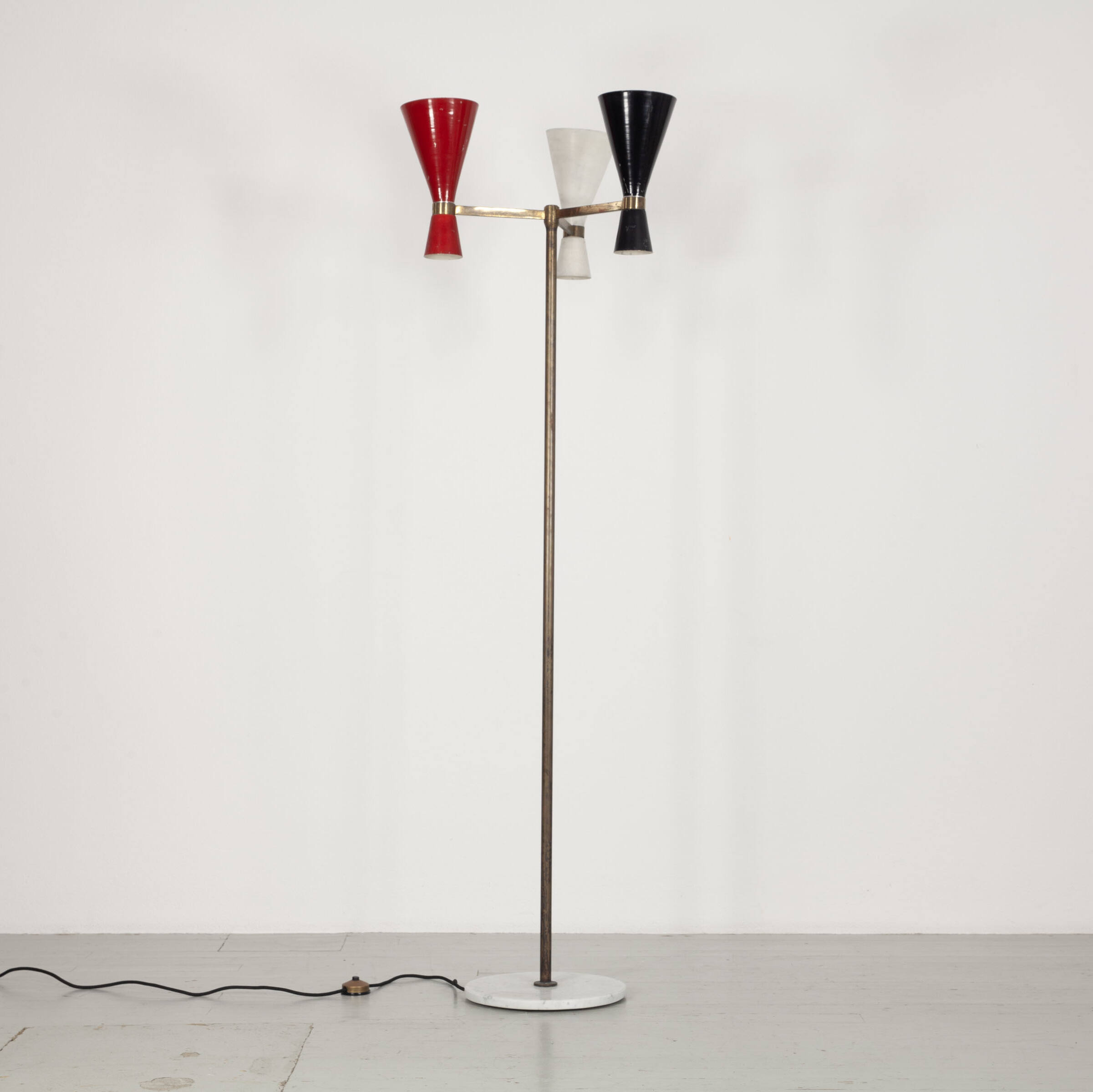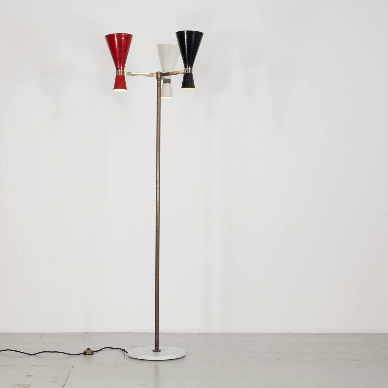 Floor Lamp, Italy, 1950s. This brass floor lamp has three multi coloured, lacquered metal shades and a marble base.