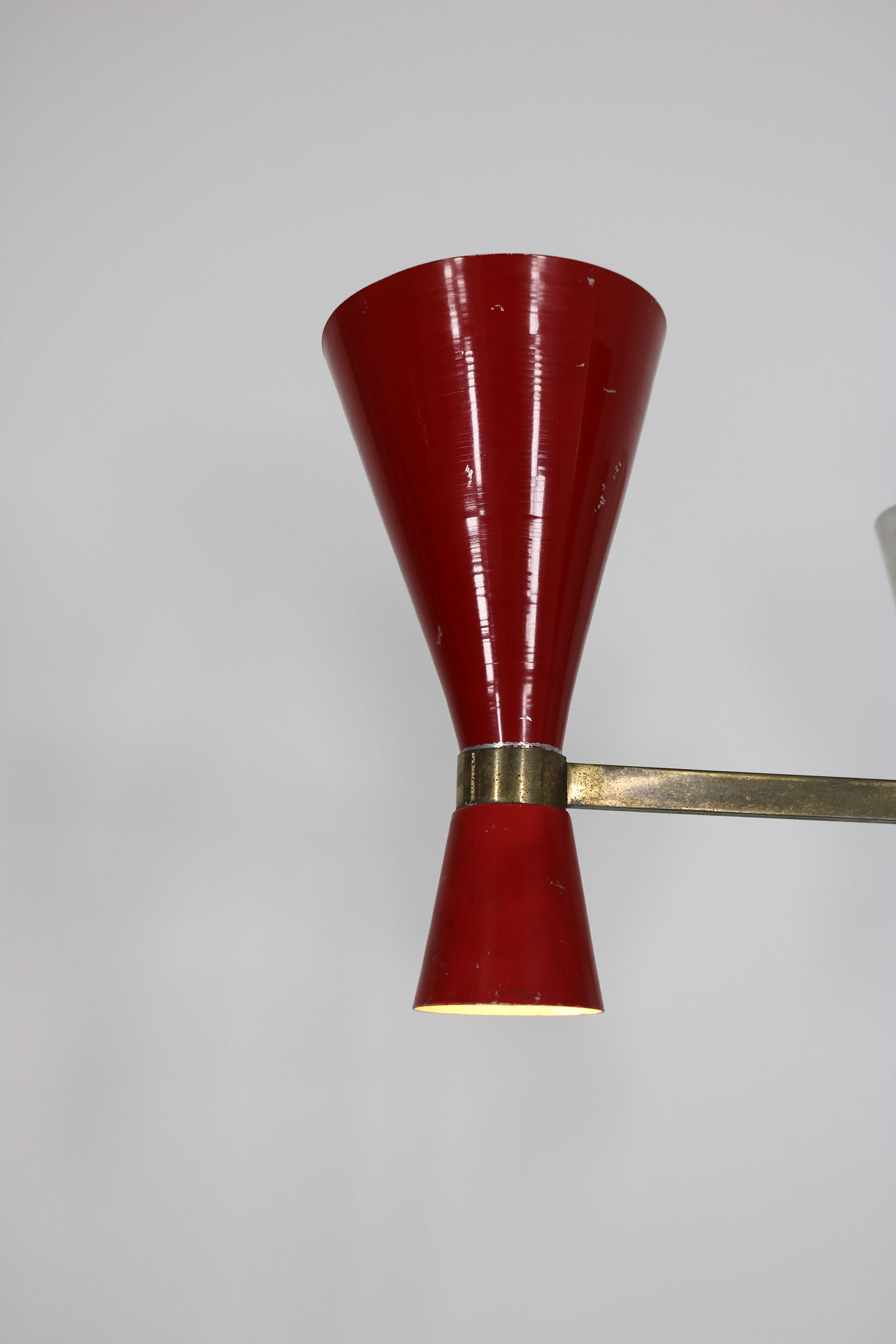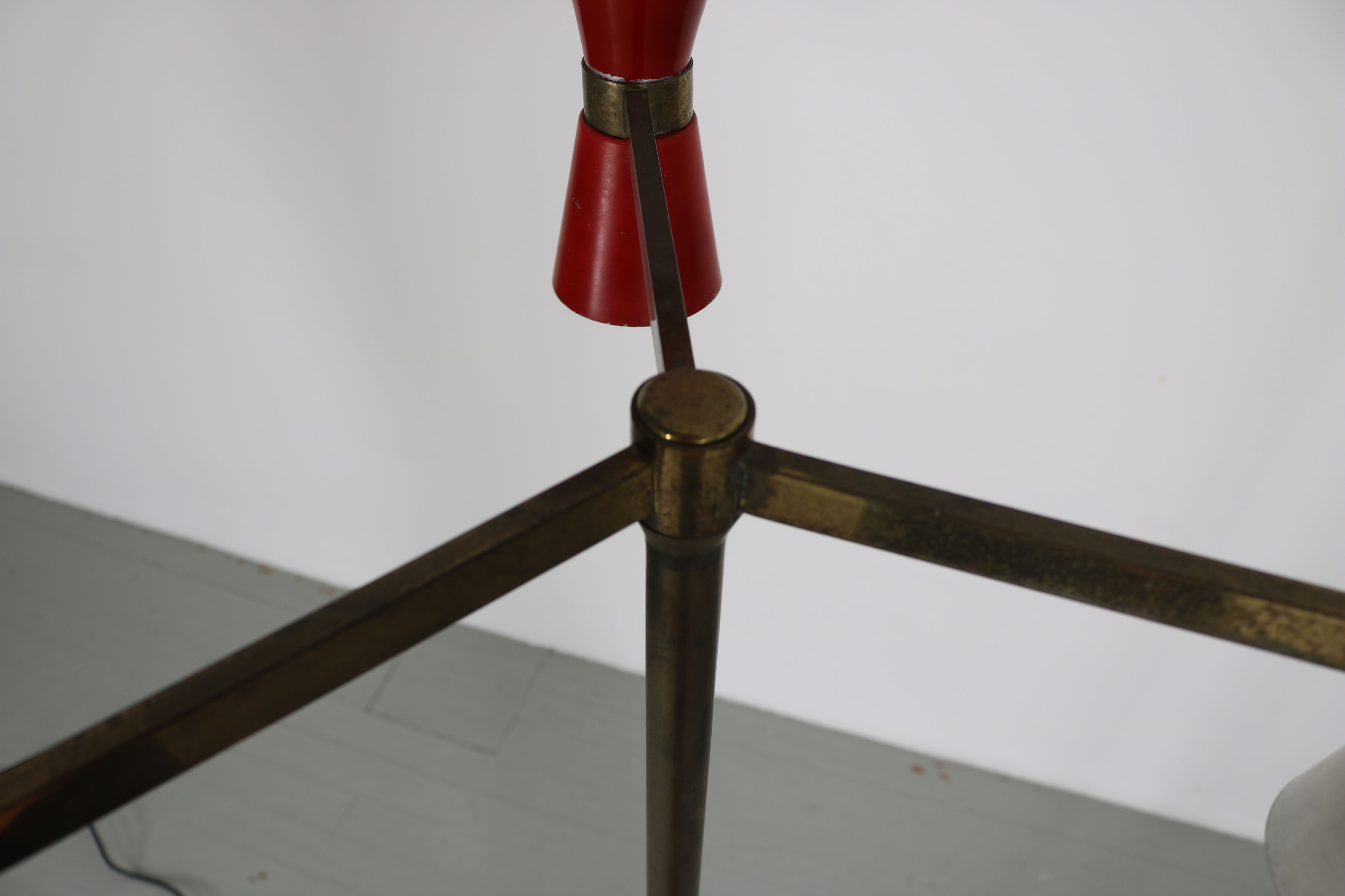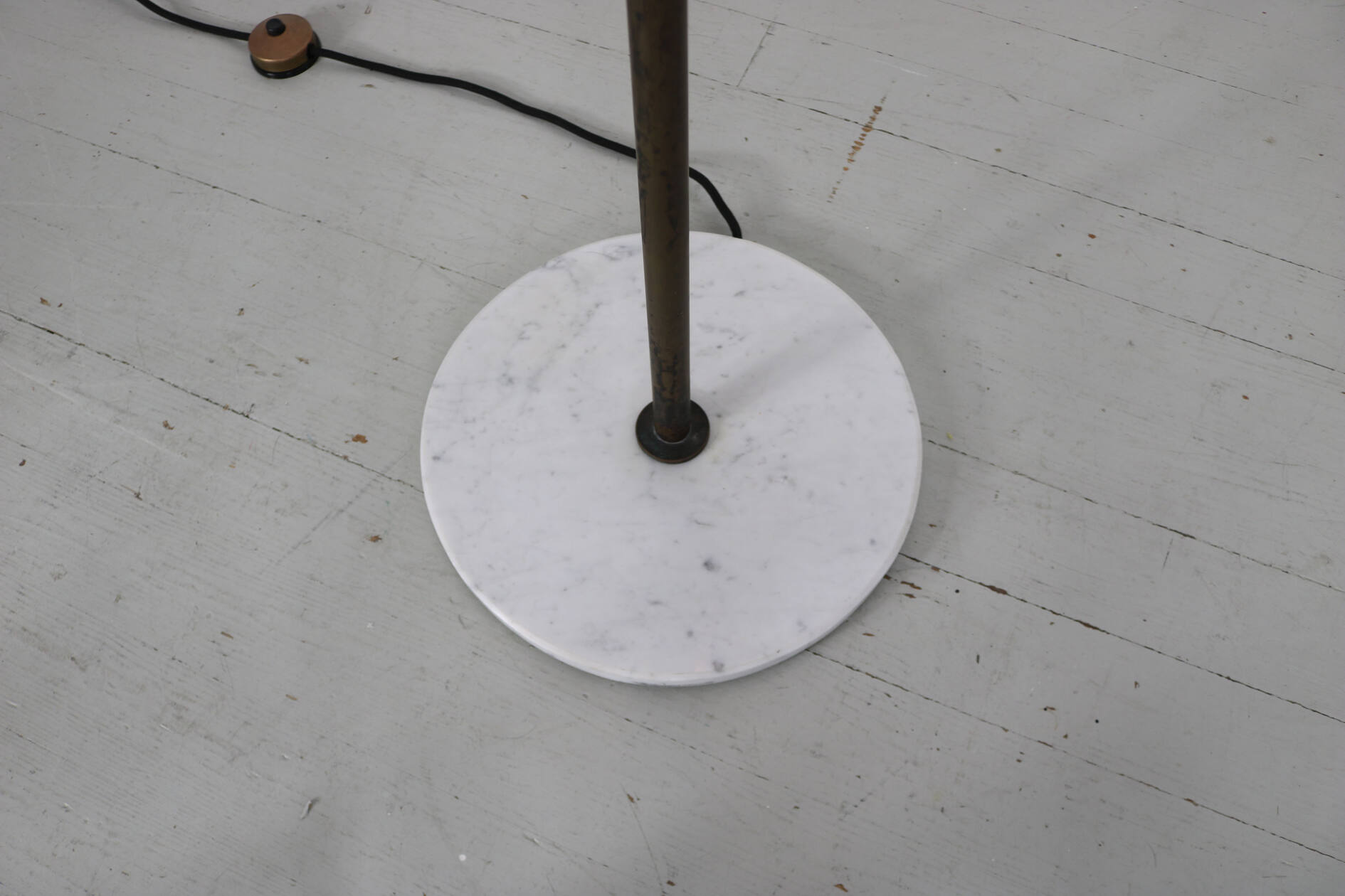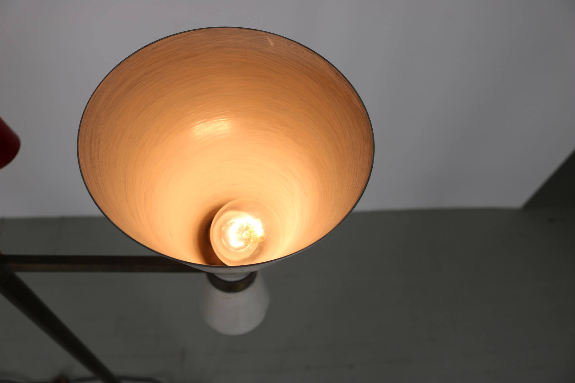 Floor Lamp, Italy, 1950s. This brass floor lamp has three multi coloured, lacquered metal shades and a marble base.
