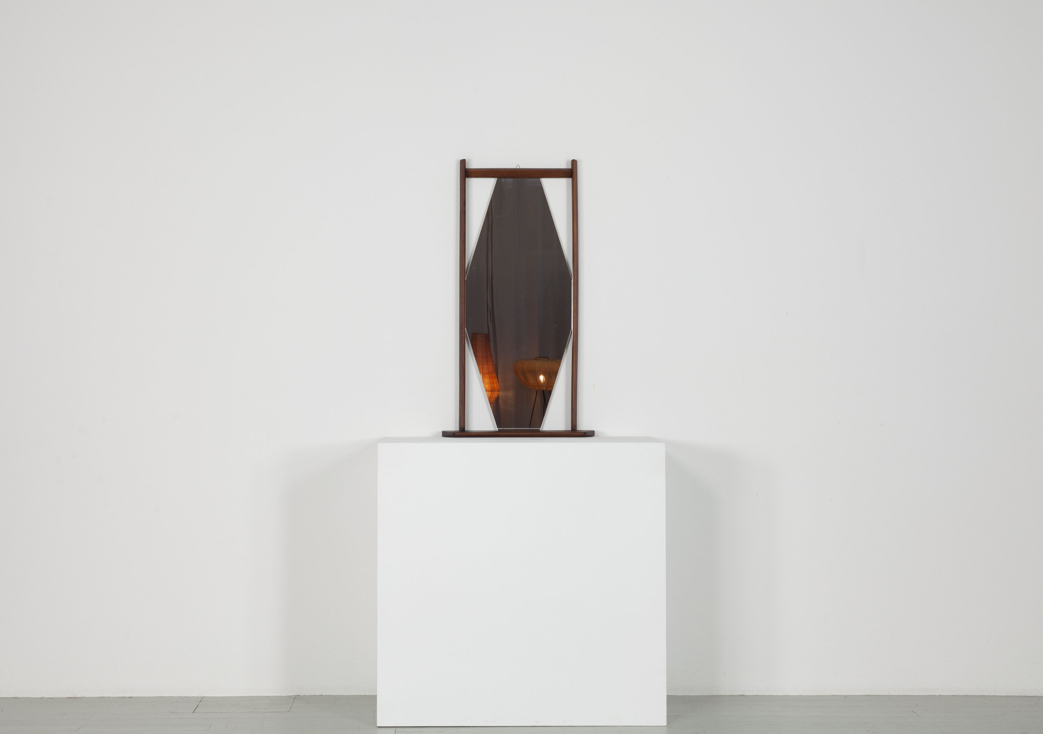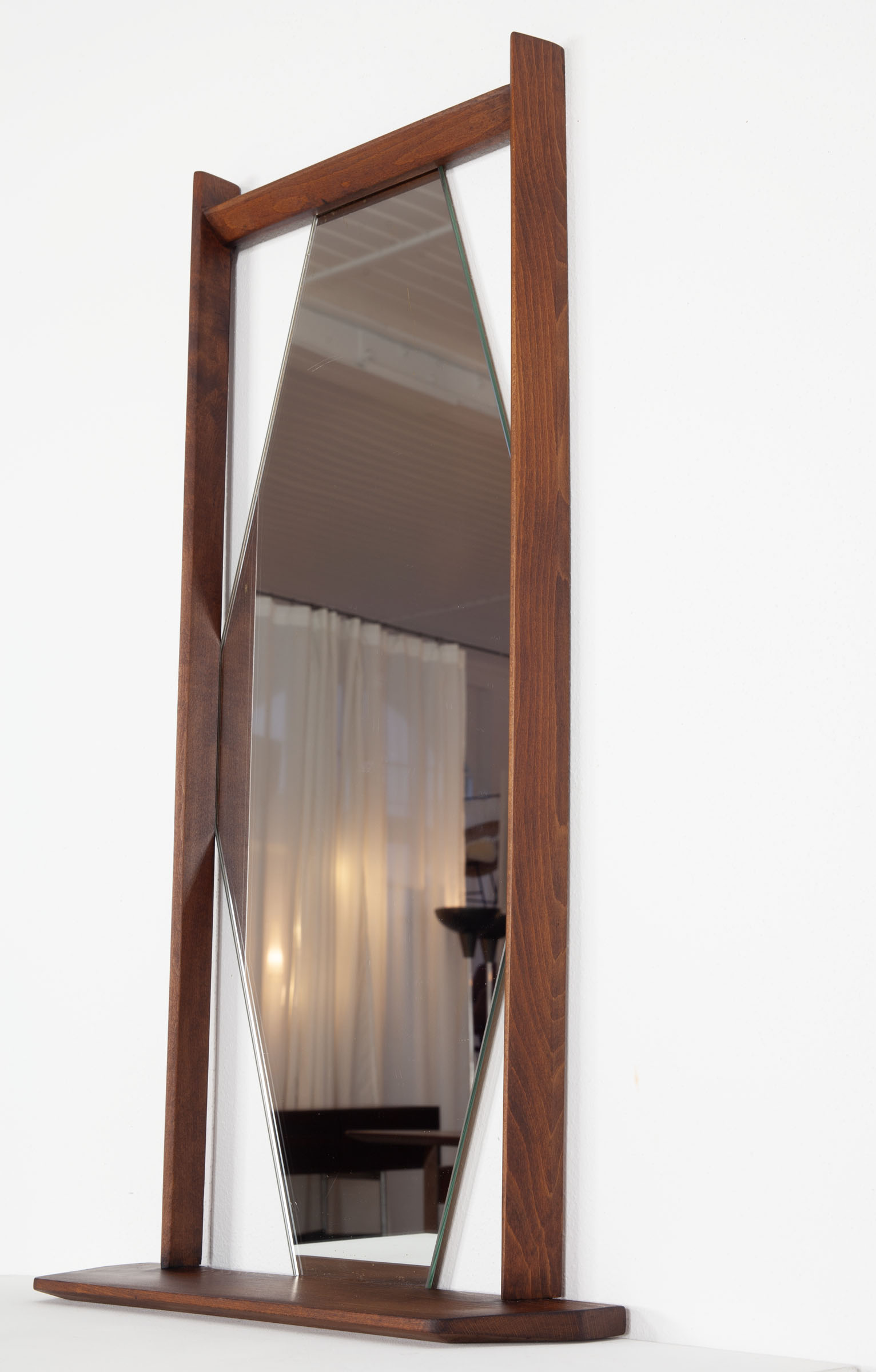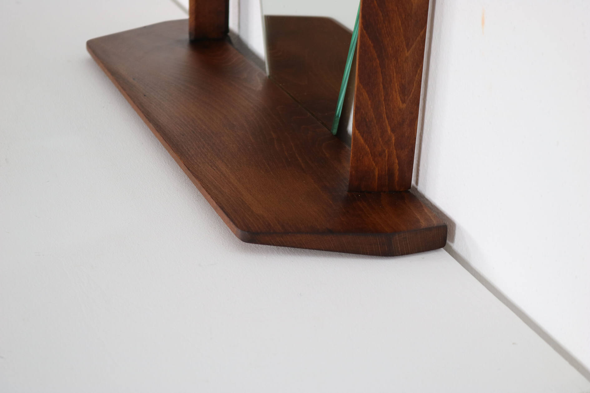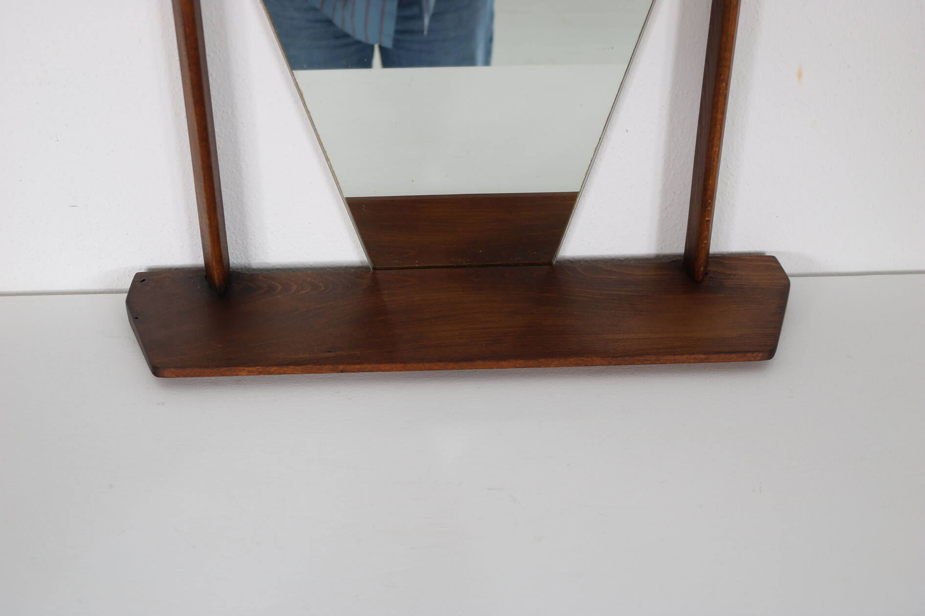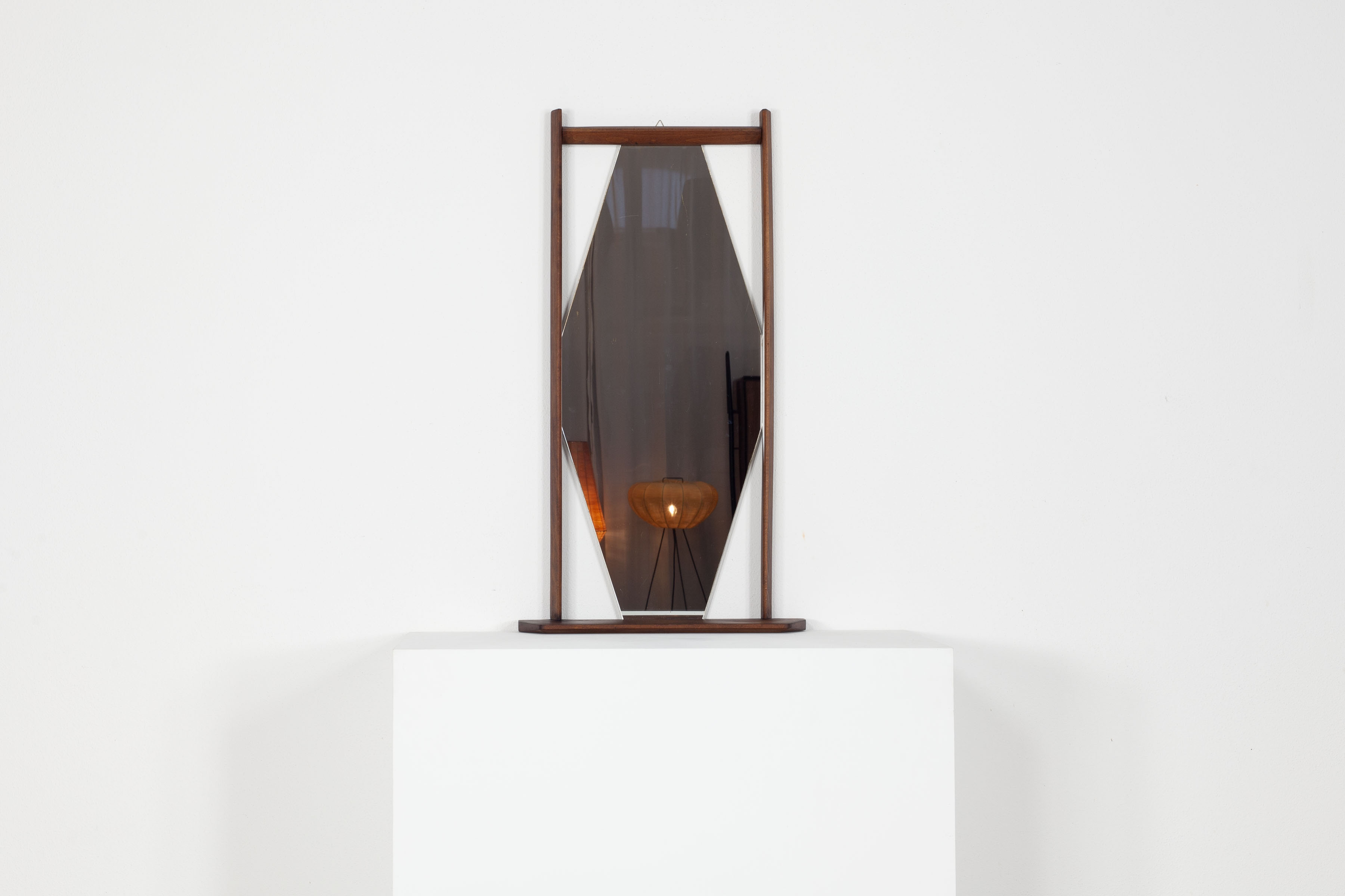 Hexagonal wall mirror with teak frame and integrated shelf. Italian design, 1960s. Clean geometric Mid-Century lines, warm-toned wood with attractive grain. Small practical console beneath the mirror for accessories or keys. Decorative yet functional wall piece.