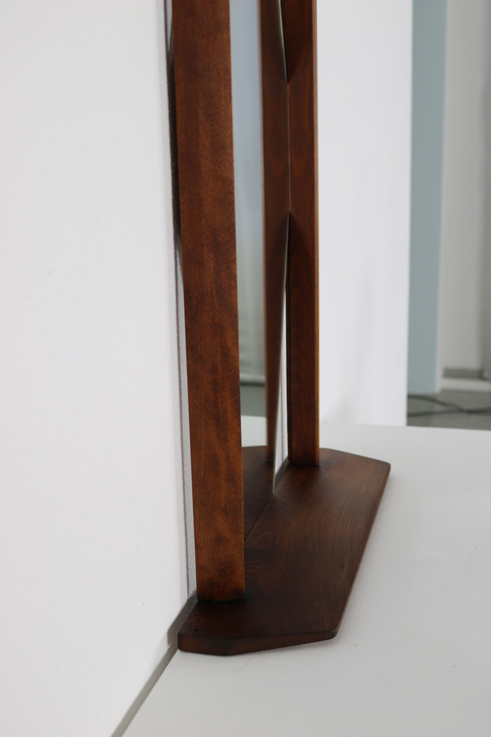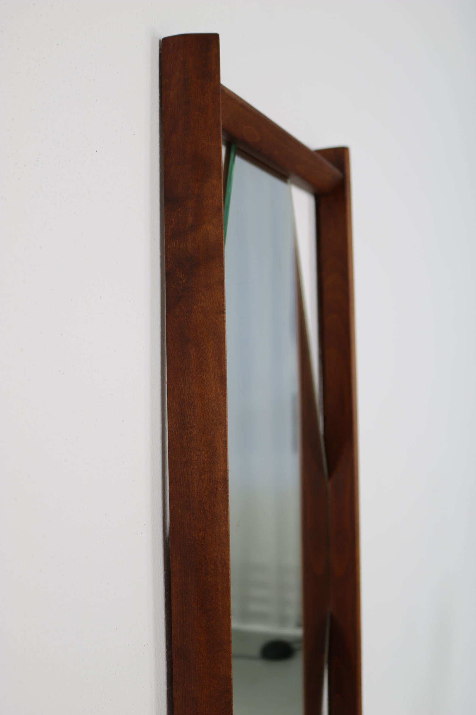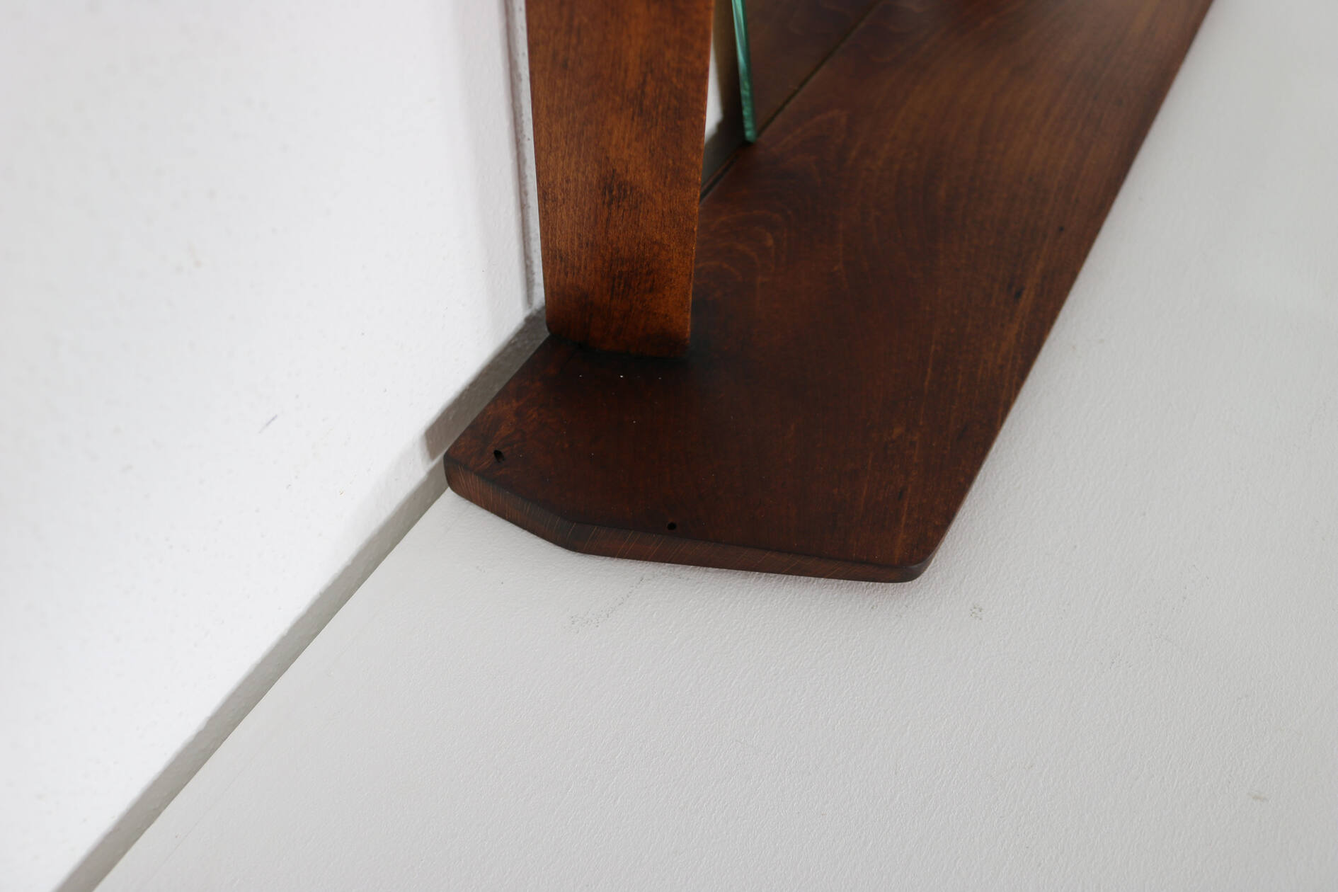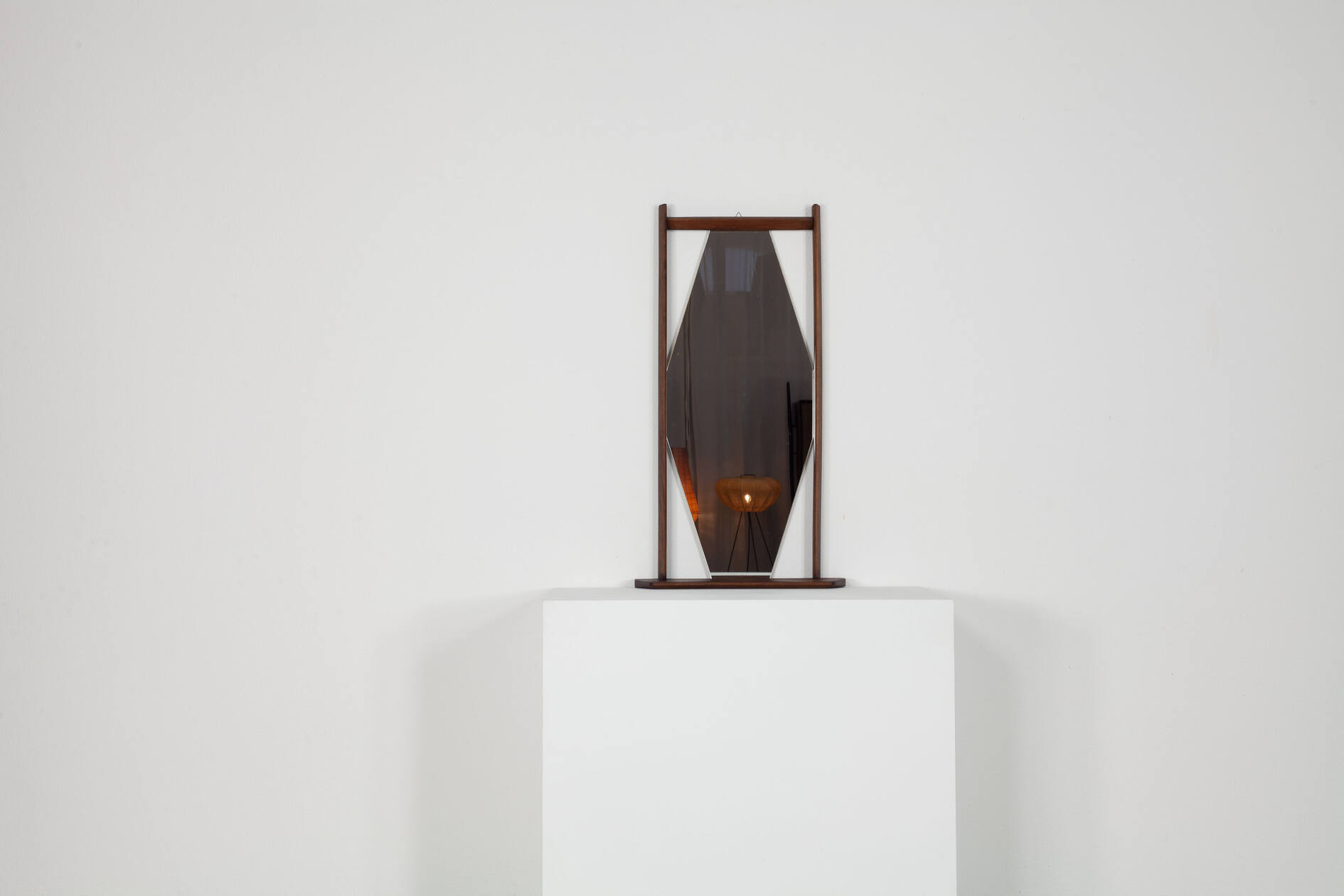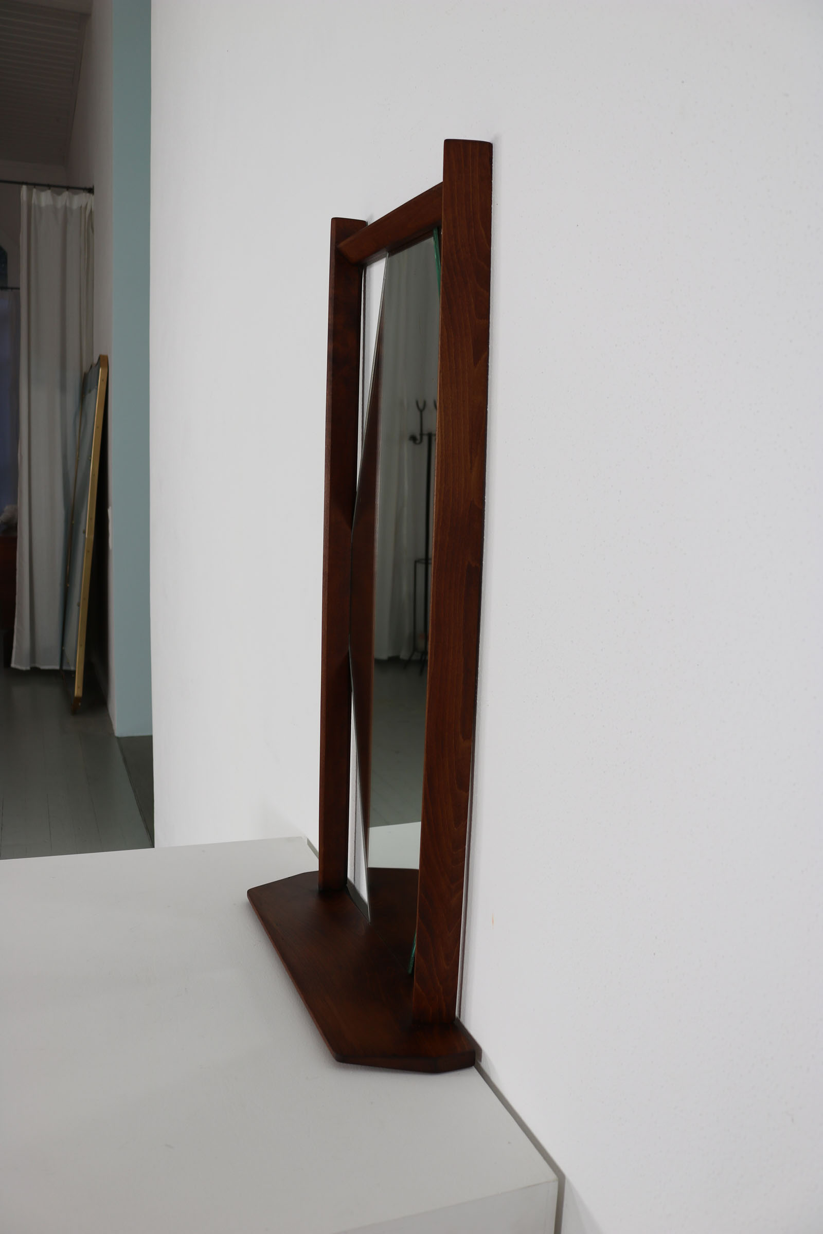 Hexagonal wall mirror with teak frame and integrated shelf. Italian design, 1960s. Clean geometric Mid-Century lines, warm-toned wood with attractive grain. Small practical console beneath the mirror for accessories or keys. Decorative yet functional wall piece.
