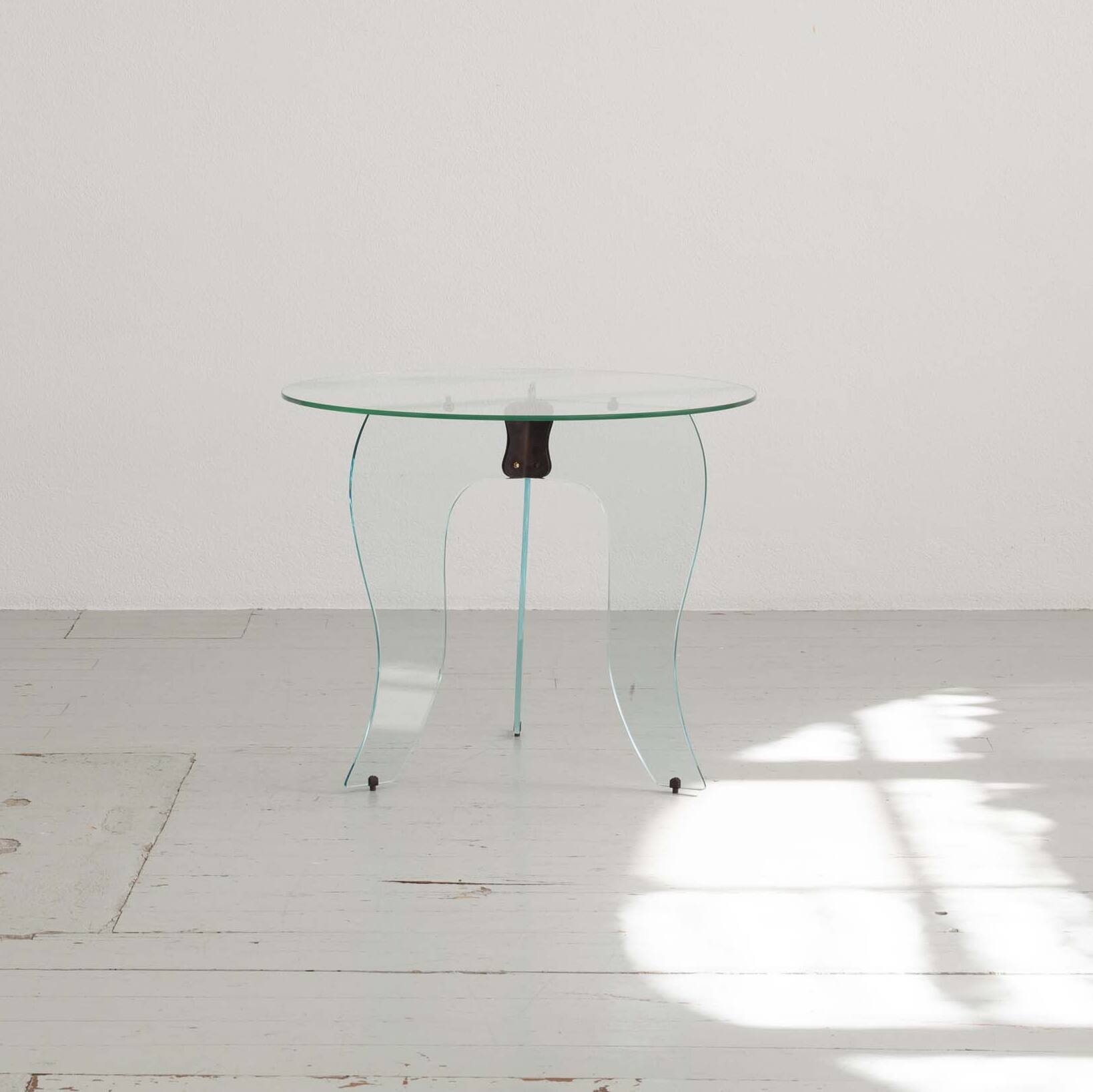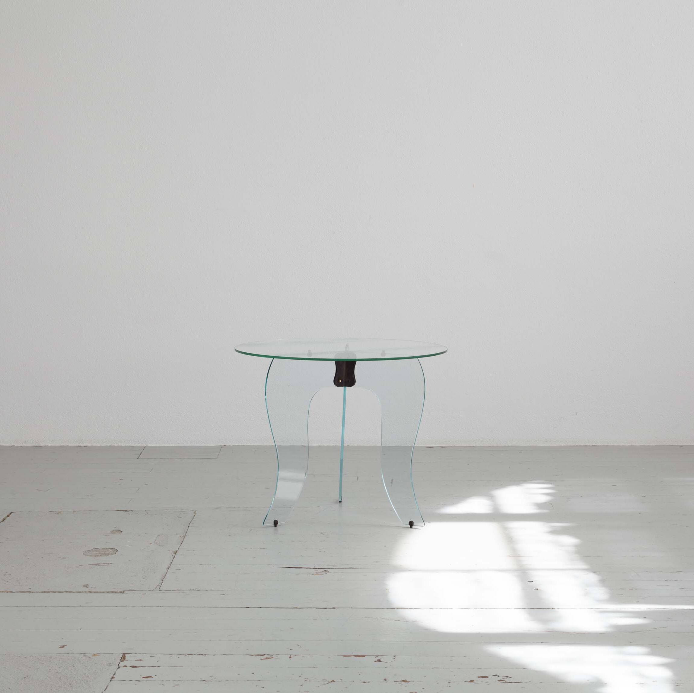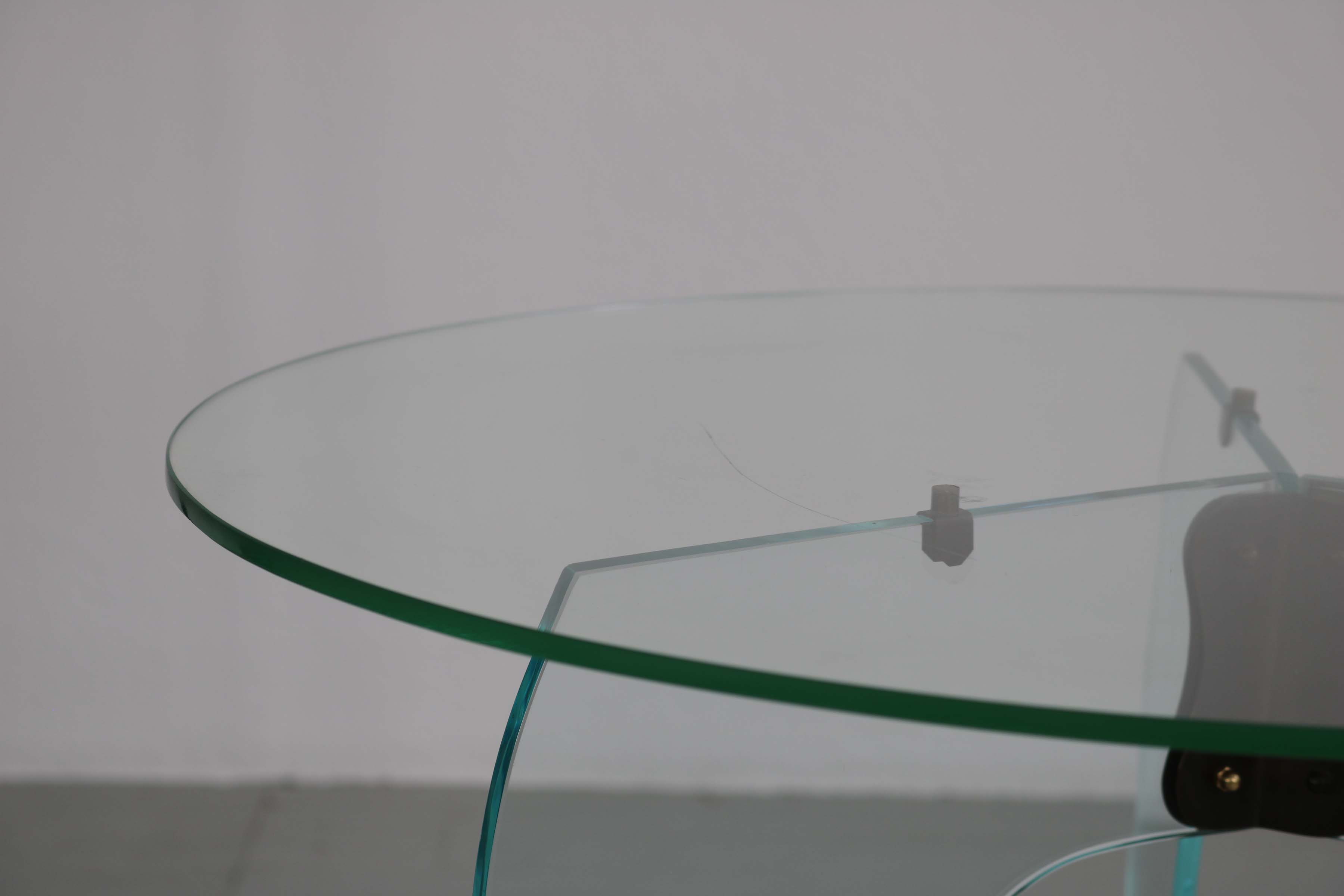 Elegant round side table from the 1940s, crafted in crystal glass and refined with subtly burnished brass elements. A stylish, light-catching piece that brings a touch of Art Deco sophistication to any interior.