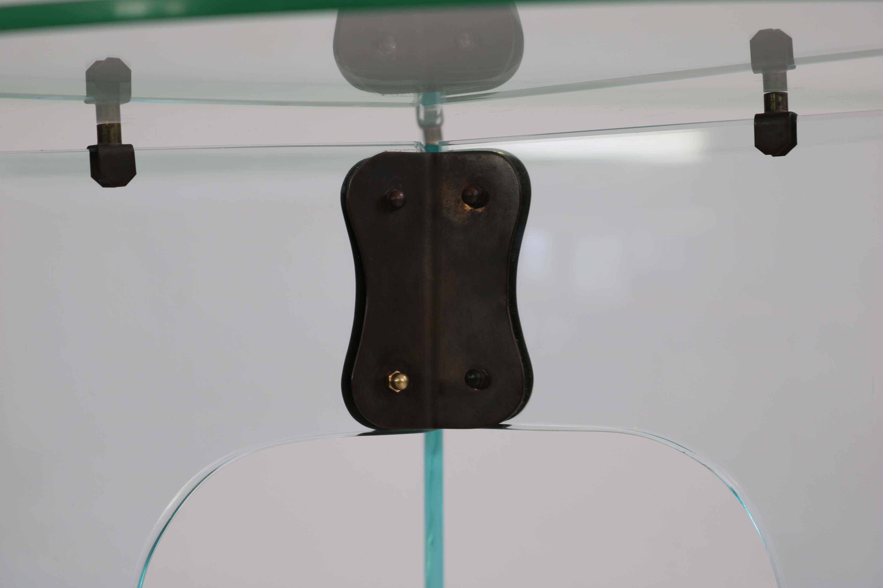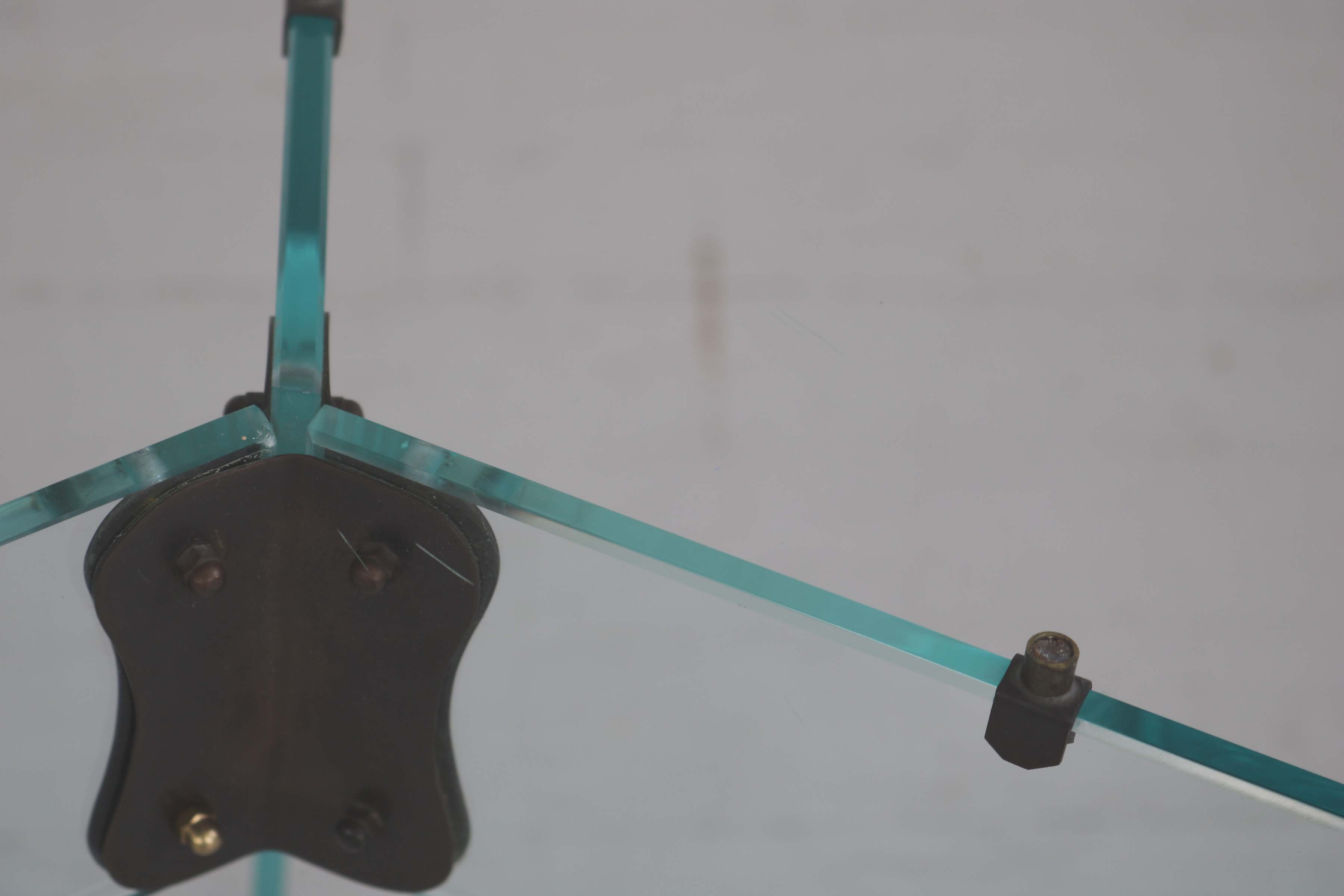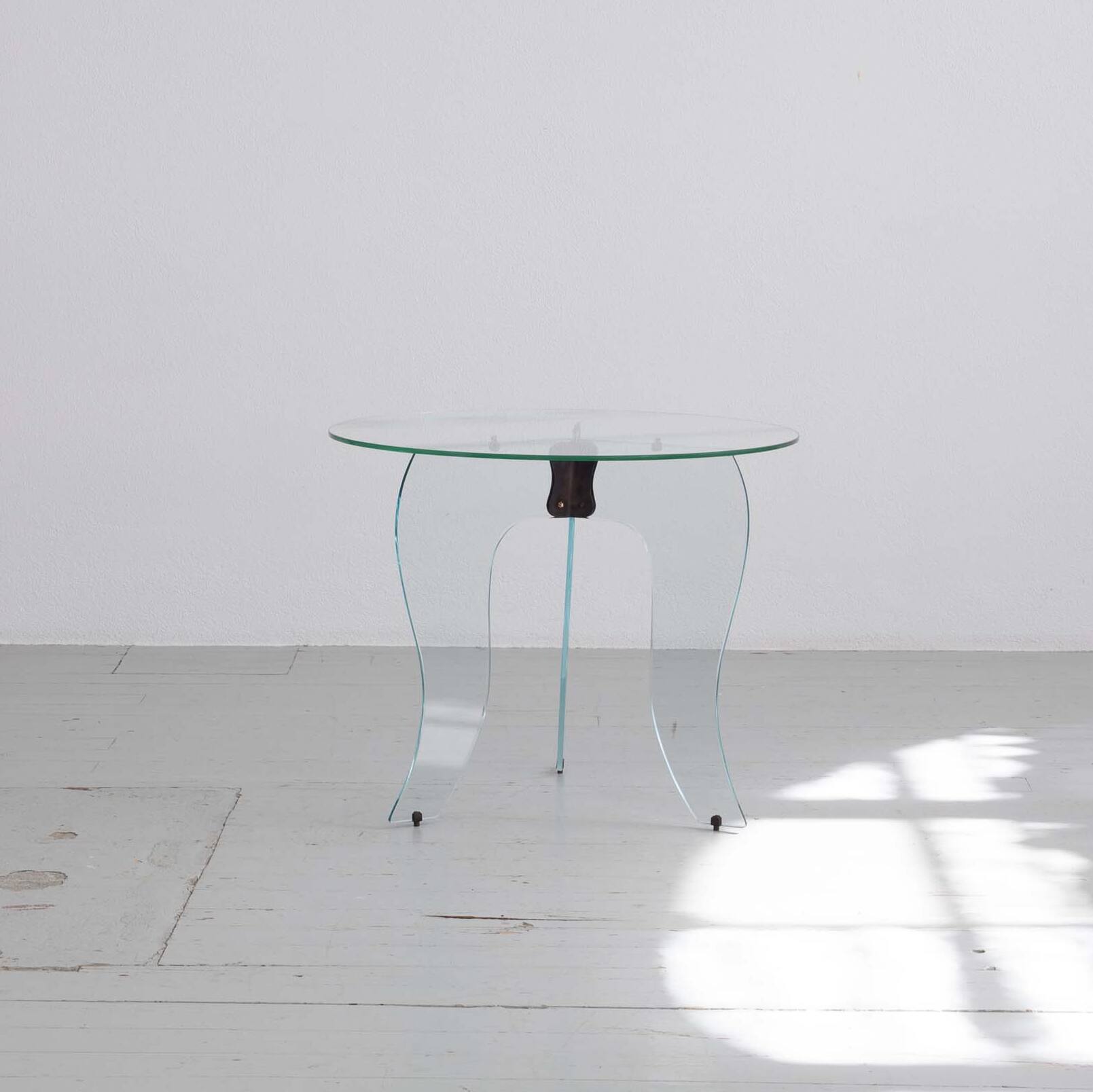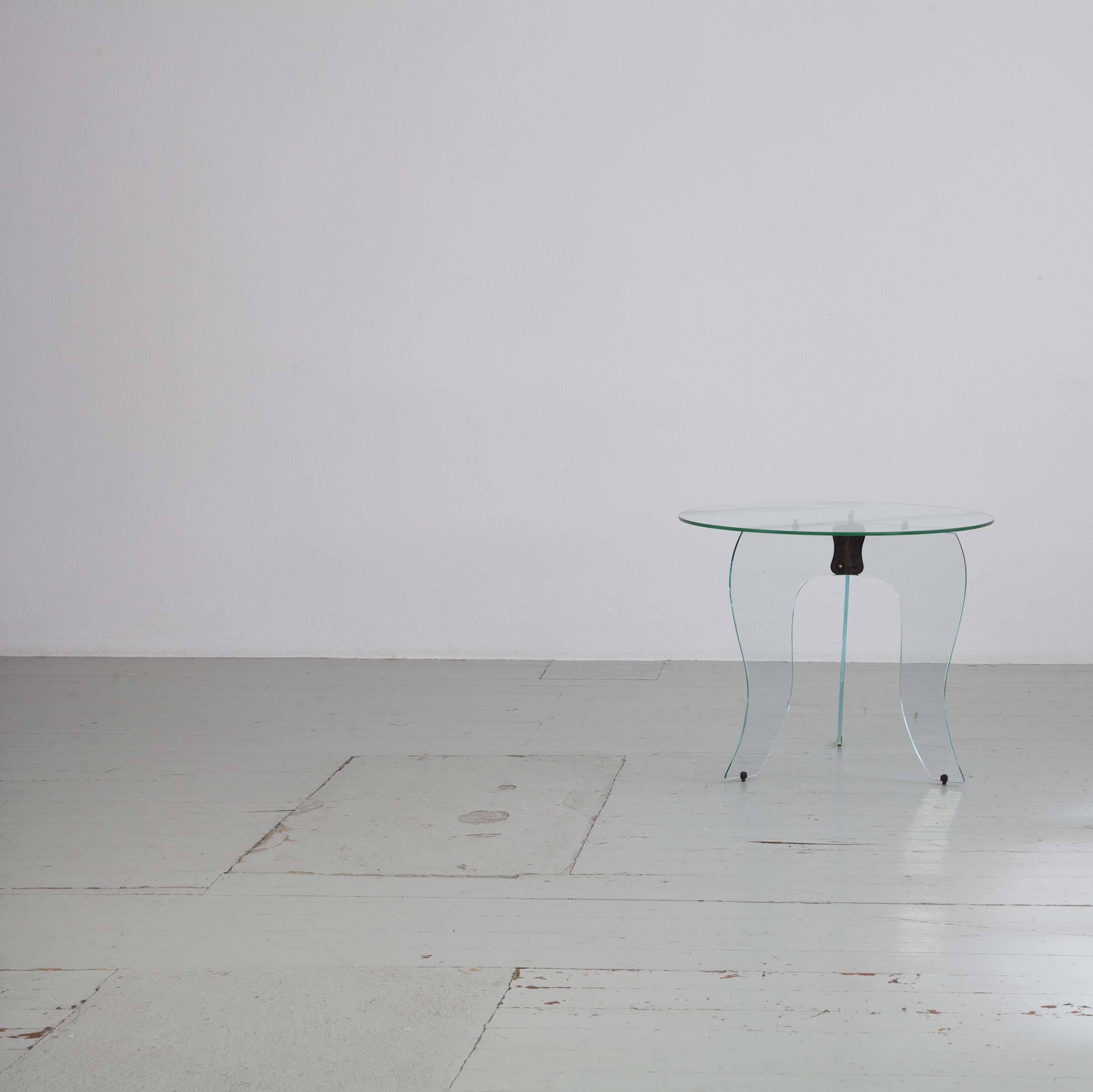 Elegant round side table from the 1940s, crafted in crystal glass and refined with subtly burnished brass elements. A stylish, light-catching piece that brings a touch of Art Deco sophistication to any interior.