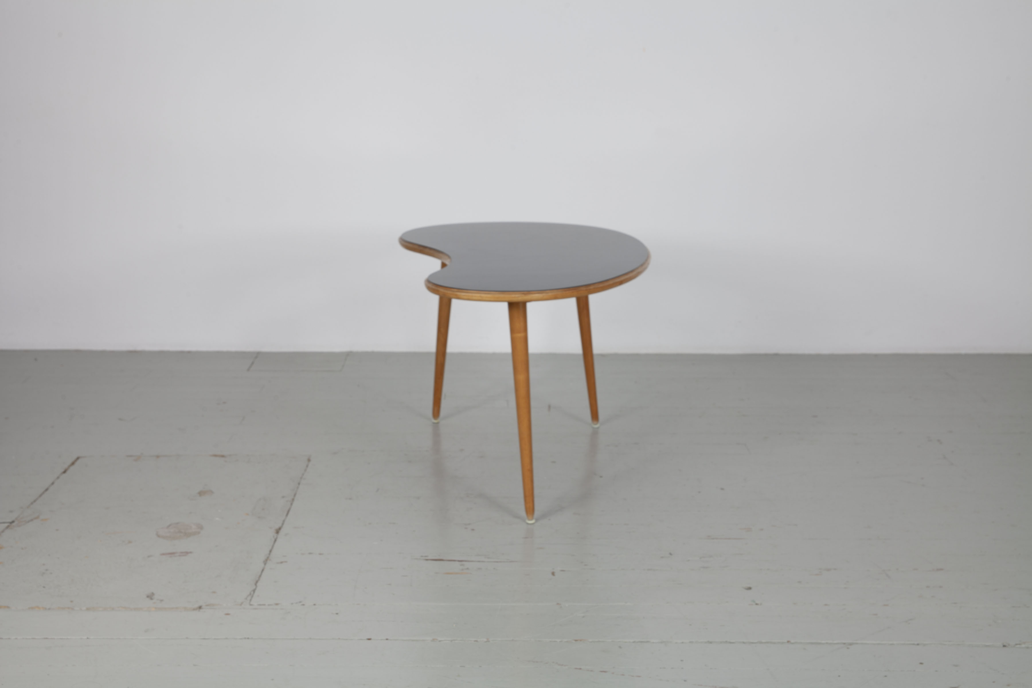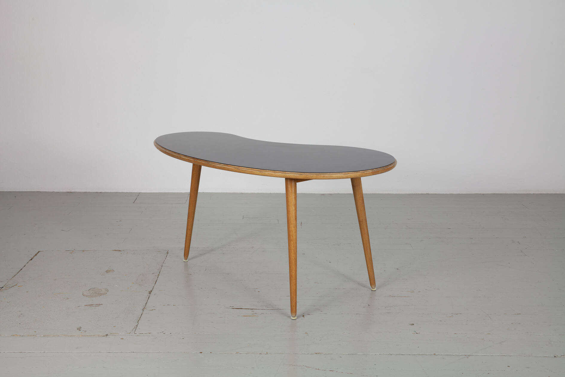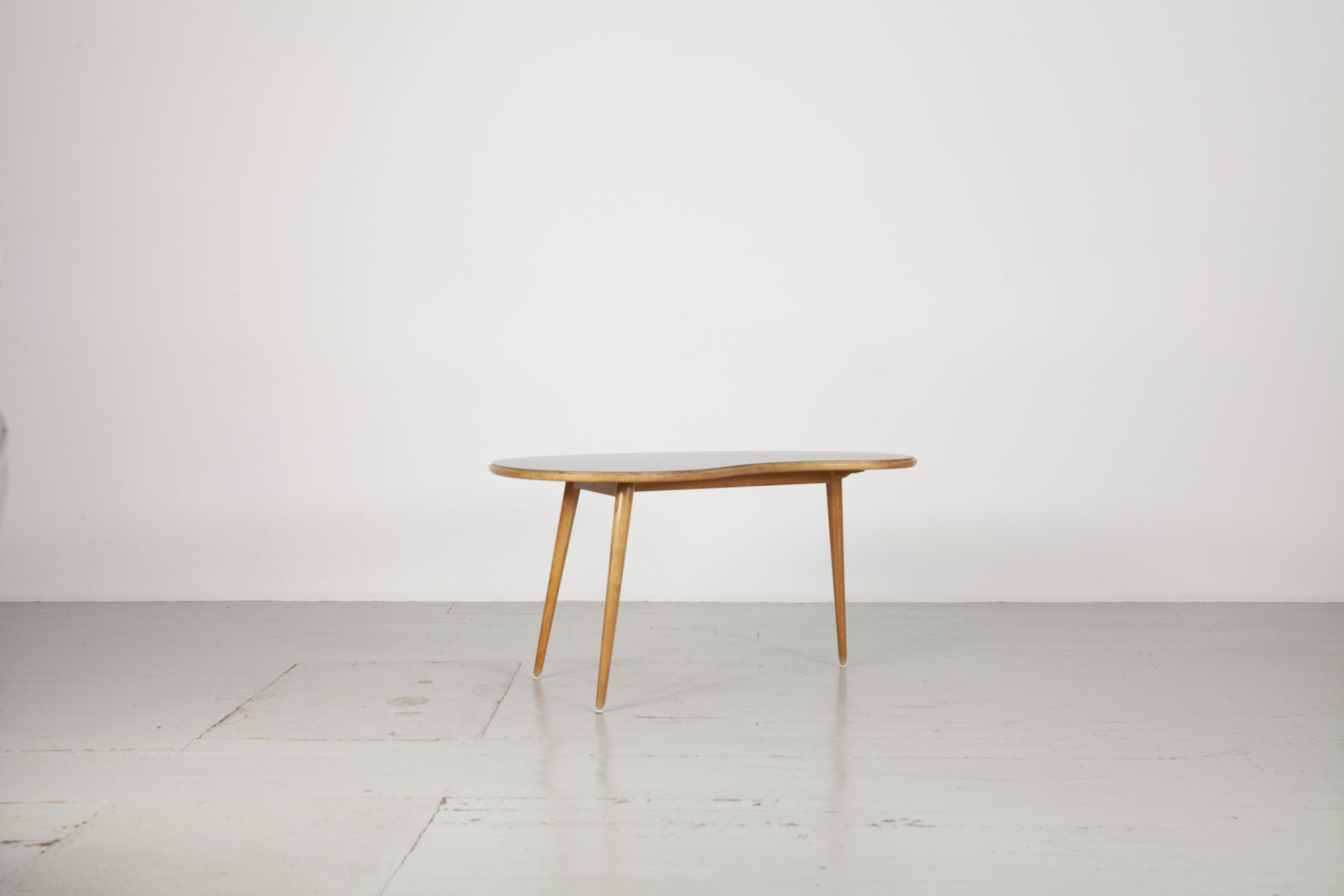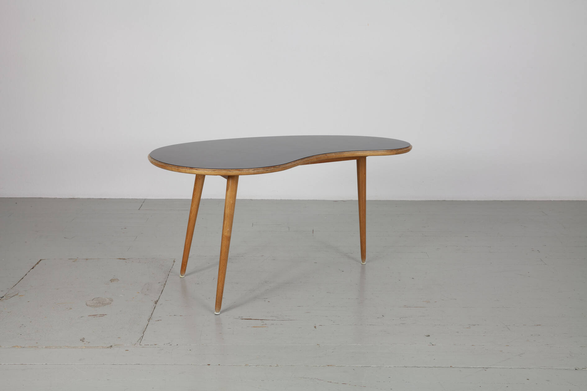 Large, three-legged, kidney-shaped coffee table made of wood with a black Formica surface.