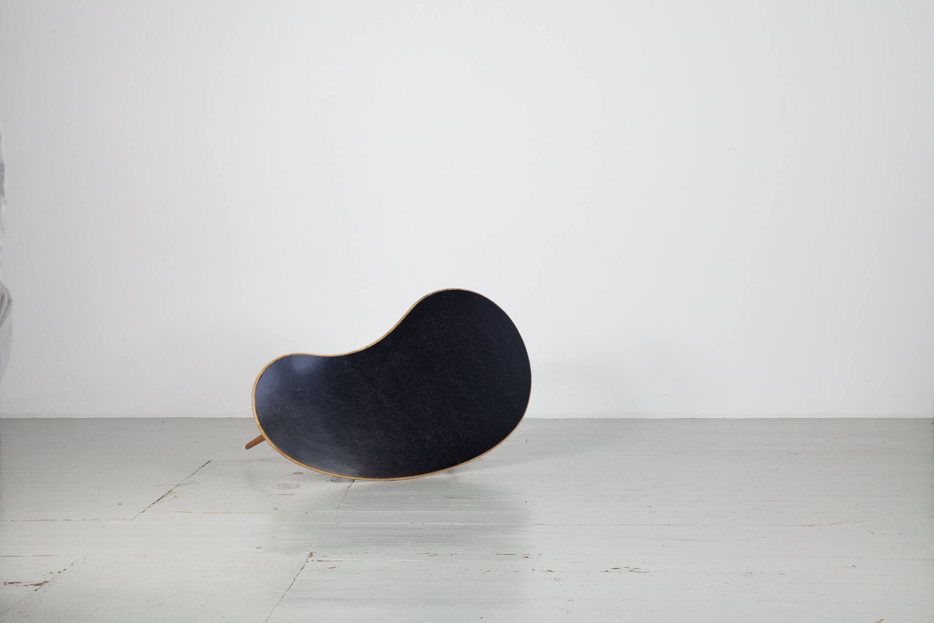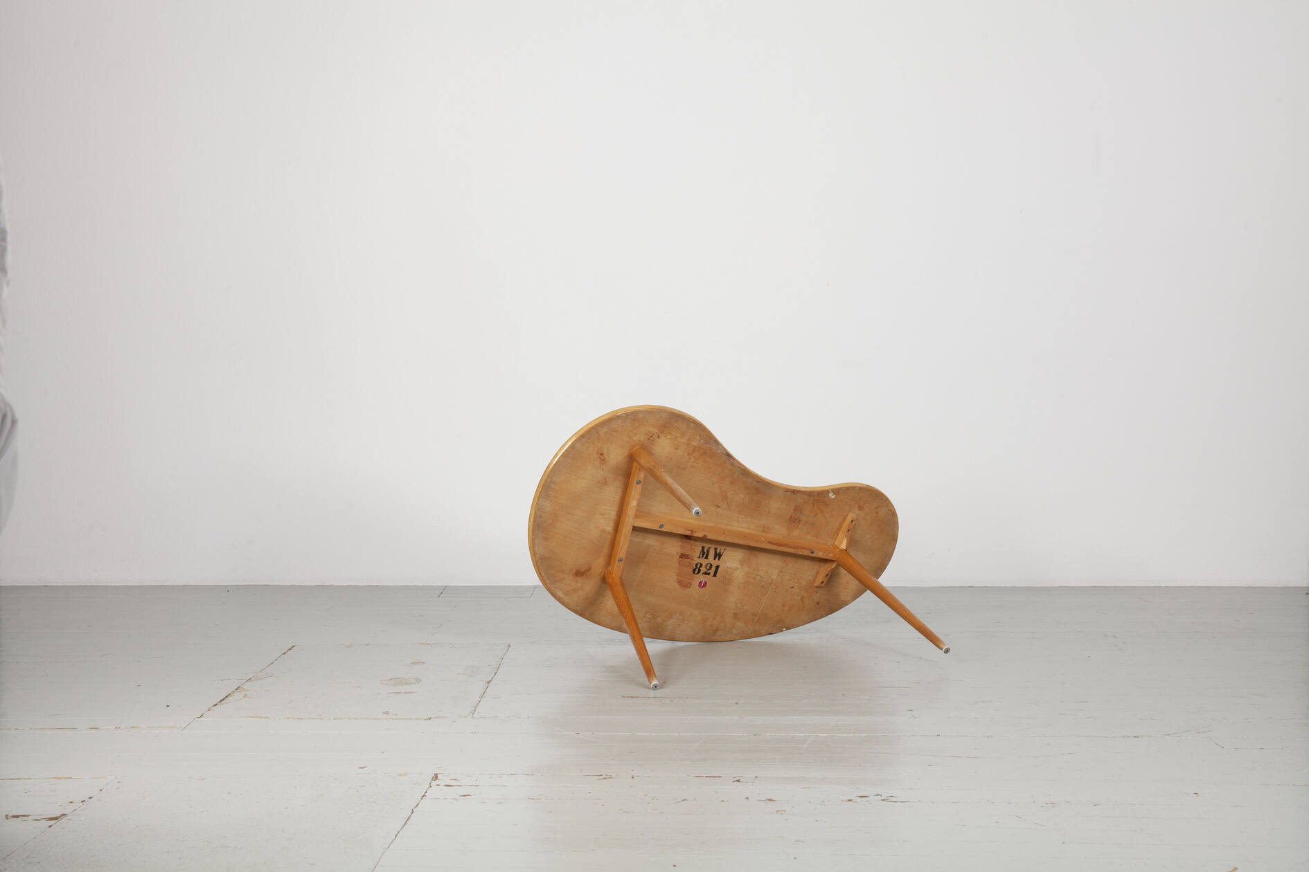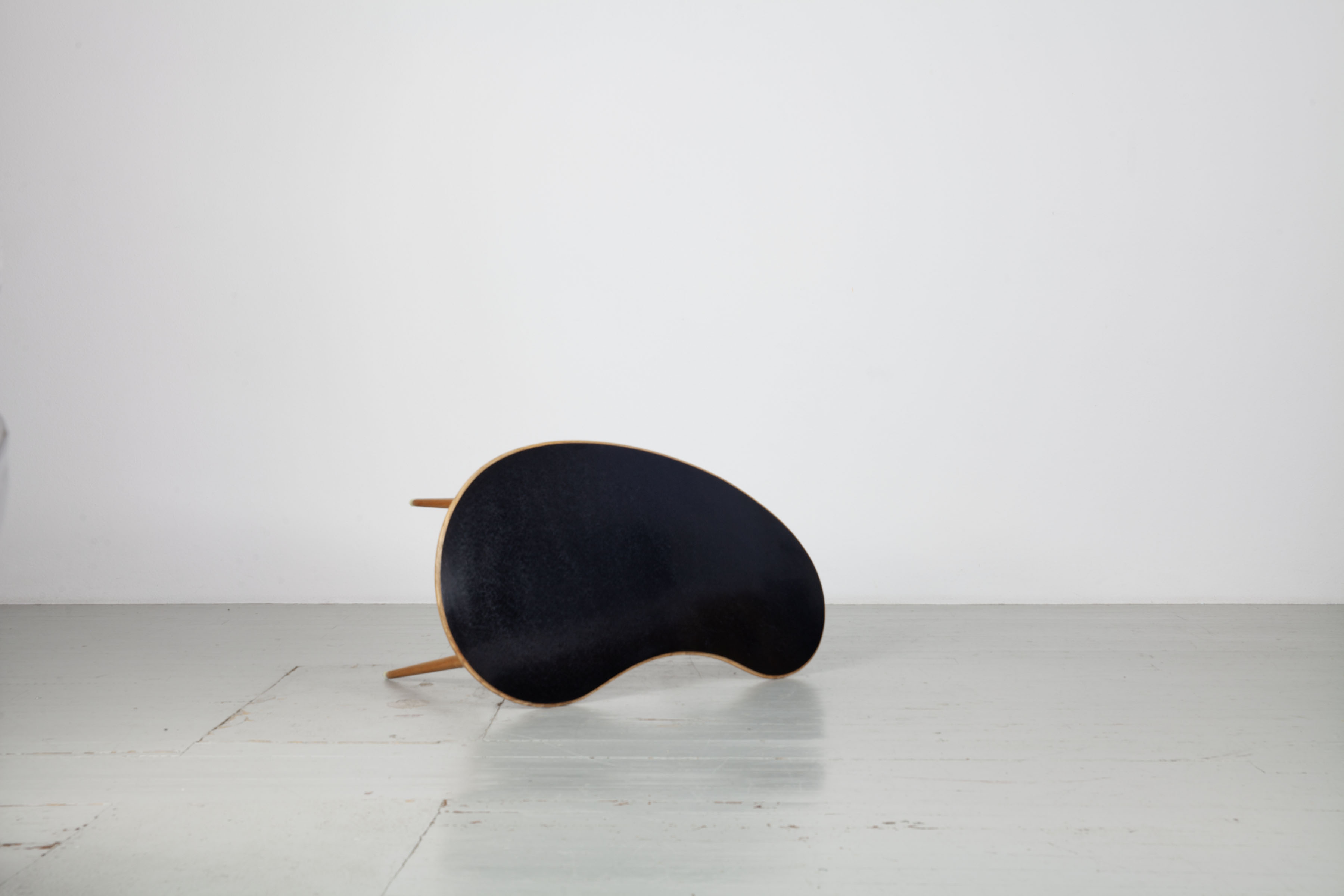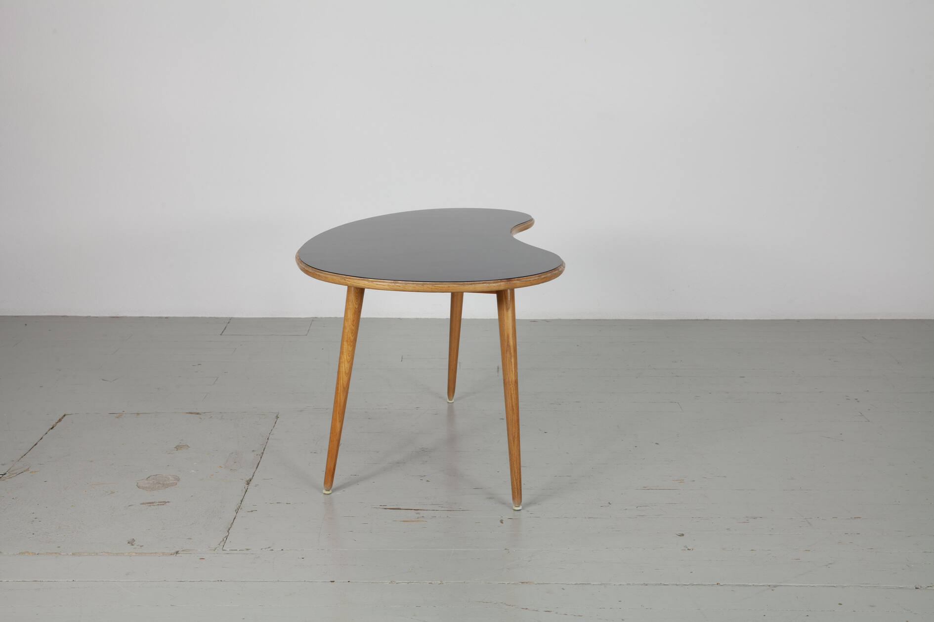 Large, three-legged, kidney-shaped coffee table made of wood with a black Formica surface.