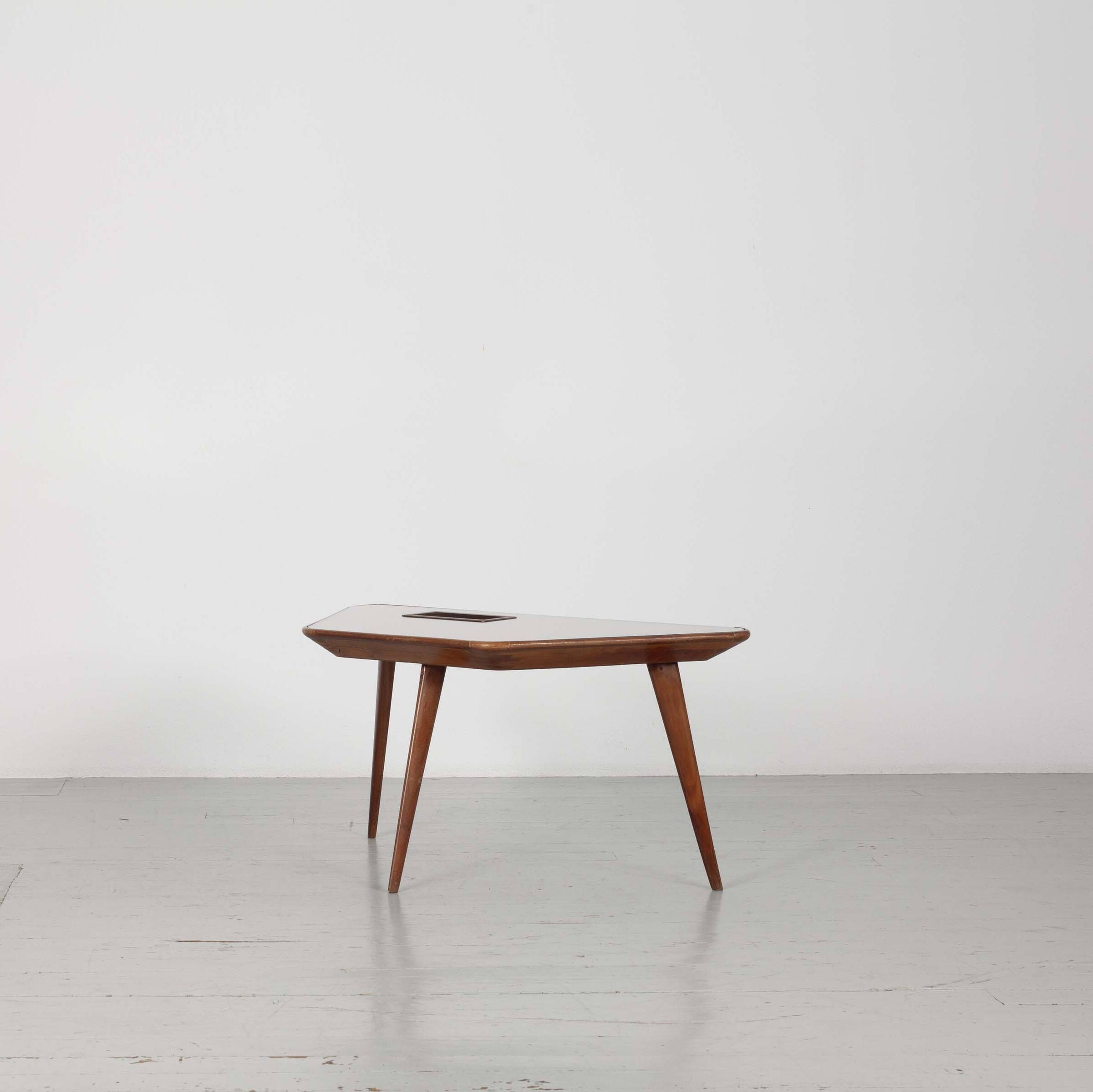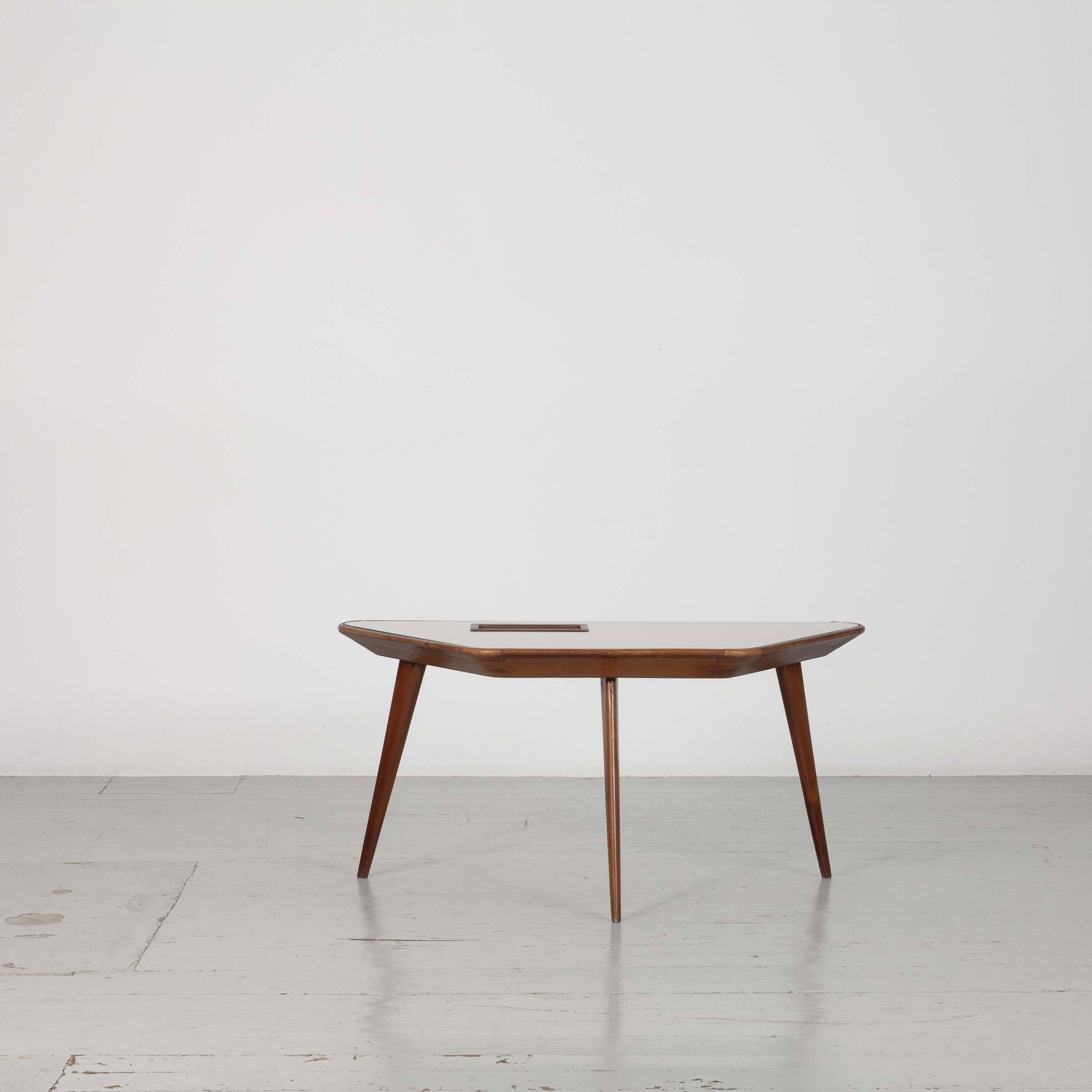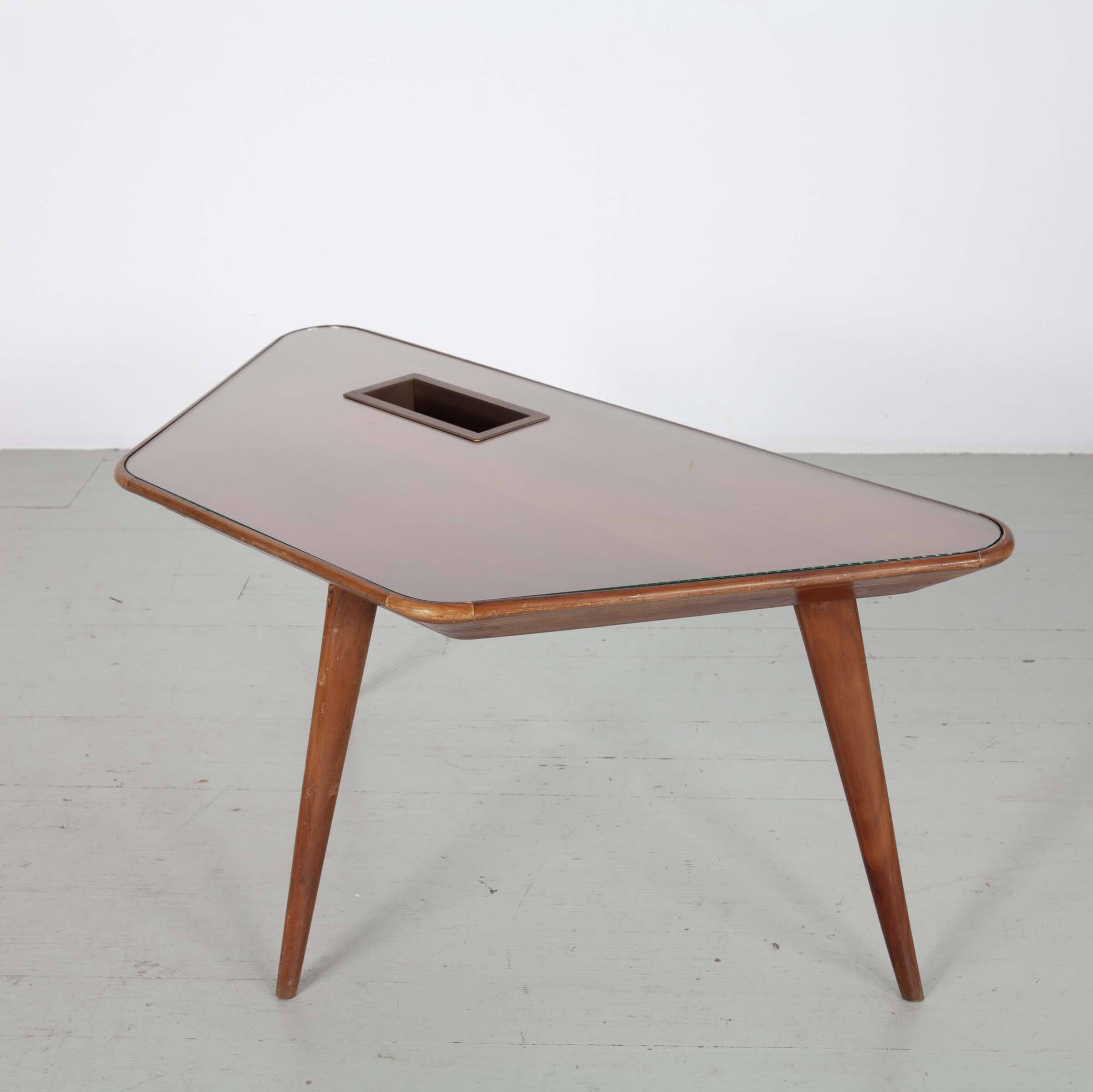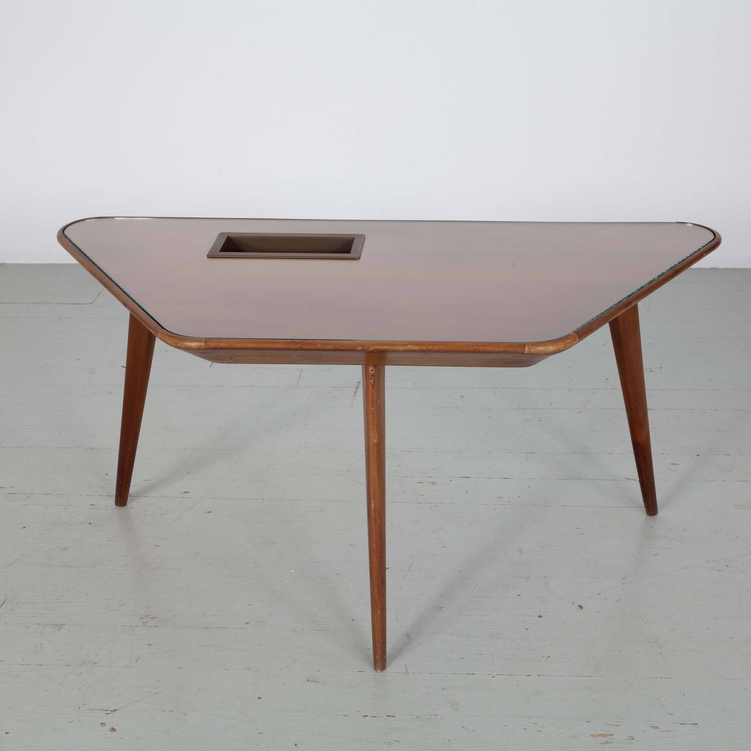 Elegant wooden coffee table from the 1950s, attributed to Gio Ponti. The tabletop features a glass surface with an inset copper bowl.