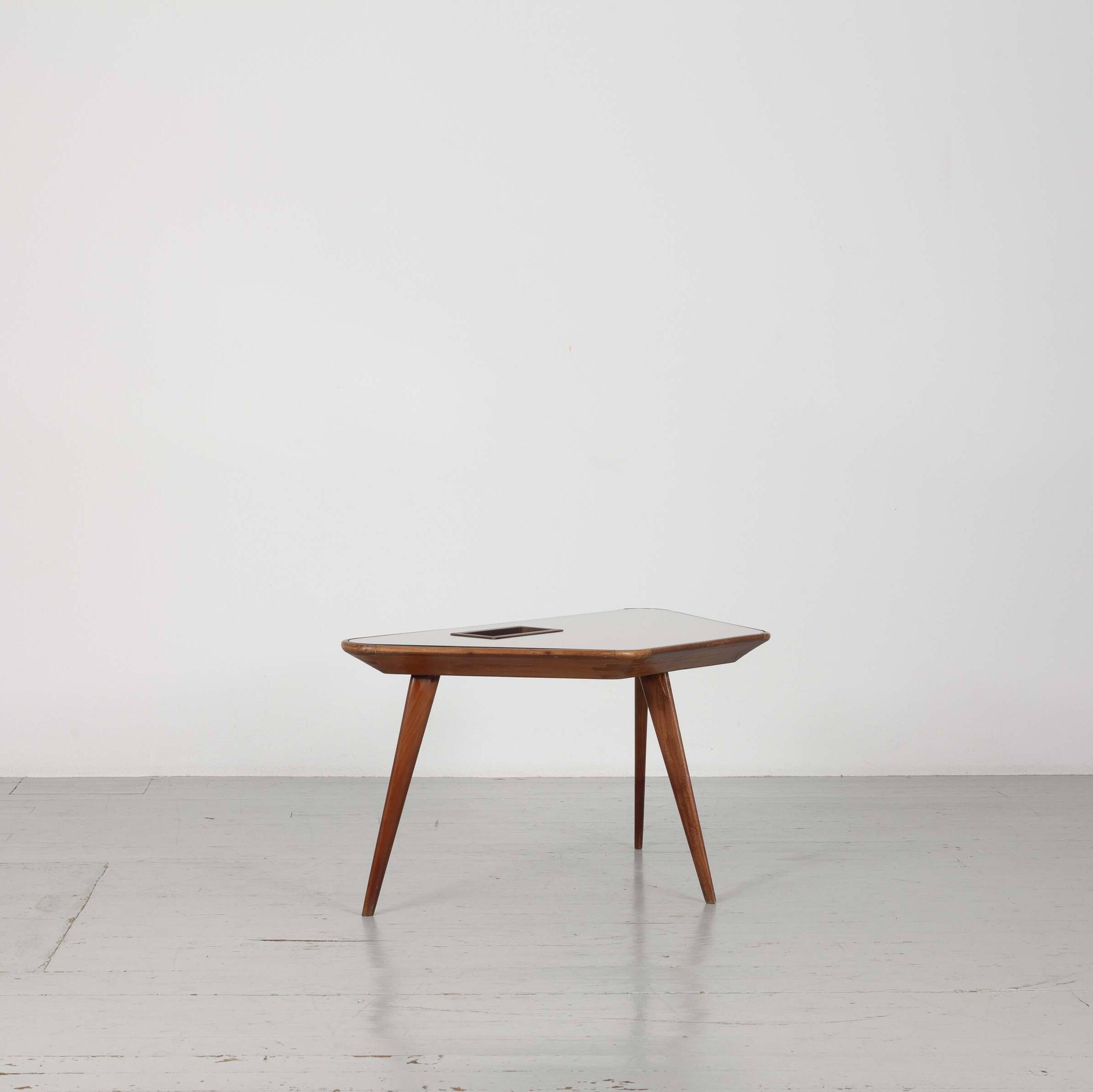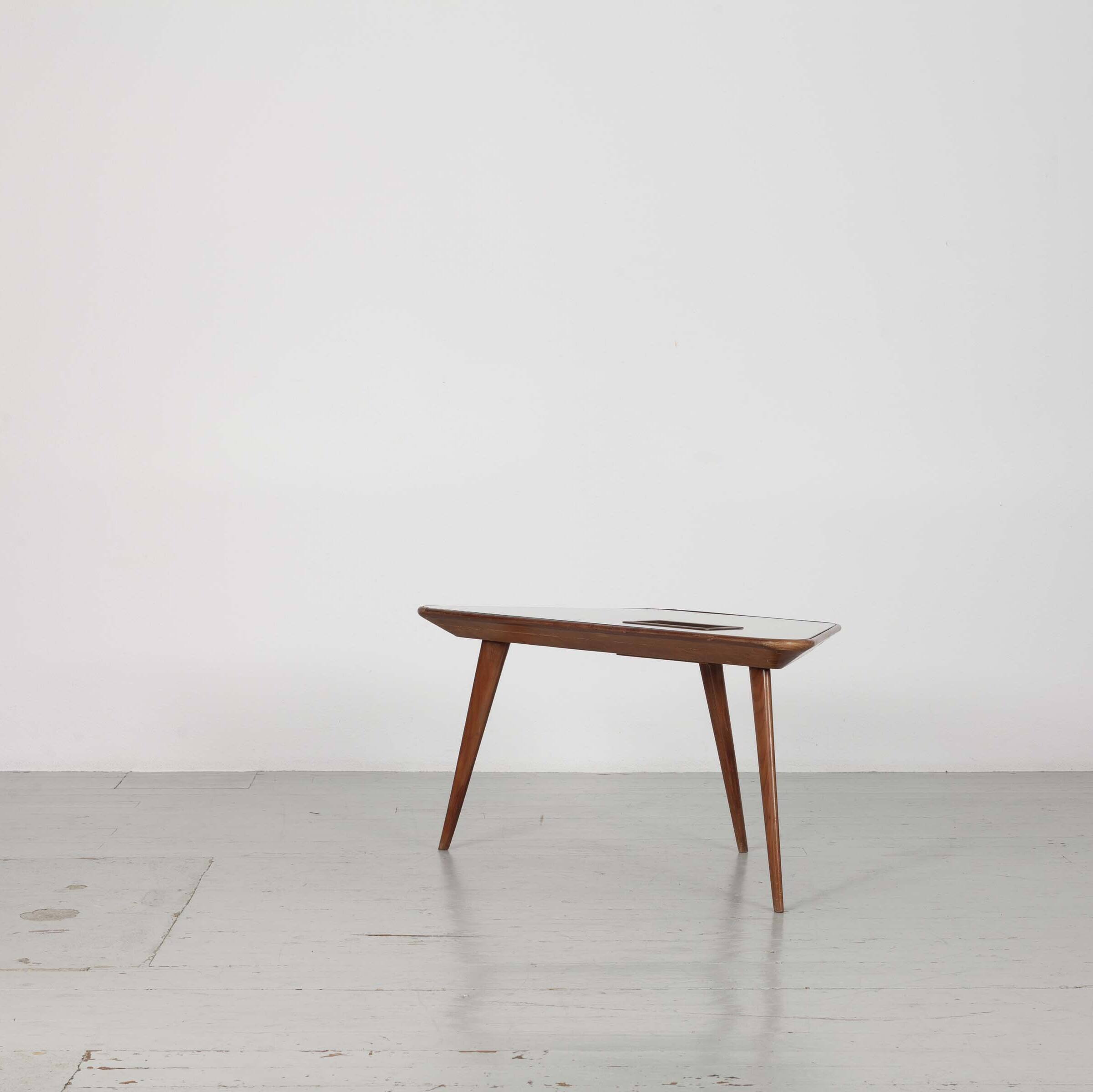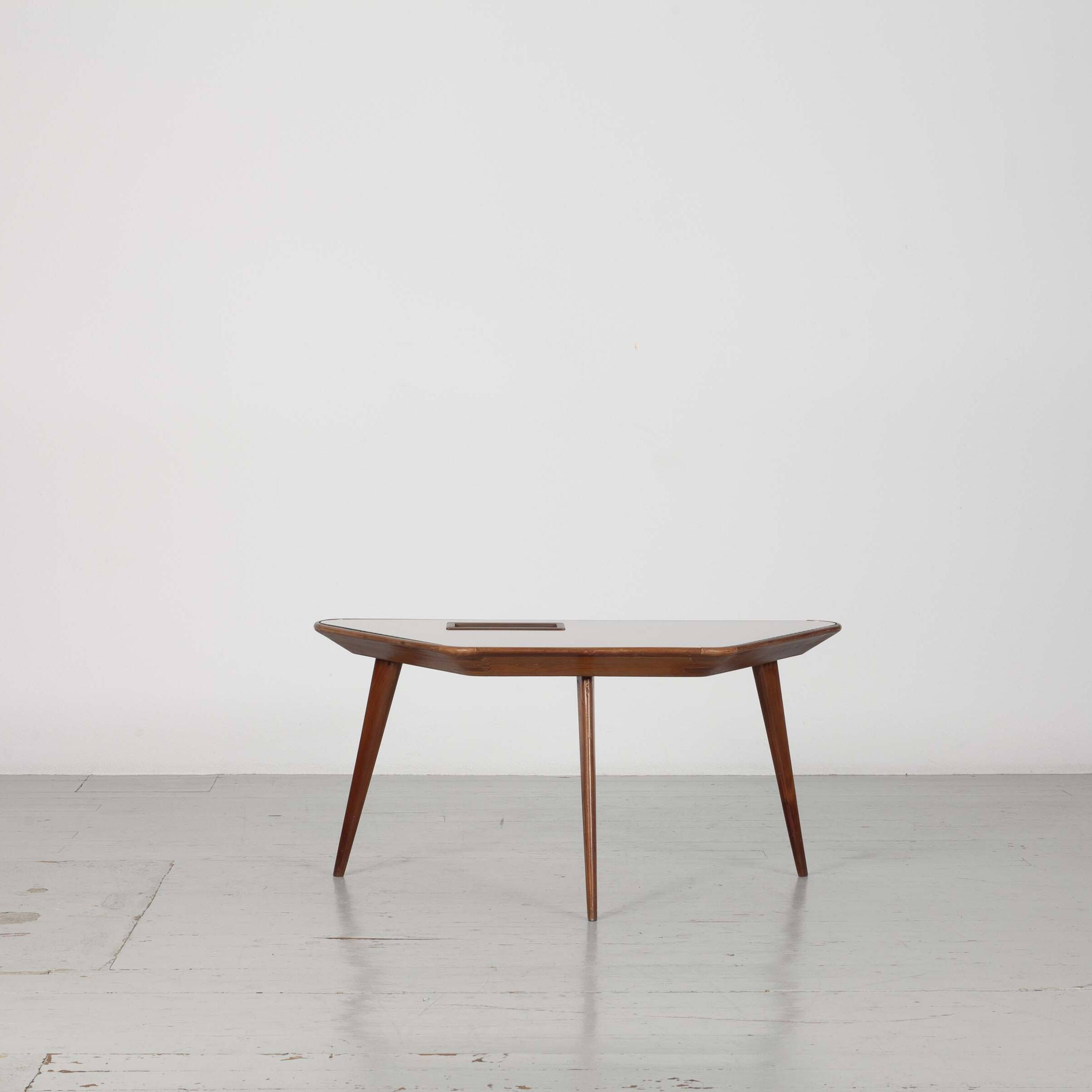 Elegant wooden coffee table from the 1950s, attributed to Gio Ponti. The tabletop features a glass surface with an inset copper bowl.