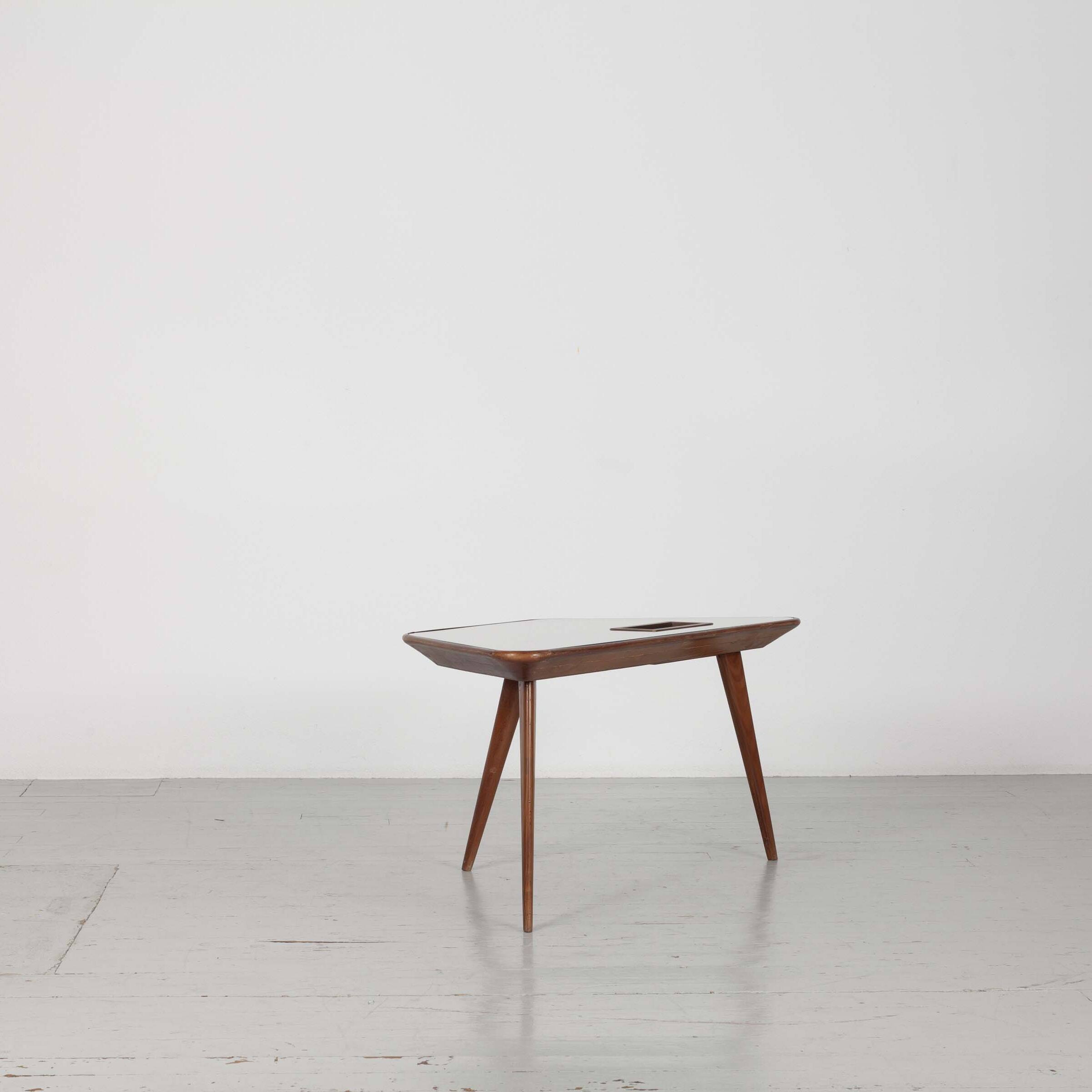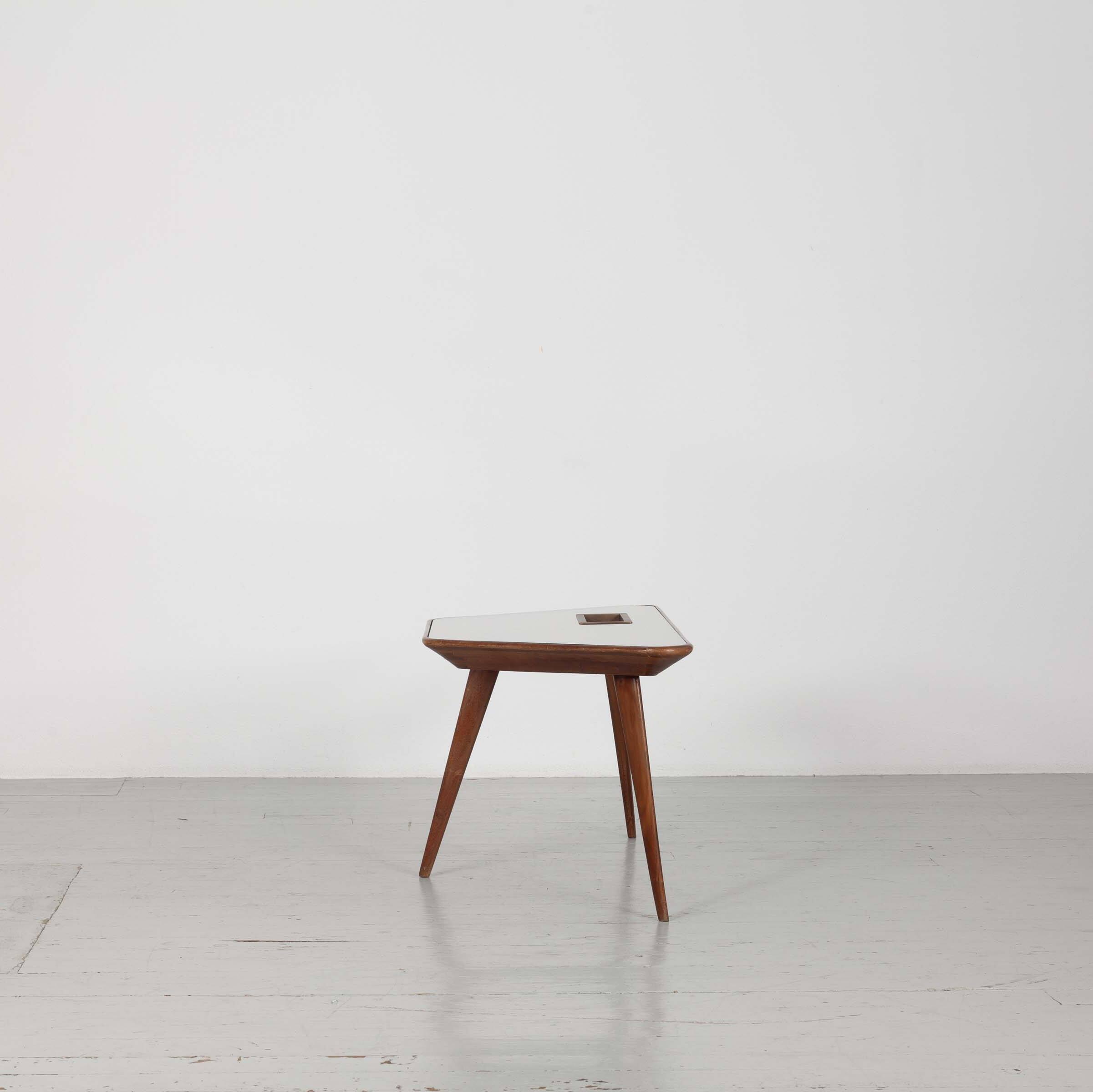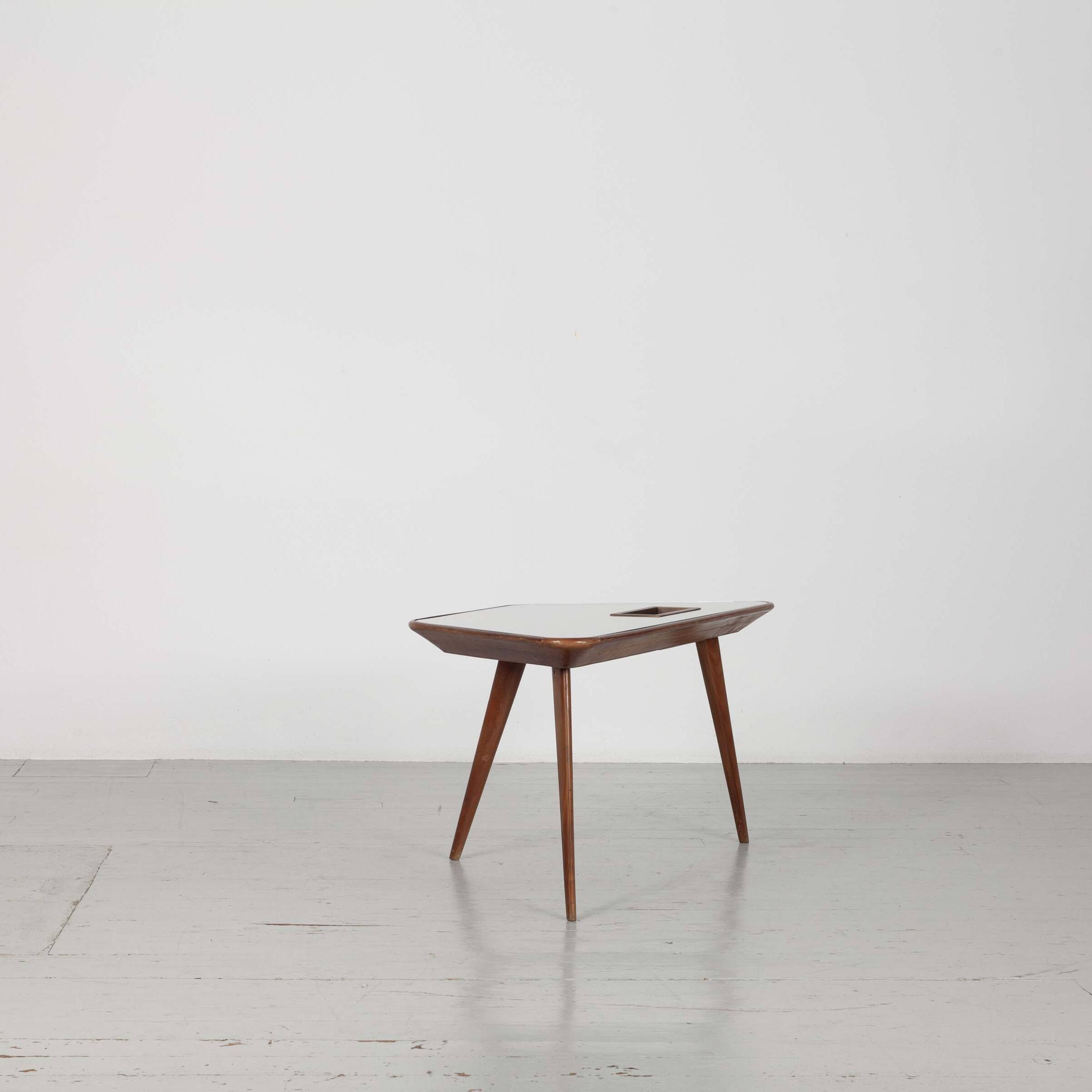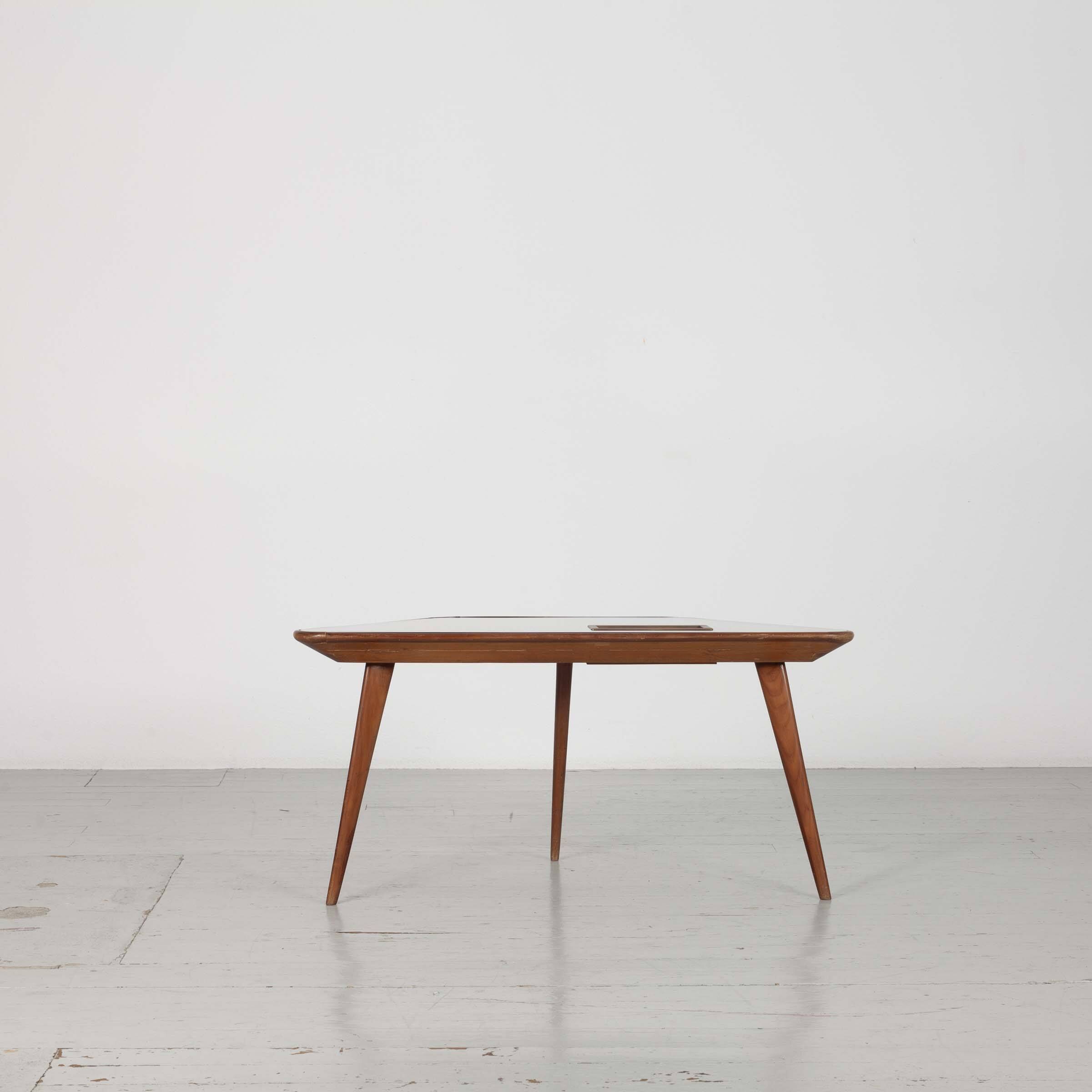 Elegant wooden coffee table from the 1950s, attributed to Gio Ponti. The tabletop features a glass surface with an inset copper bowl.