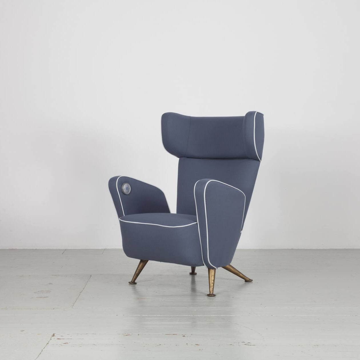 Armlehnsessel aus dem 1. Klasse-Abteil des 'ETR 300 Settebello'-Schnellzuges, der 1952 in Dienst gestellt wurde. Die exklusive und luxuriöse Innenausstattung stammte aus der Feder von Gio Ponti und Giulio Minoletti.